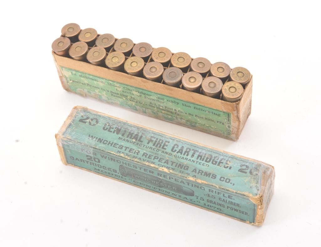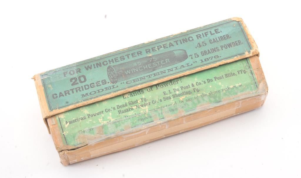 Winchester .45-75 caliber cartridges marked for model "Centennial" 1876 with blue green label matched head stamps. Box tattered and label is about 90% intact. Est.: $300-$600