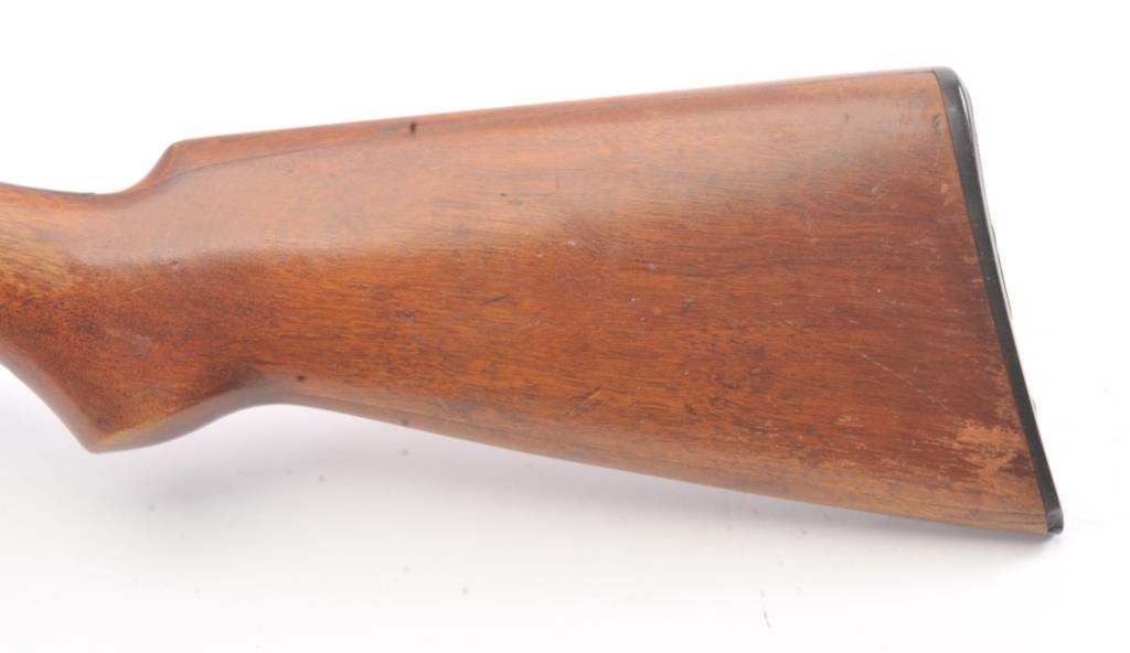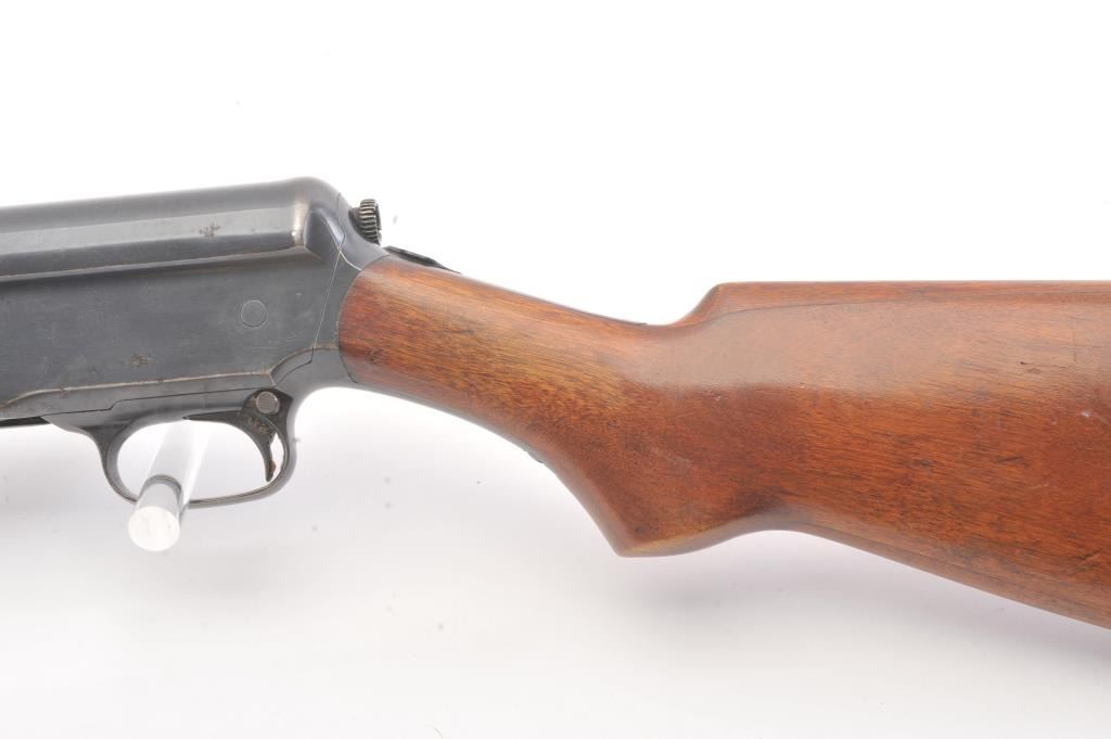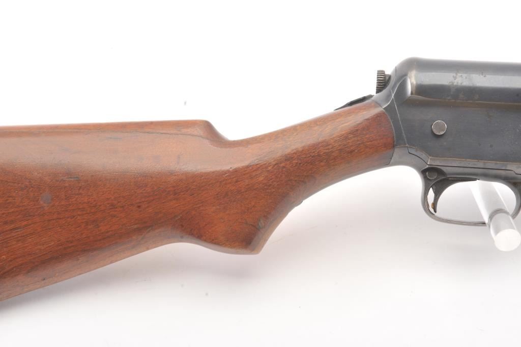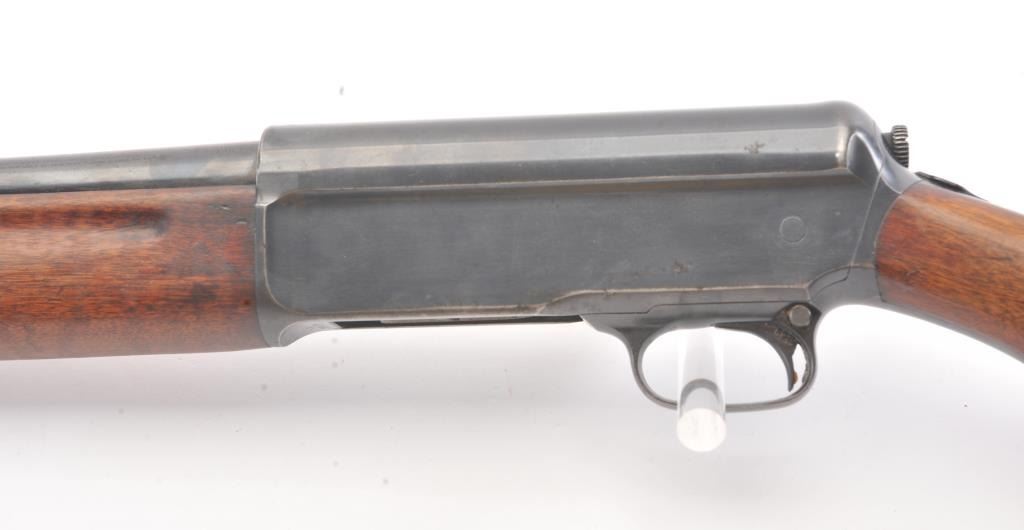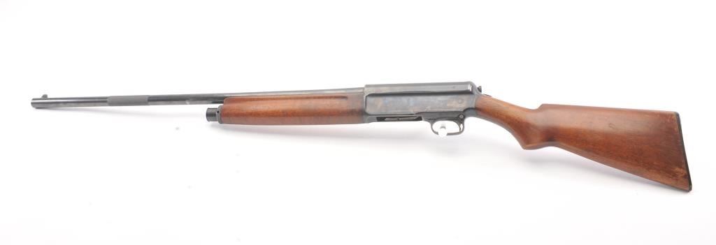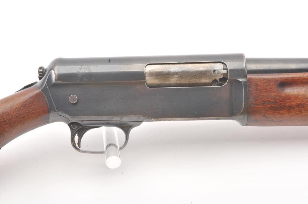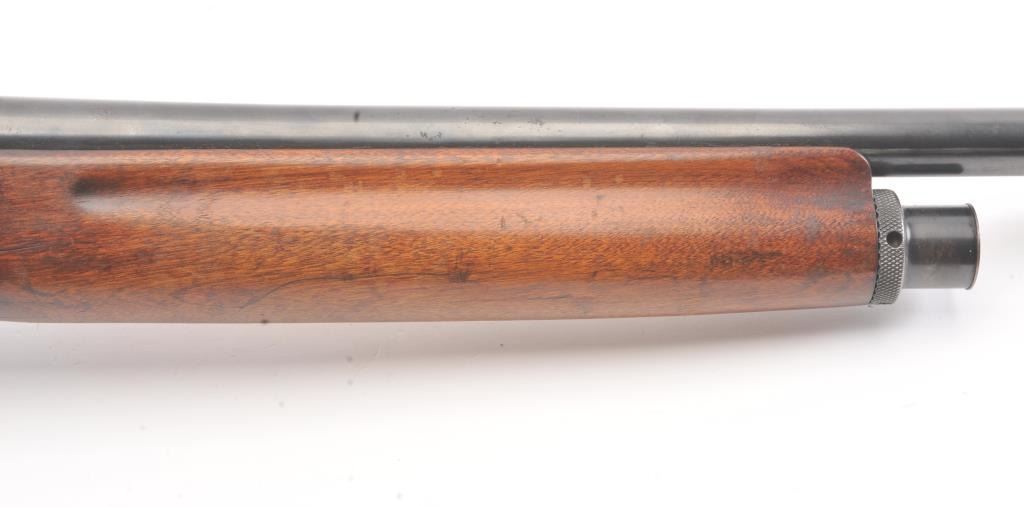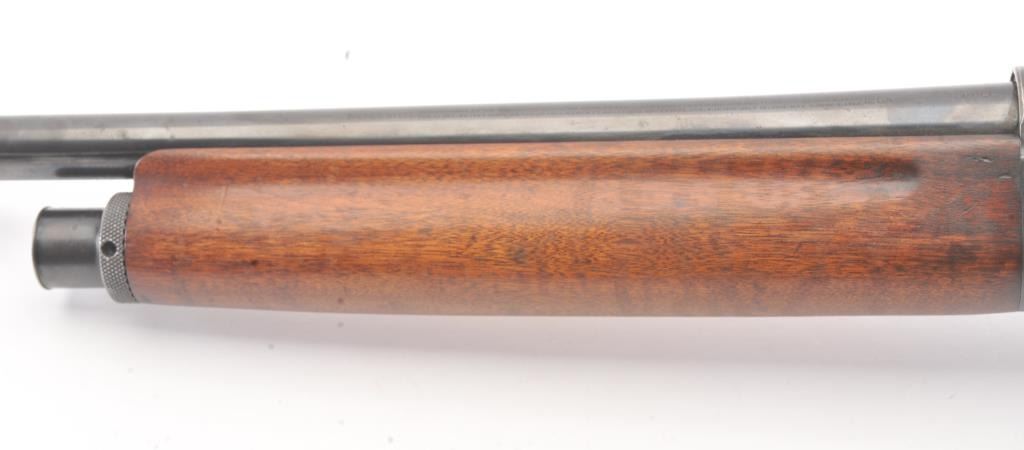 Winchester Model 1911 S.L. (Self Loader) Semi-Auto Shotgun in 12 GA with 28" full choke barrel. In good plus condition with original butt plate, S/N A30473. 75%-85% original blue remains with crisp edges andgood markings. The stock shows cracks from tang to butt plate on each side from recoil into tang (A design flaw). Bore is bright and the action works well. (C&R) Est.: $300-$600