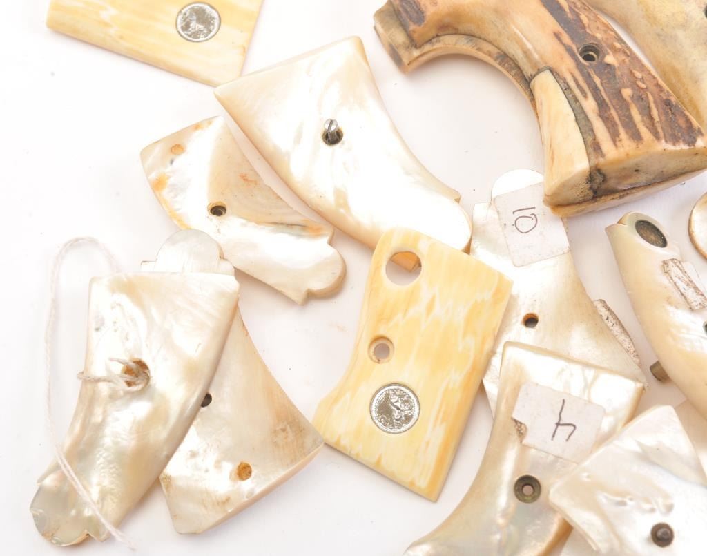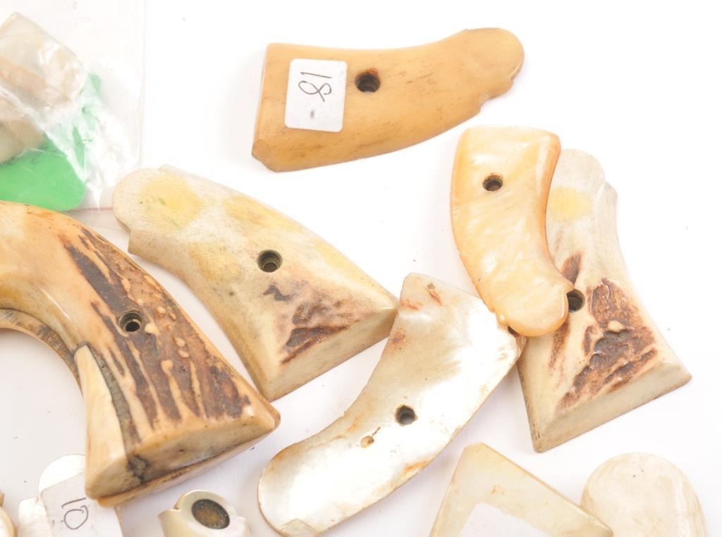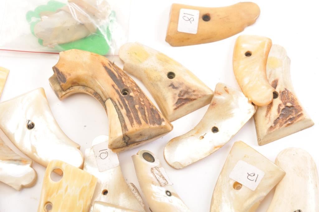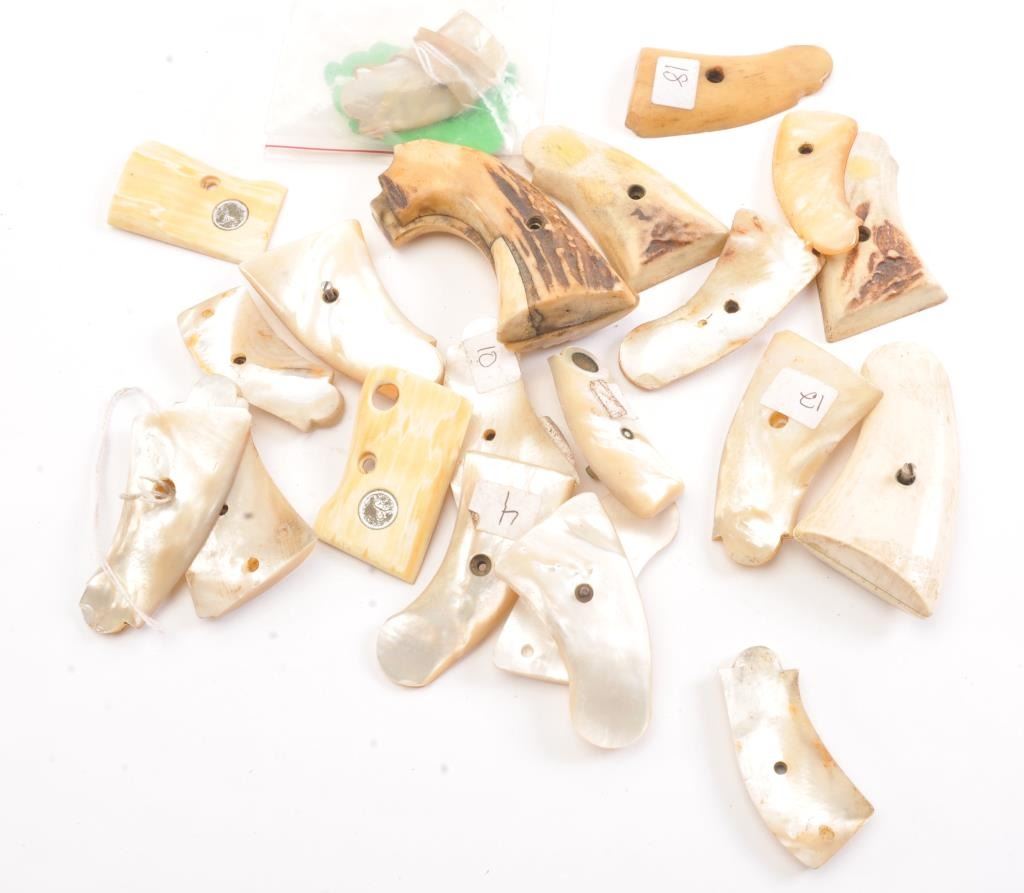 Bonanza lot of grips as described: 1. Pair of old yellow stags for Pre-War Bisley. Repaired. Fair to good. 2. Pair of medallion ivories for Colt .25 “Junior” Circa 1960s.3. Pearls for 4th or 5th Model S&W “New Departure” lemon squeezer 4. 3 Medium Frame revolver pearl grips. Pre-War to 50s. Good plus 5. 7 Single pearl grips for medium framerevolver. 6. Pair of unfinished stags for medium frame Smith 7. Pair of bone grips for medium frame Colt revolver. Army Special or Officer’s Model.Unfinished. 8. 2 unidentified bone grips for small to medium frame revolver. Est.: $300-$600