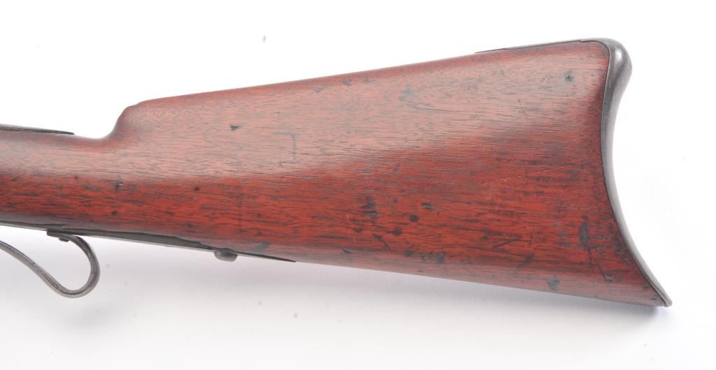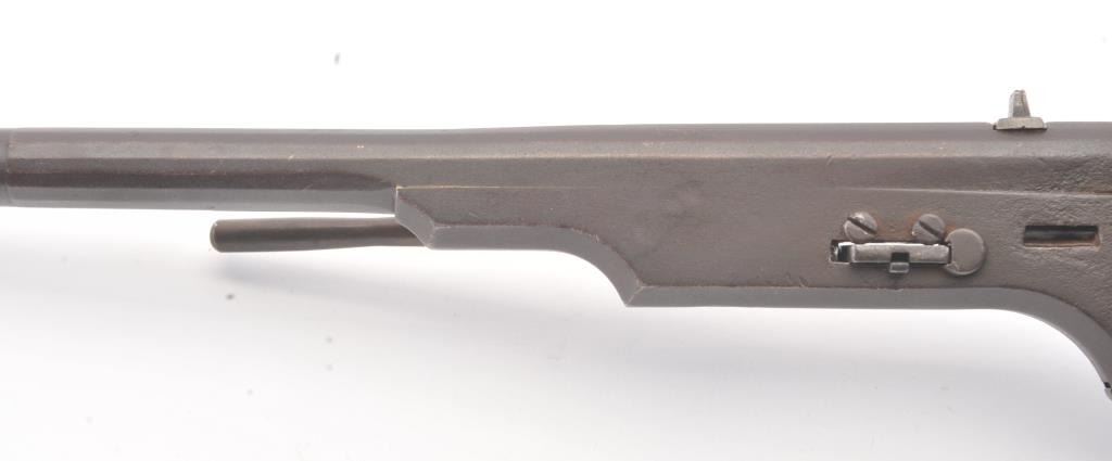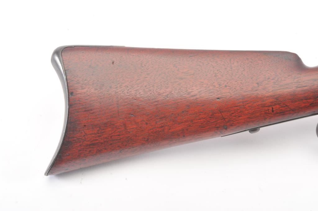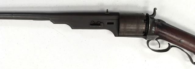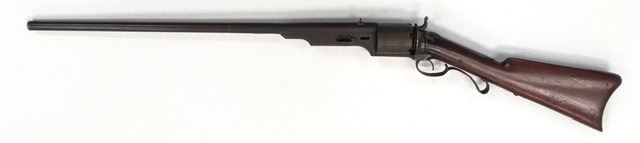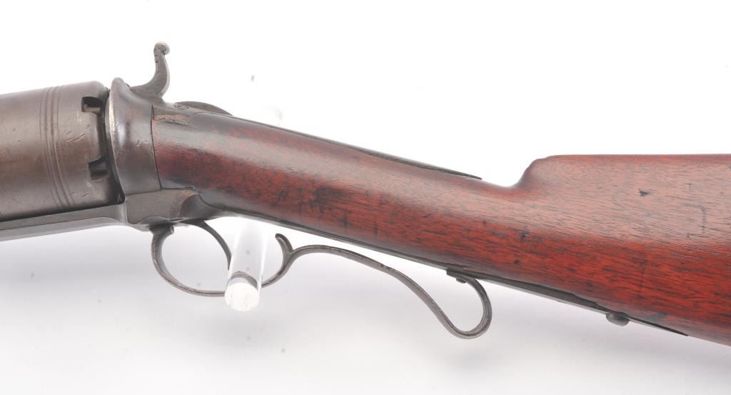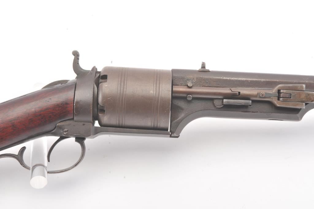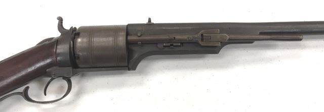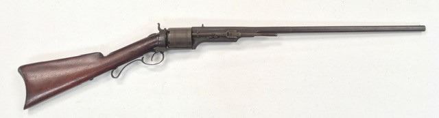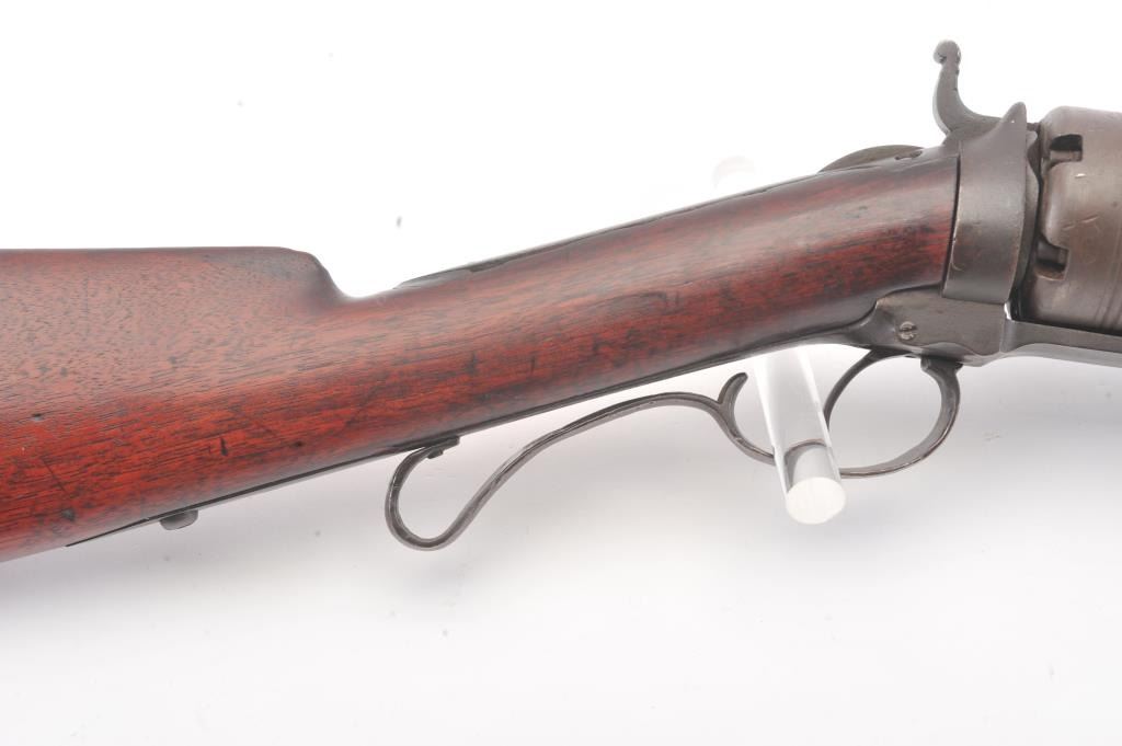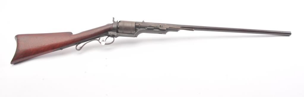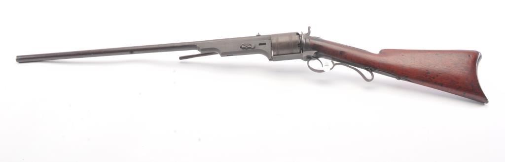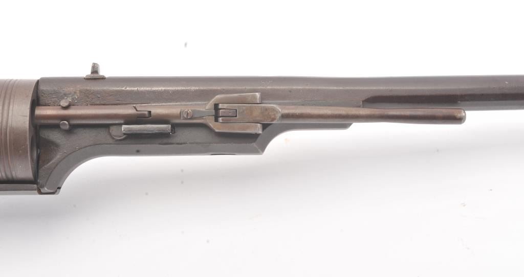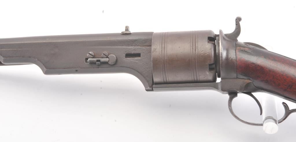Colt Model 1839 Paterson Revolving Carbine in .52 caliber, S/N 122 with a 24" barrel formerly Paul Sorrell collection and recently diassecioned from a major N.W. Coast Paterson Collection. This carbine shows agood address beneath the correct style loading lever. Good to very good overall condition showing some minor losses of wood around the tang, minor cleaning and restorations but generally very good overalland in desirable early range and configuration that may have been purchased by the state of Texas or used in Seminole wars. The stock shows light refinishing and a chip of wood is missing by the top right side ofthe frame. A strong 7 on a 1-10 scale formerly in 2 stellar Paterson collections. (Antique) Est.: $17,500-$35,000