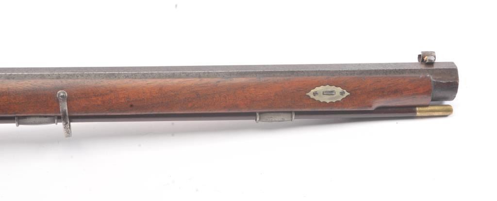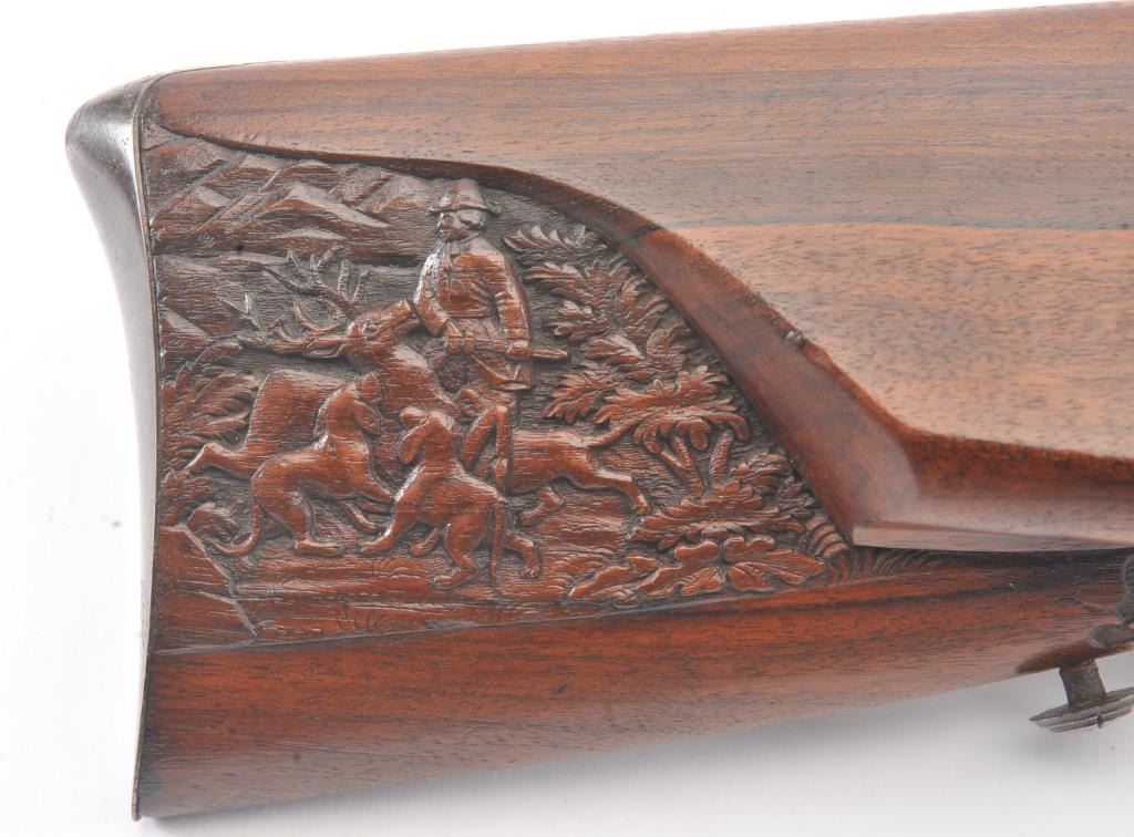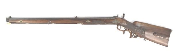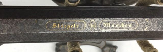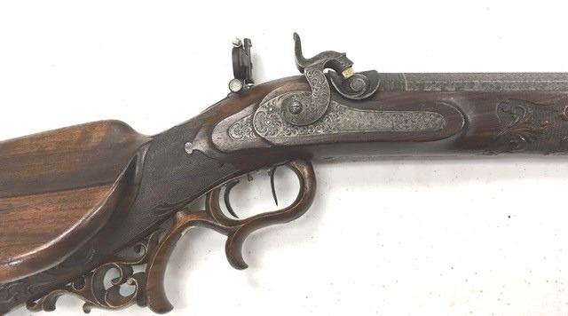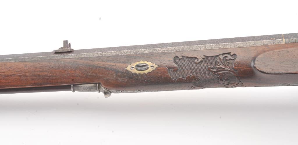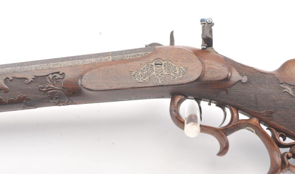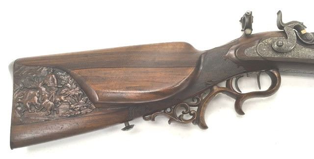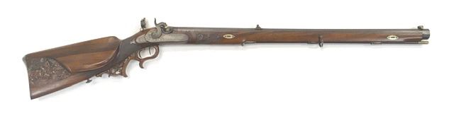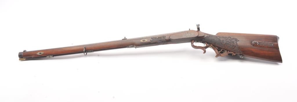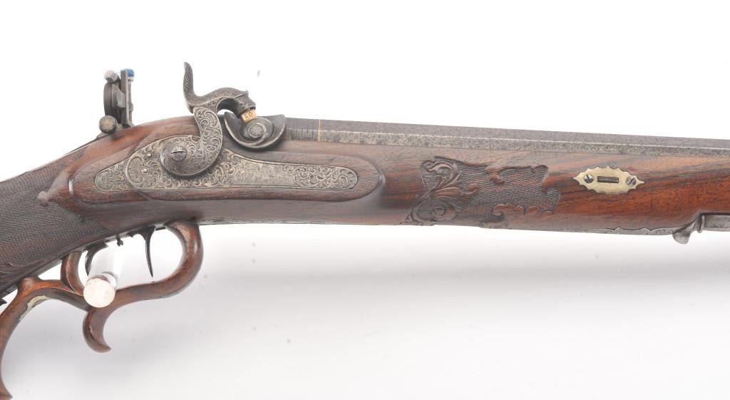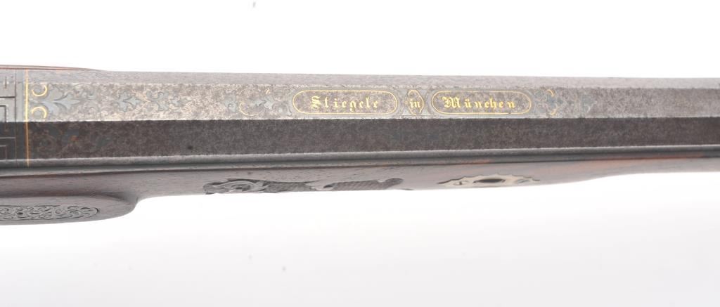 Exceptional German high art percussion target rifle signed in gold on the barrels "Stiegele in Munchen". Considered one of the premier makers of the 19th century Stiegele was in the same top tier as Miller and ValGries, Springer in Wien, and ____________. The rifle shows ornately scroll engraved lock and mounts, silver and gold inlay breech, raised carved stocks, pierced and carved trigger guard, checkered patch box and foreend. The barrel is damascened and also silver scrolls at the muzzle. Target and peep sights. Measures 44 1/2" overall with a 29" barrel in .36 caliber percussion with rifled barrel and semi-false or inset muzzle forbullet starting. Good to very good overall with gray patina finish and normal aging and minor erosion. Good action and set triggers working. Horn fore end cap is missing at the front of the stock. (Antique) Est.:$2500-$5000
