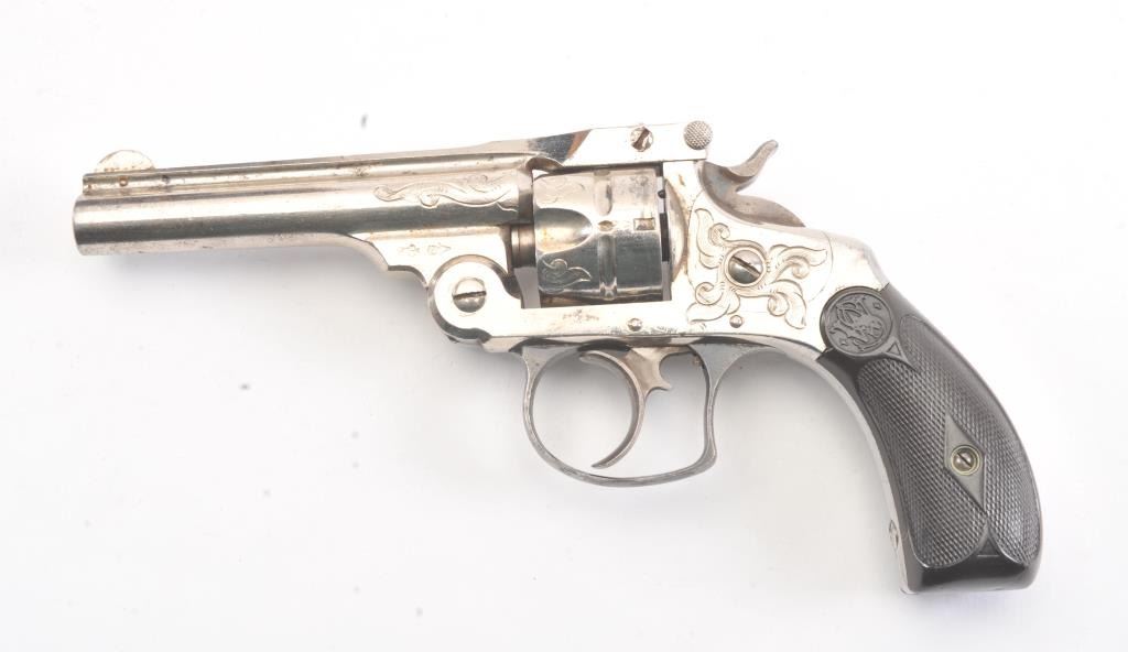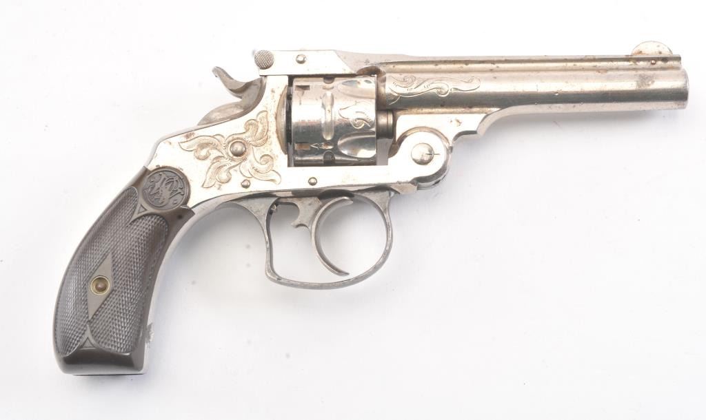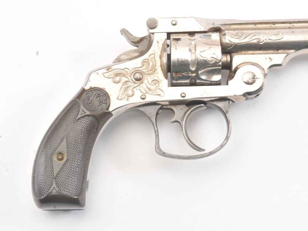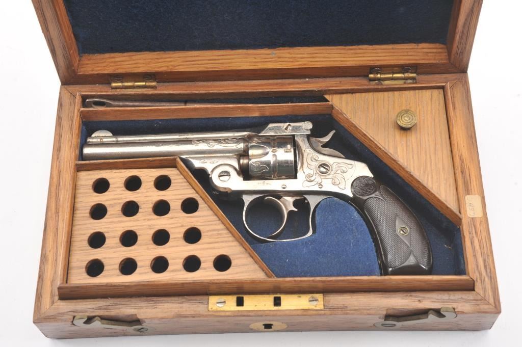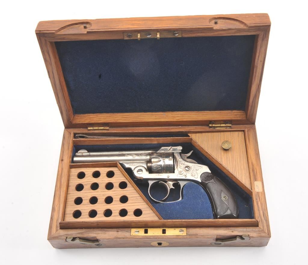 Early Smith & Wesson Double Action 2nd model Revolver in .32 caliber with scroll engraving, nickel plated with hard rubber grips showing British proofs and English style oak casing, S/N 17327. Circa early1880s. The engraving is the style attributed to New York agents such as Robinson and Hartley and Graham. 85%-95% original nickel with some natural aging and loss. 80%-90% blue on the trigger guard with 60%-80% casecolors on the hammer and trigger. The grips show minor edge wear. The action is good and the bore is only fair but may clean. The box is very good plus missing circular plate at the center. (Antique) Est.: $750-$1500