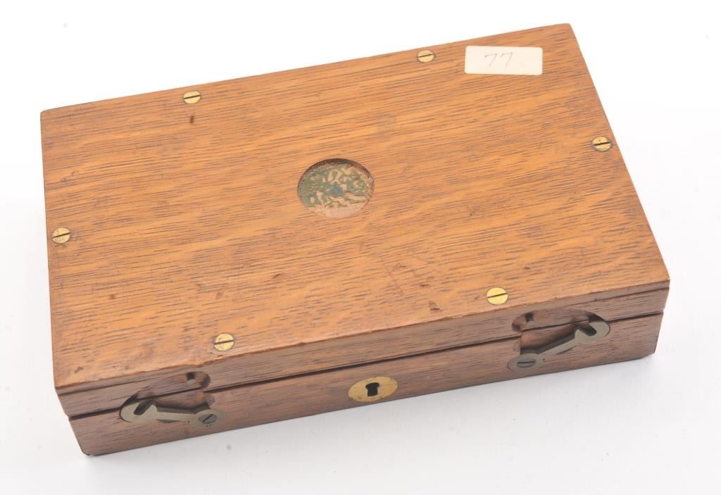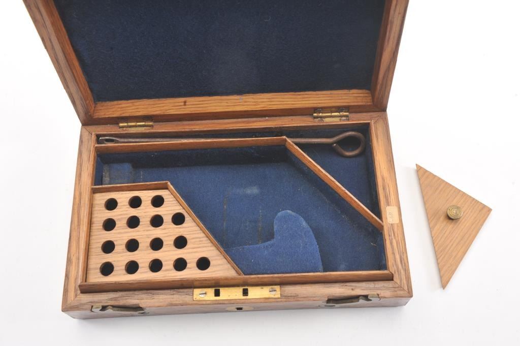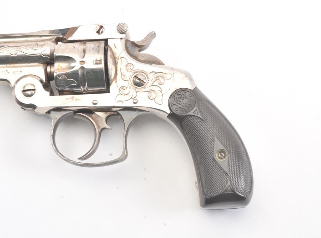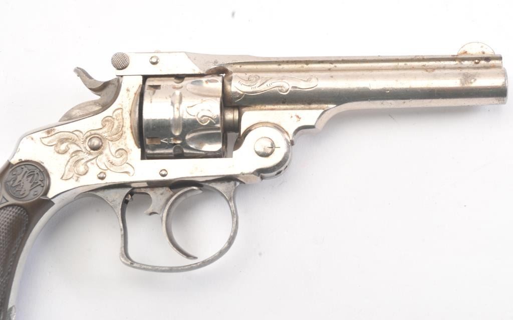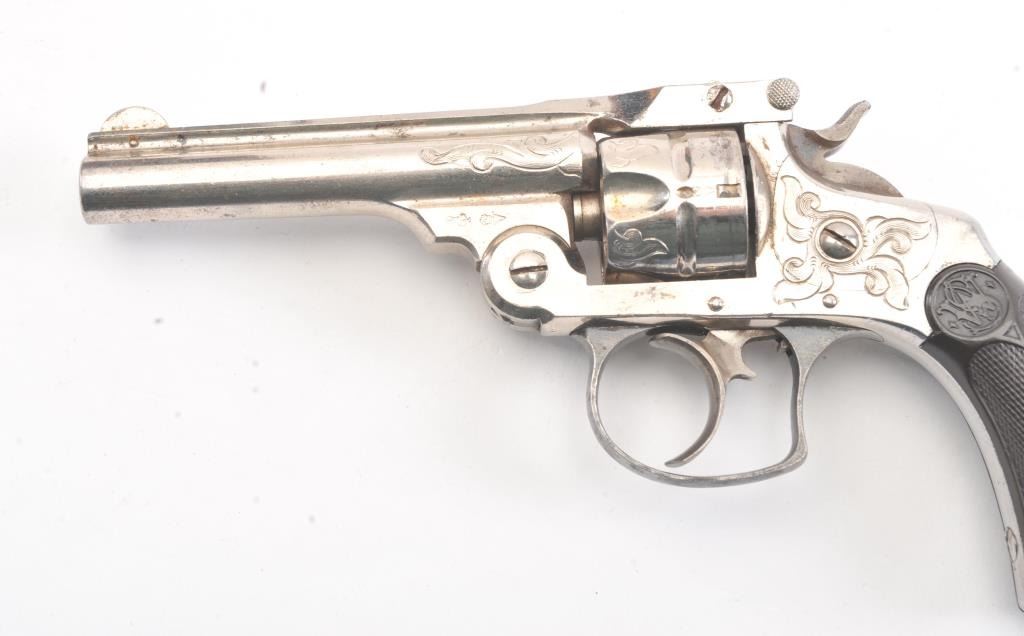 Early Smith & Wesson Double Action 2nd model Revolver in .32 caliber with scroll engraving, nickel plated with hard rubber grips showing British proofs and English style oak casing, S/N 17327. Circa early1880s. The engraving is the style attributed to New York agents such as Robinson and Hartley and Graham. 85%-95% original nickel with some natural aging and loss. 80%-90% blue on the trigger guard with 60%-80% casecolors on the hammer and trigger. The grips show minor edge wear. The action is good and the bore is only fair but may clean. The box is very good plus missing circular plate at the center. (Antique) Est.: $750-$1500