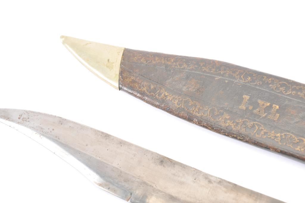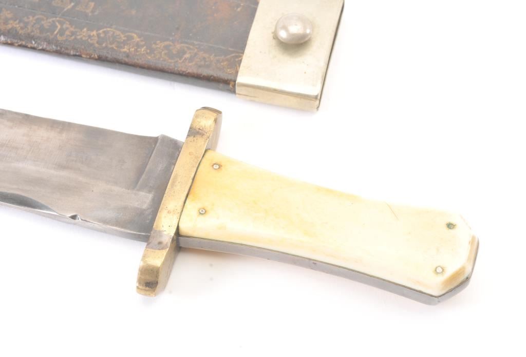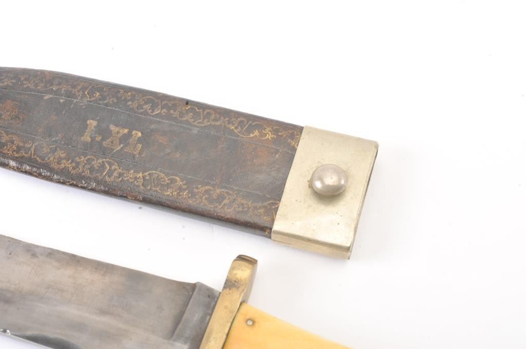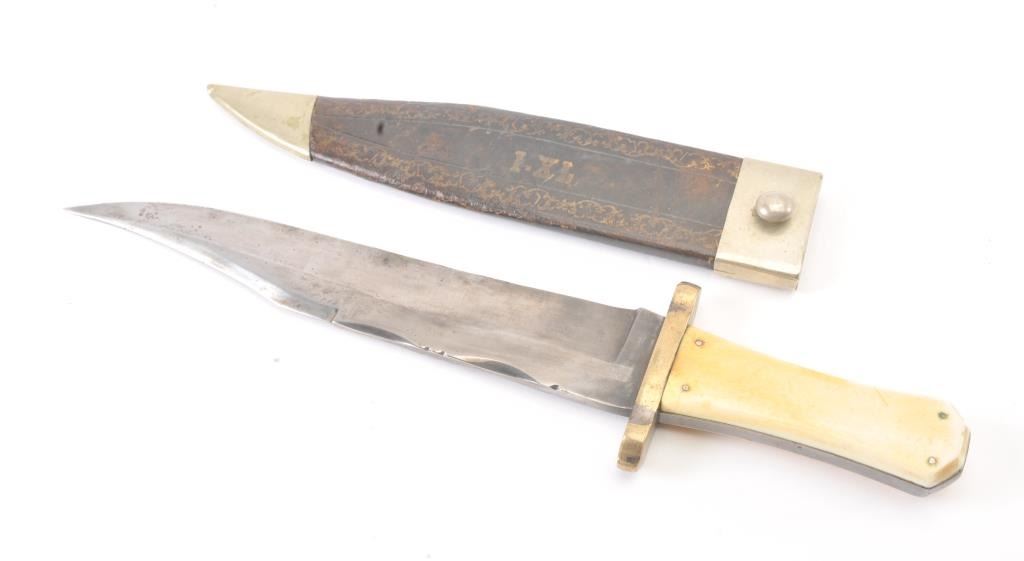 IXL Bowie knife by “George Wostenholdm and Son, Washington Works, Shefield” and shows his trademarks and address. Measures 16” overall with a 11 1/8” blade showing 6 ½” to clipped point. Semi-Coffin shaped hilt withgenuine to the period ivory scales showing mellow patina and age cracking. The blade is good with a little discoloration along with minor pitting and erosion. Original scabbard with 50% gold embossing still showing andvisible “IXL” at the center. The German silver hanger and tip is retained (Minor Dents). Formerly Joseph Musso collection. Est.: $3500-$7000