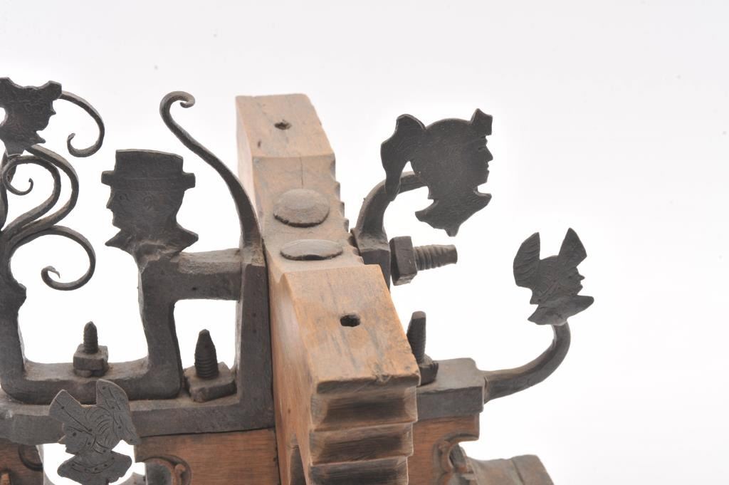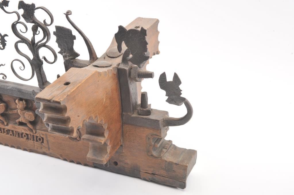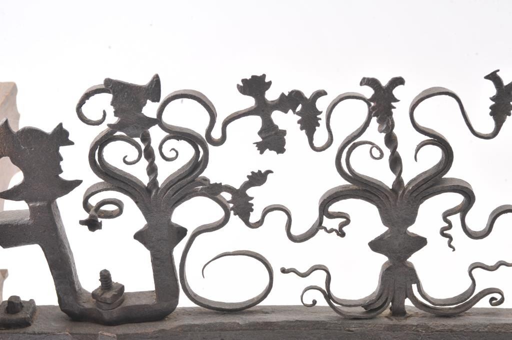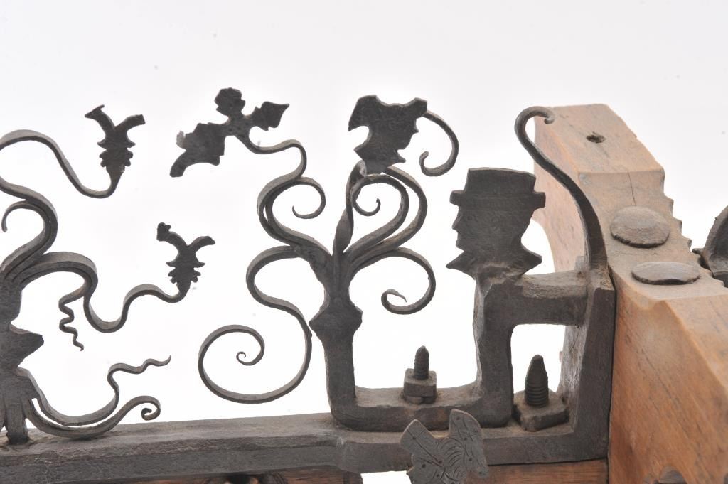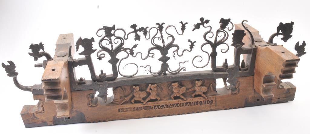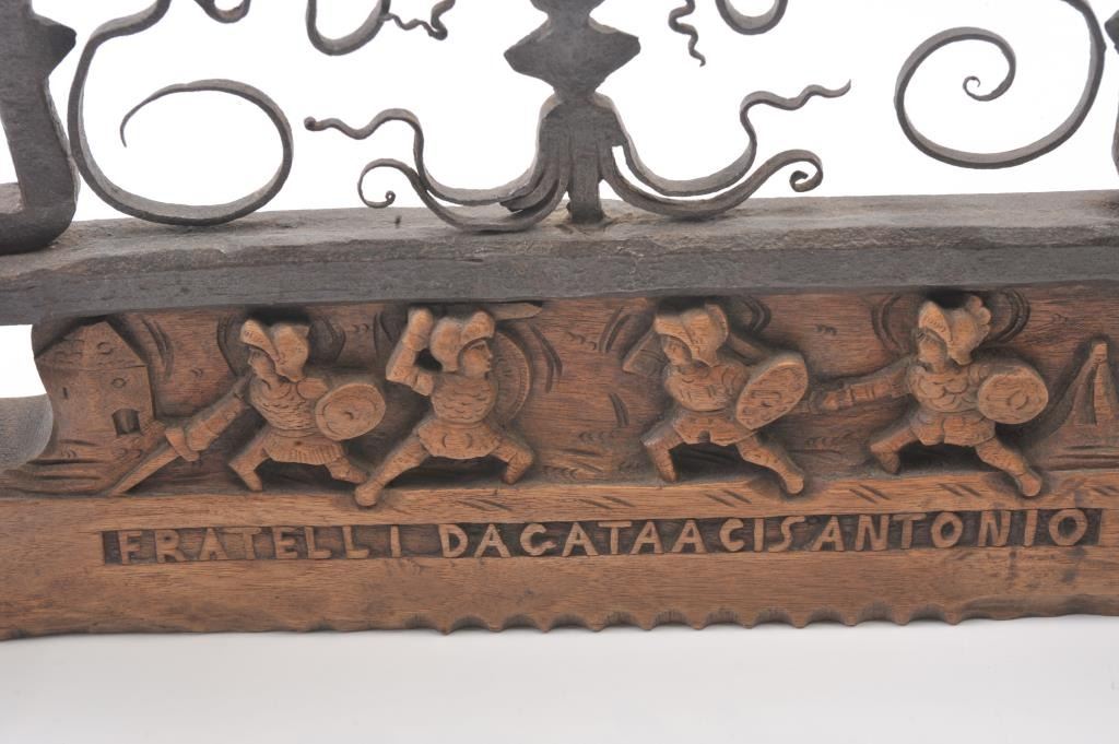 19th Century or Earlier "Gypsy Wagon" Bumper showing ornate wrought iron work in Armoral scenes with carved figures of battling men in armour and the name FRATELLI- DAGATAACI'S-ANTONIO-. Approx. 13" ht by 40"width. Good condition with some surface rust, minor staining and aging, cracks and small losses. The Best of it's type we have ever seen offered for sale at auction as they are scarce and normally not seen with knights orarmour scenes. Provenance Robert B. Berryman-Gunroom, Kerrville, Texas to John R. Gangel. Est:$1500-3000