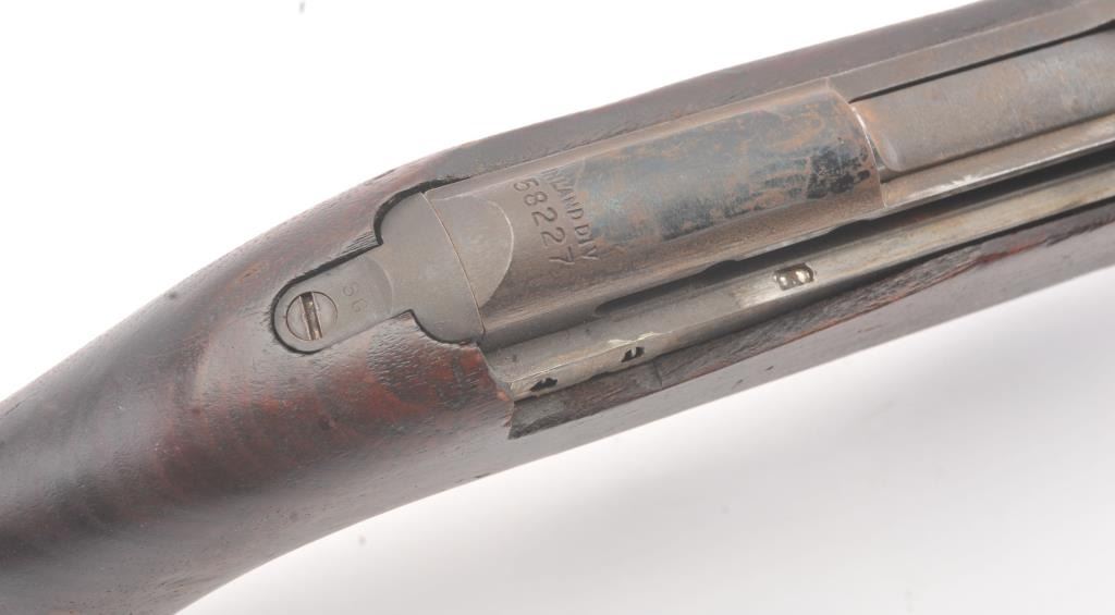 U.S. M1 Carbine by Inland in .30 caliber with “Inland Div. of General Motors” marked barrel dated 9-42. The rear sight has been grounded off including base, fore end flattened and front sight altered by L.B.Police officer in the 1950s for tactical use in field. No import marks. Good mechanically with bright bore. Coating of storage rust and dirt from estate. Good early parts. (C&R) Est.: $400-$800