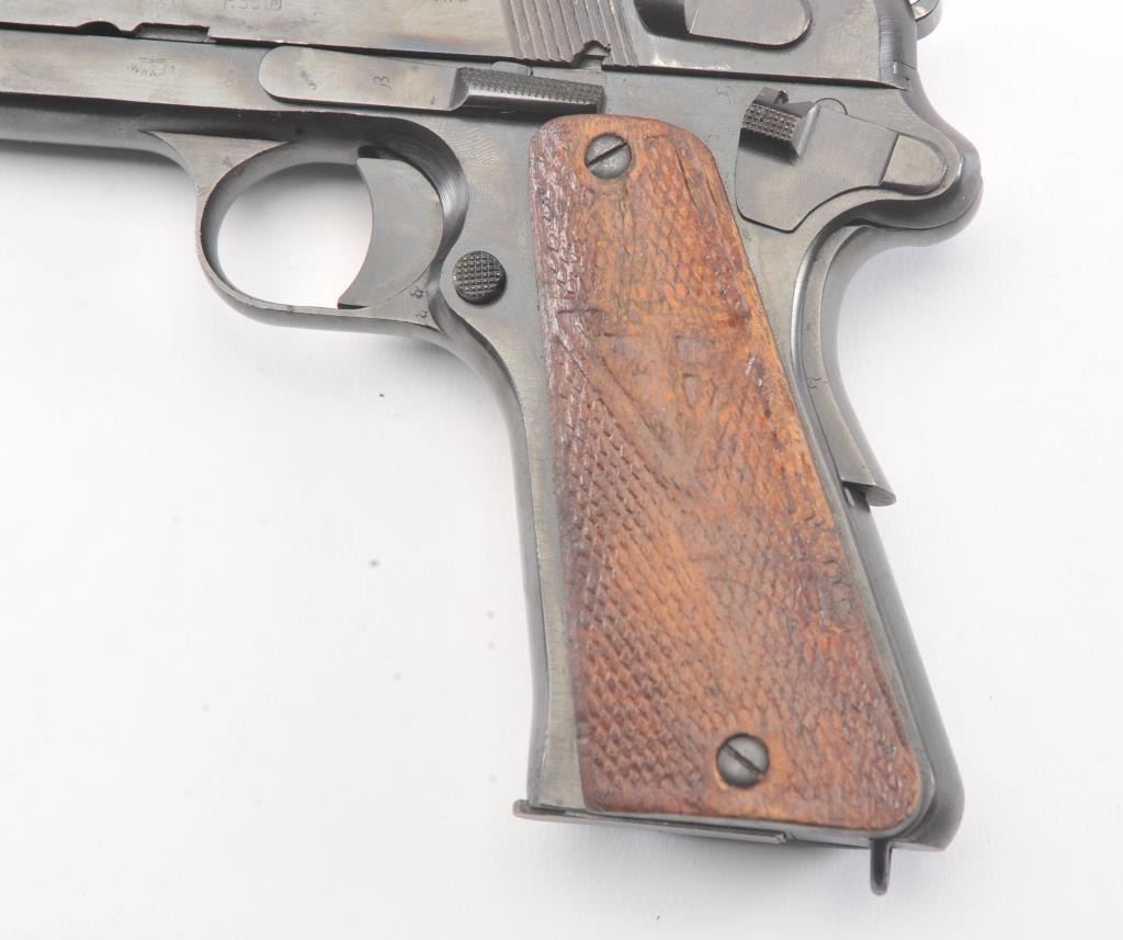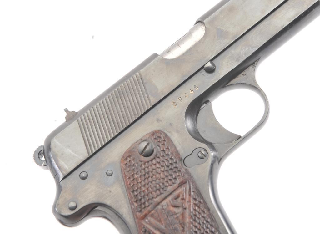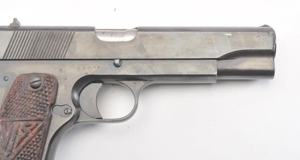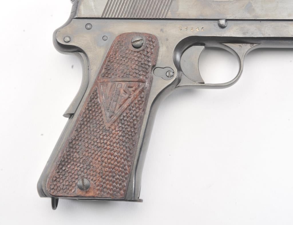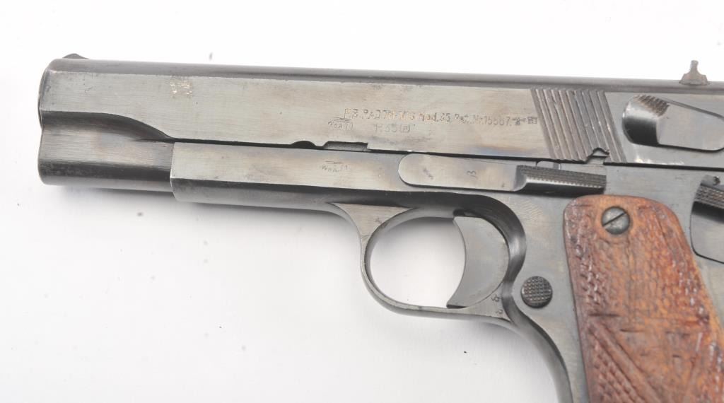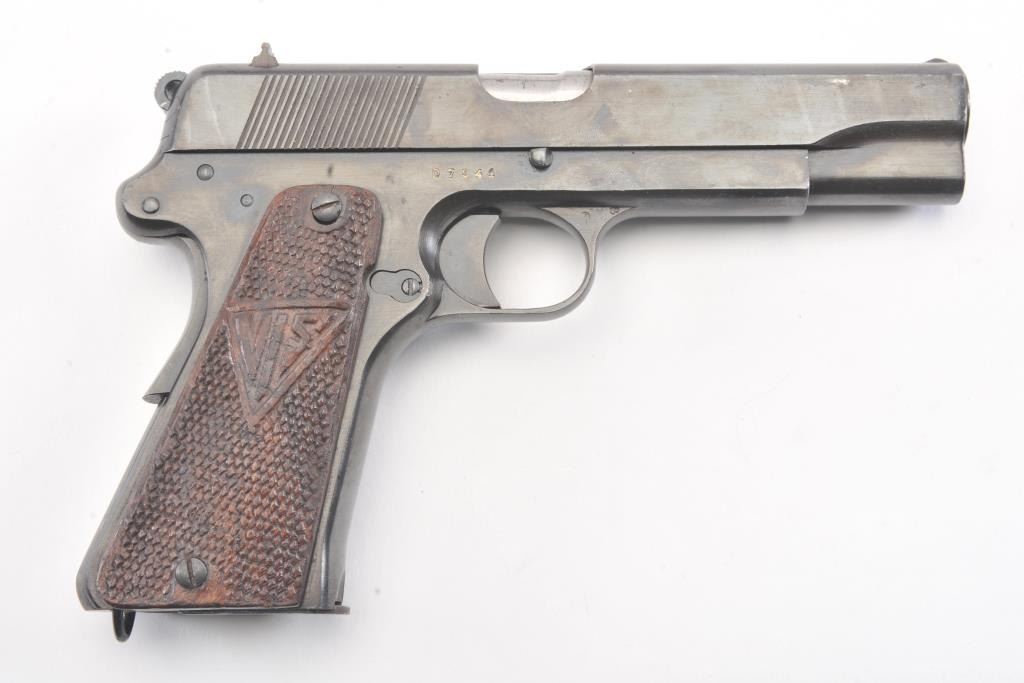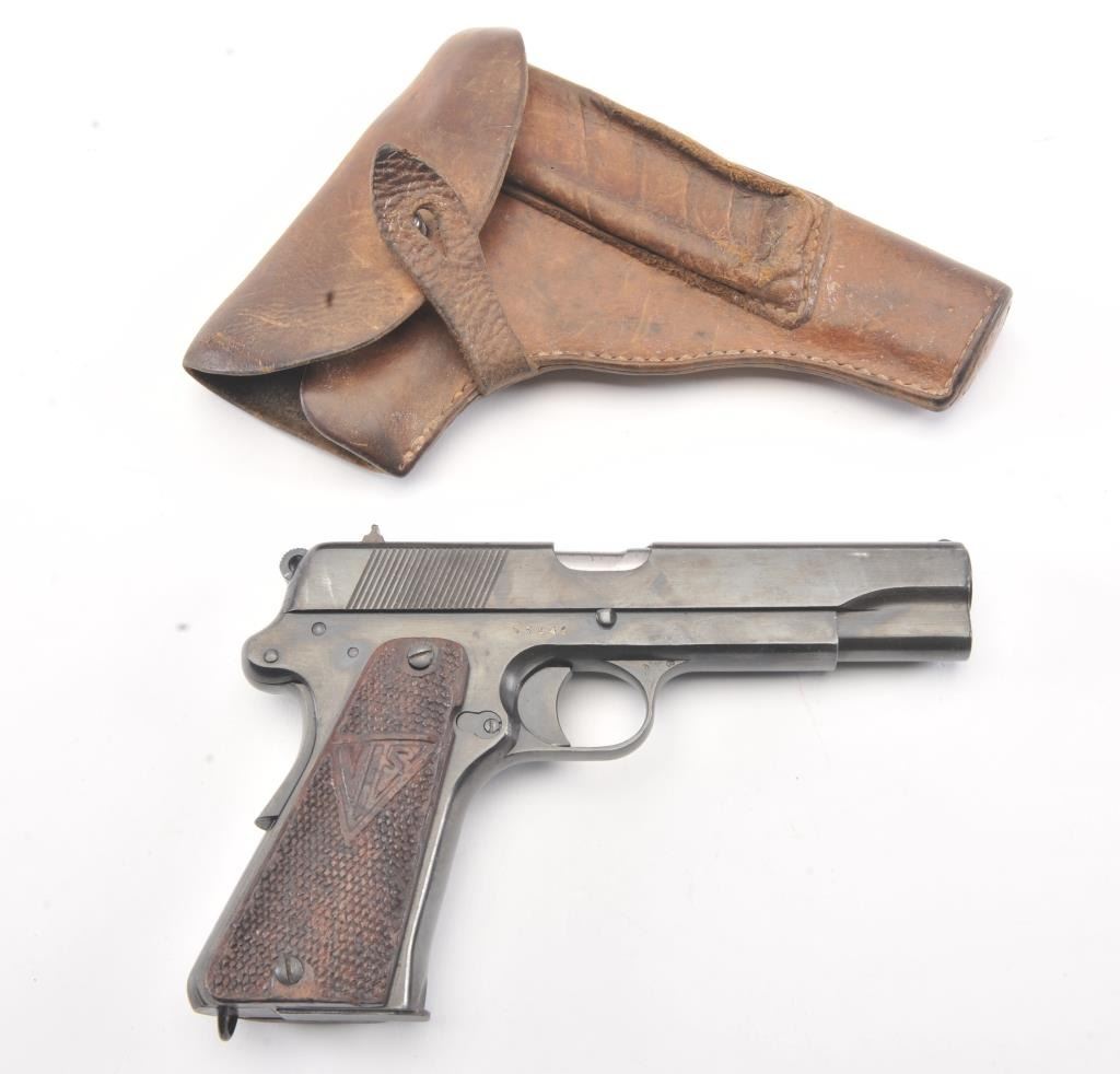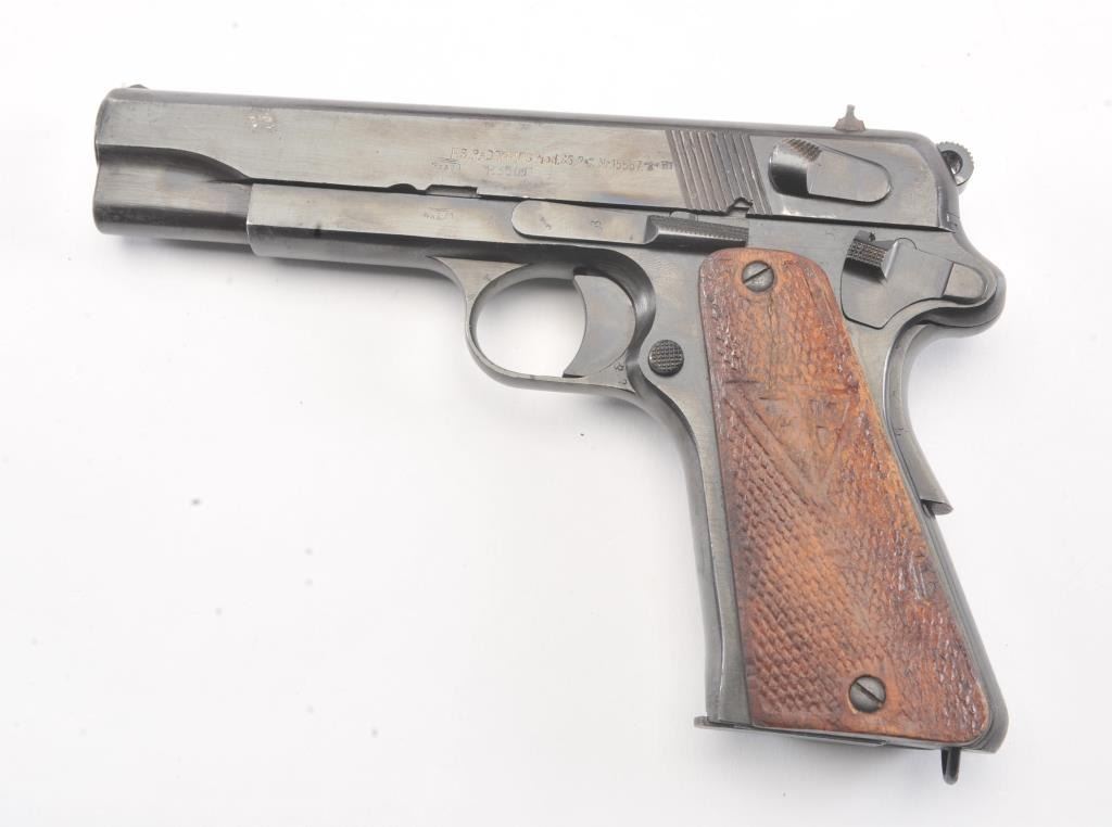 Polish Radom Model 35 Nazi proofed Semi-Auto pistol with holster, S/N D7941. Old arsenal type re-blued finish with sharp markings and proofs. The butt shows wear to the finish from carry in a holster. No import marks. The left grip is also holster worn and the right is better. The bore is bright and crisp. No import marks. A G.I. bring back. Unmarked flap holster included. (C&R/No PPT) Est.: $500-$1000