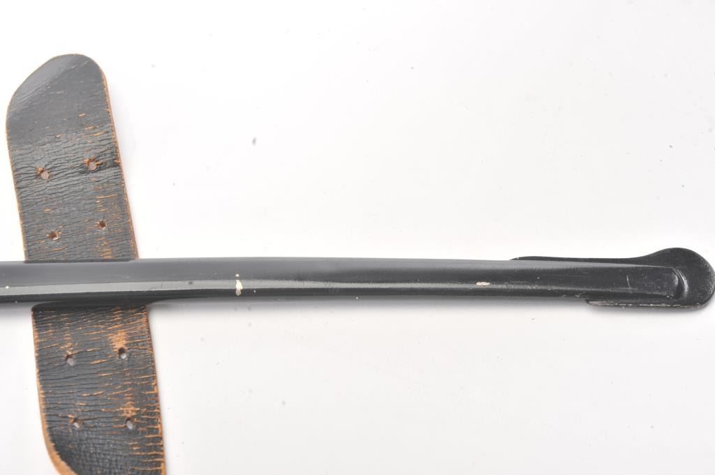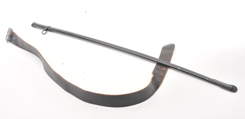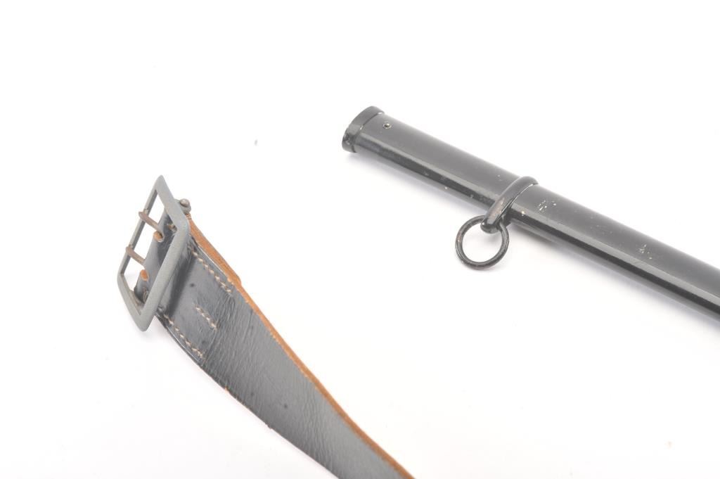 Lot of 2 bring backs from WWII as described: 1. German Officer’s belt with pebble grain buckle. 1945 dated and well-marked. 2. Black painted scabbard for medium size German sword.Est.: $150-$300