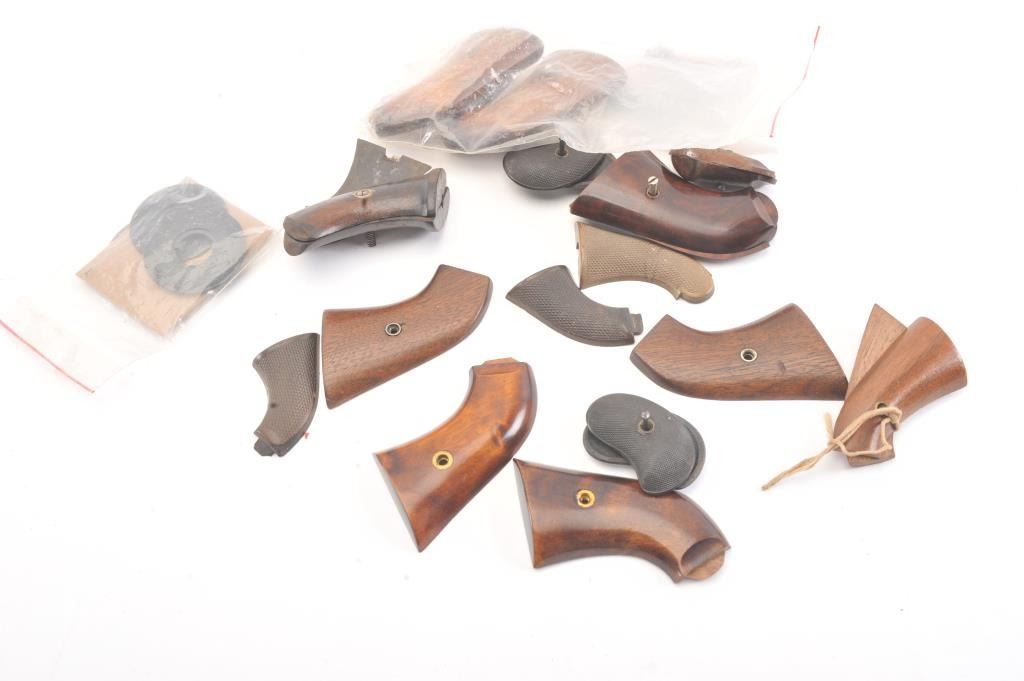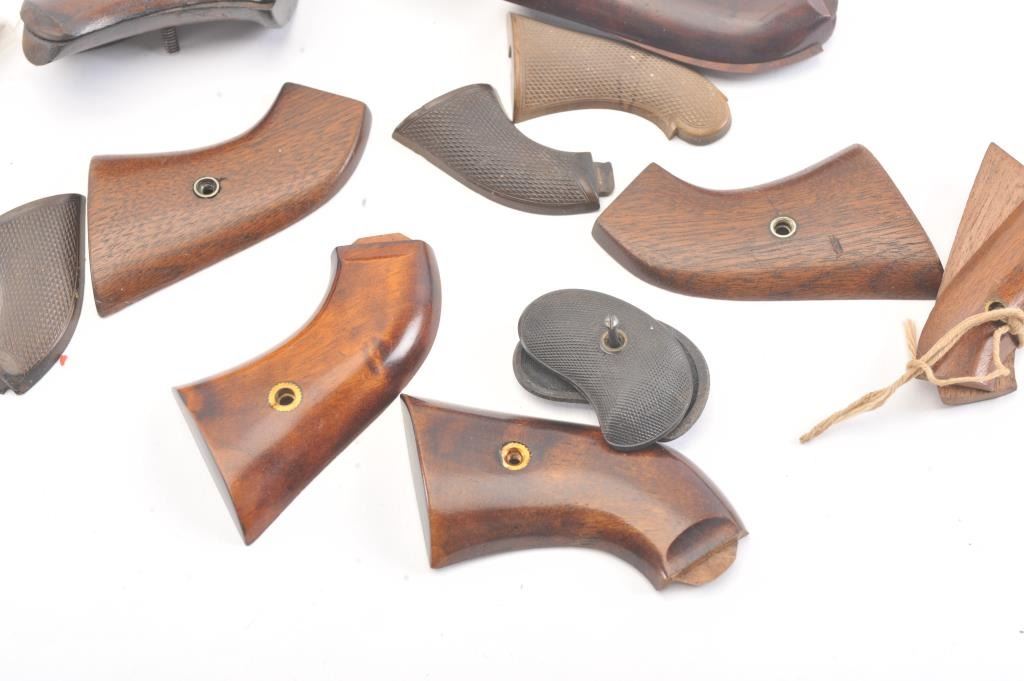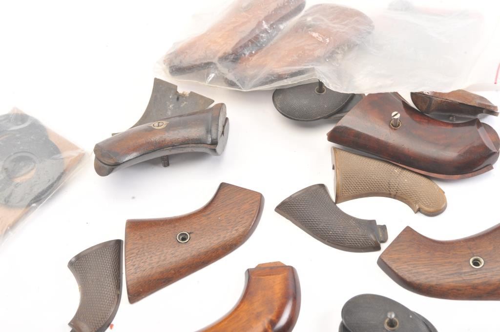 Antique pistol grip lot as described: 1. Pair of very good 1875 single action grips. 2. Pair of deluxe wood grips off of an engraved 1875. From the Gene Herrickcollection. Near fine. 3. Pepperbox grips. Good plus 4. Sharps .22 caliber 4 barrel derringer wood grips. Very good 5. Palm pistol scales. Excellent repros.6. 3 single sharps gutta percha grips. 7. Stevens single shot ‘Diamond” grips. Near fine 8. Colt New Line or 1872 wood grips. Good condition9. 2 sets of Remington O/U grips. Good condition 10. 3 1875 new replacement wood grips. A good lot. Est.: $350-$700