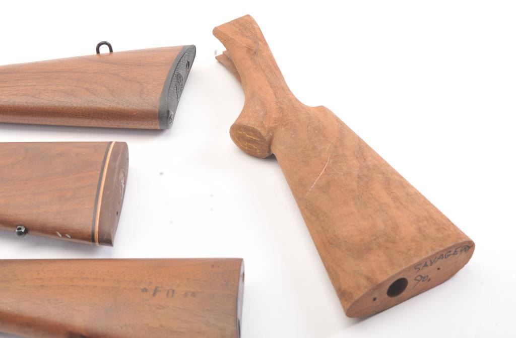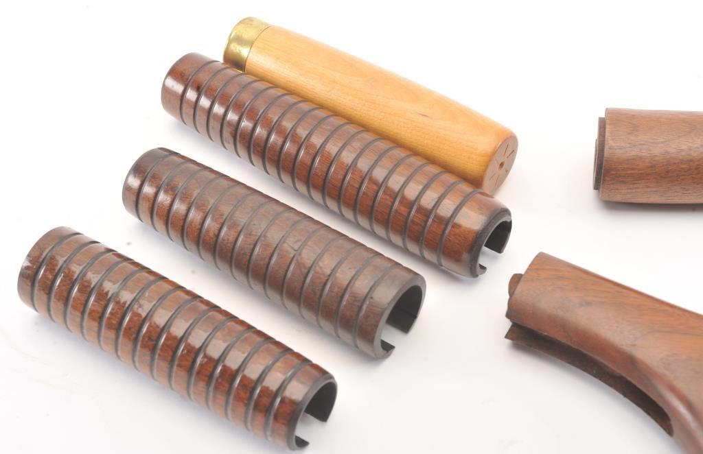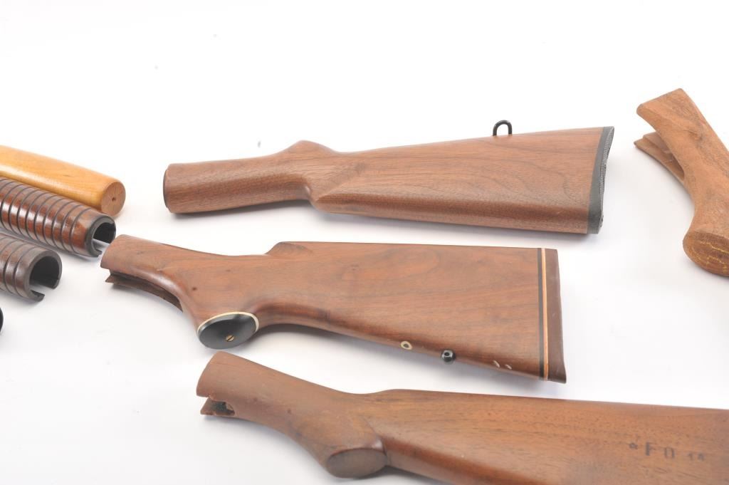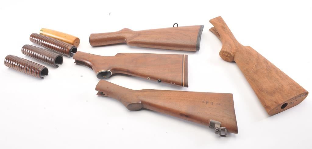 Lot of stocks including a blank Savage 99, Winchester 97 trench gun with butt plate and faux inspections, 97 stock in poor condition, Marlin stock in good condition, and 3 fore ends probably Winchester. Est.: $150-$300