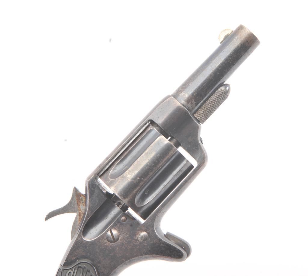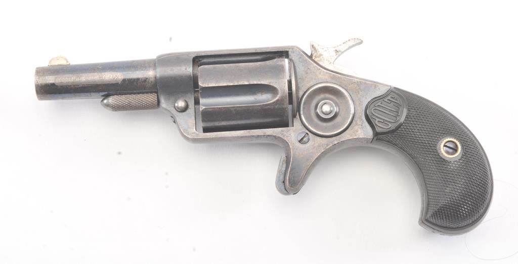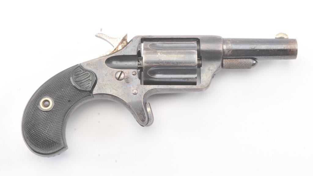 Colt New Line Revolver in .32 Caliber with desirable full blue finish, gutta percha grips, and etched panel, S/N 19423. Approximately 60%-80% original blue remains with drifting on the straps, high points andmuzzle. Fully legible etched panel. Near excellent and scarce gutta percha grips with “Colt” spelled out. Minor beginning age and light erosion. Bright blue on the hammer and trigger. Original small parts. A collector’sgrade New Line that is difficult to find full blued with this style grip! (Antique) Est.: $900-$1800
