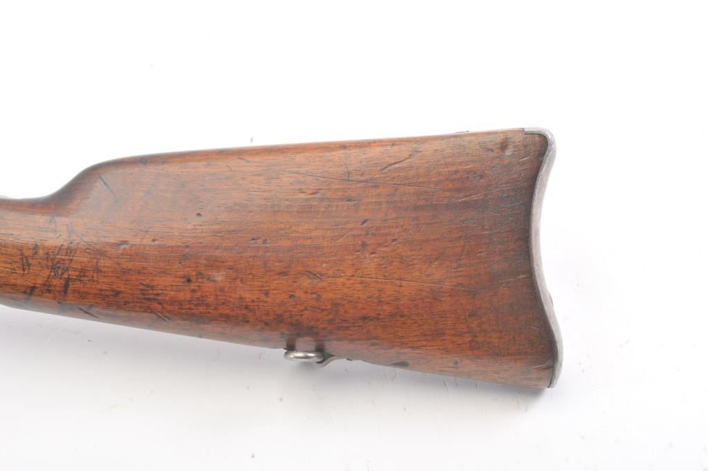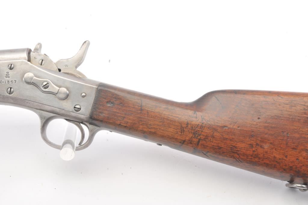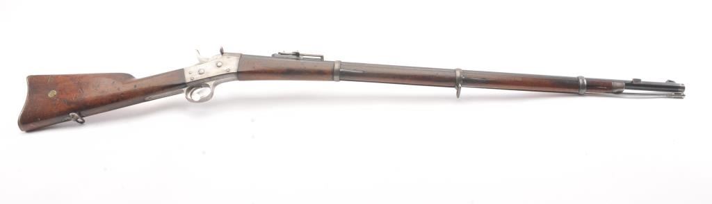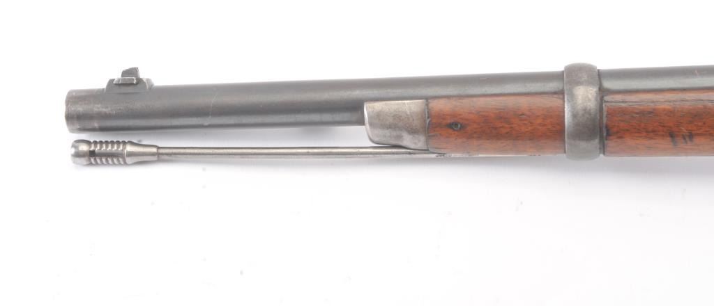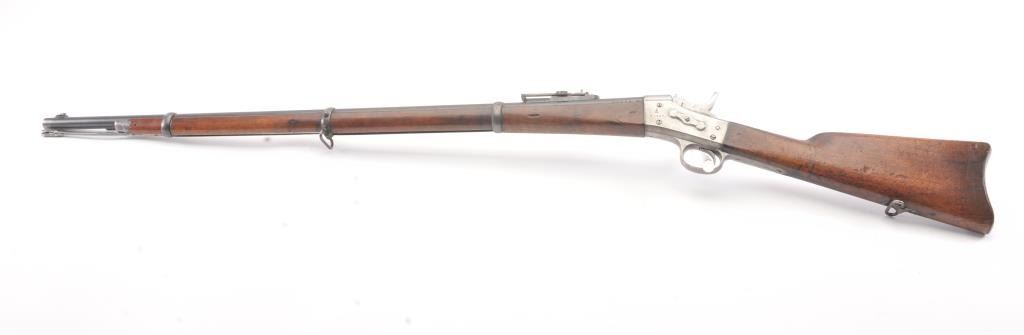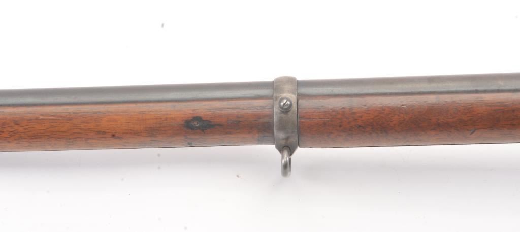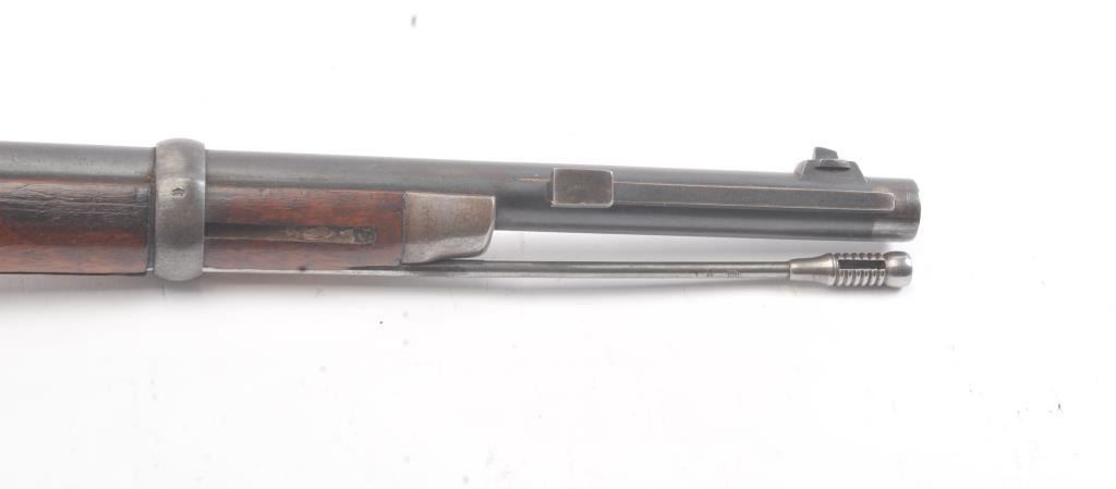Danish Model 1867 Military Issue Rifle on Remington Rolling Block patents marked “Kjobenhavn” on the tang and dated 1878. In 11.7x42R (almost a .45-70) with barrel measuring 35” showing arsenal markings and#52453 with crown proof on the barrel. 80%-90% toning blue on the barrel. 80%-90% toning blue on the barrel with arsenal bright action. The stocks are good with minor storage dings, mars, and scratches. Rodretained along with correct small parts. Excellent bore and mechanically sound showing very little firing or use. (Antique) Est.: $500-$1000