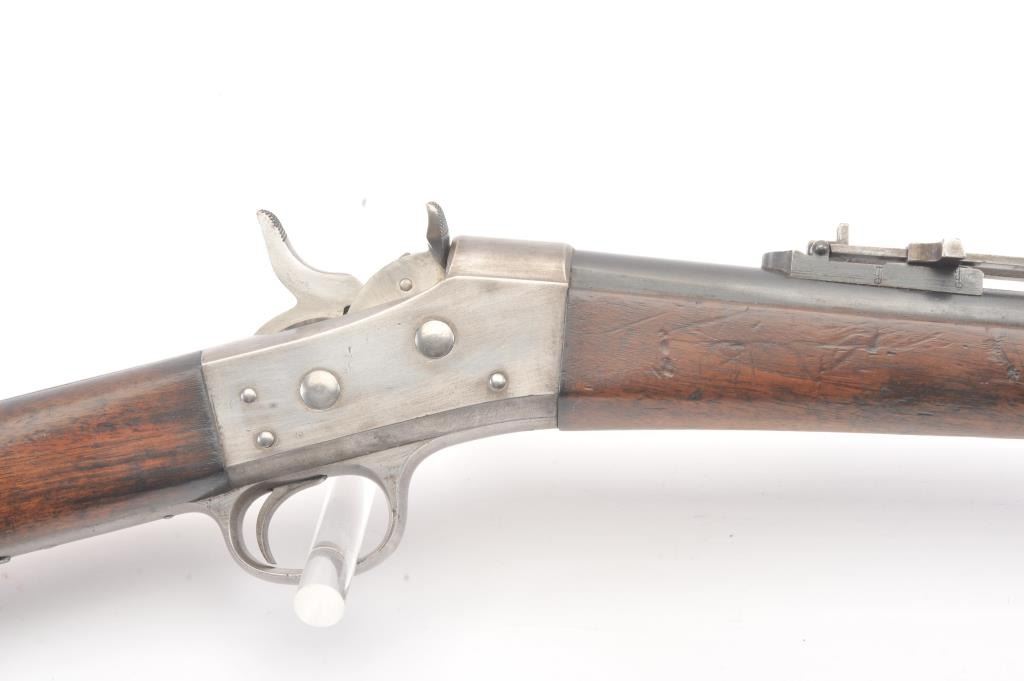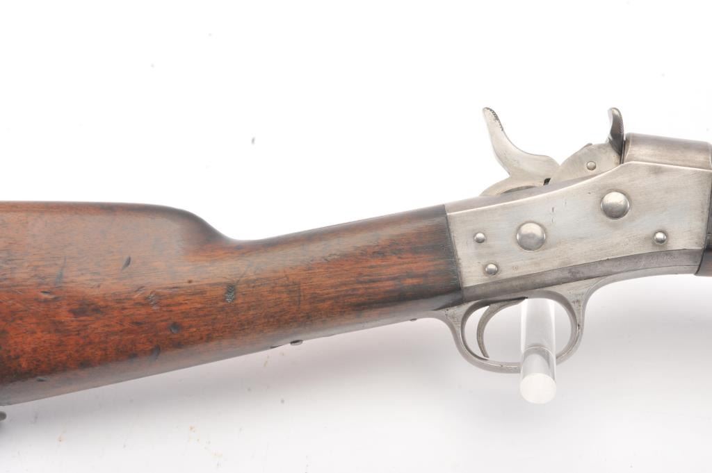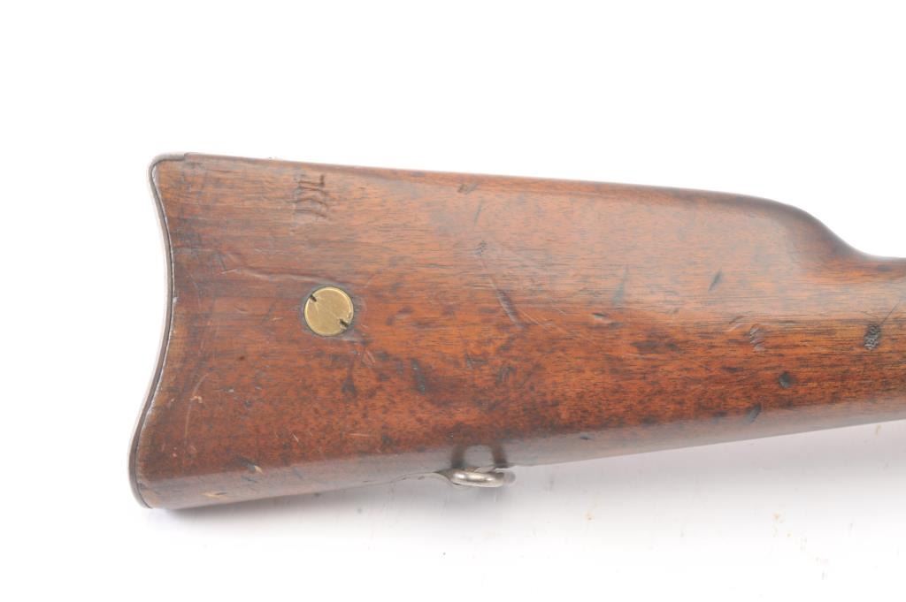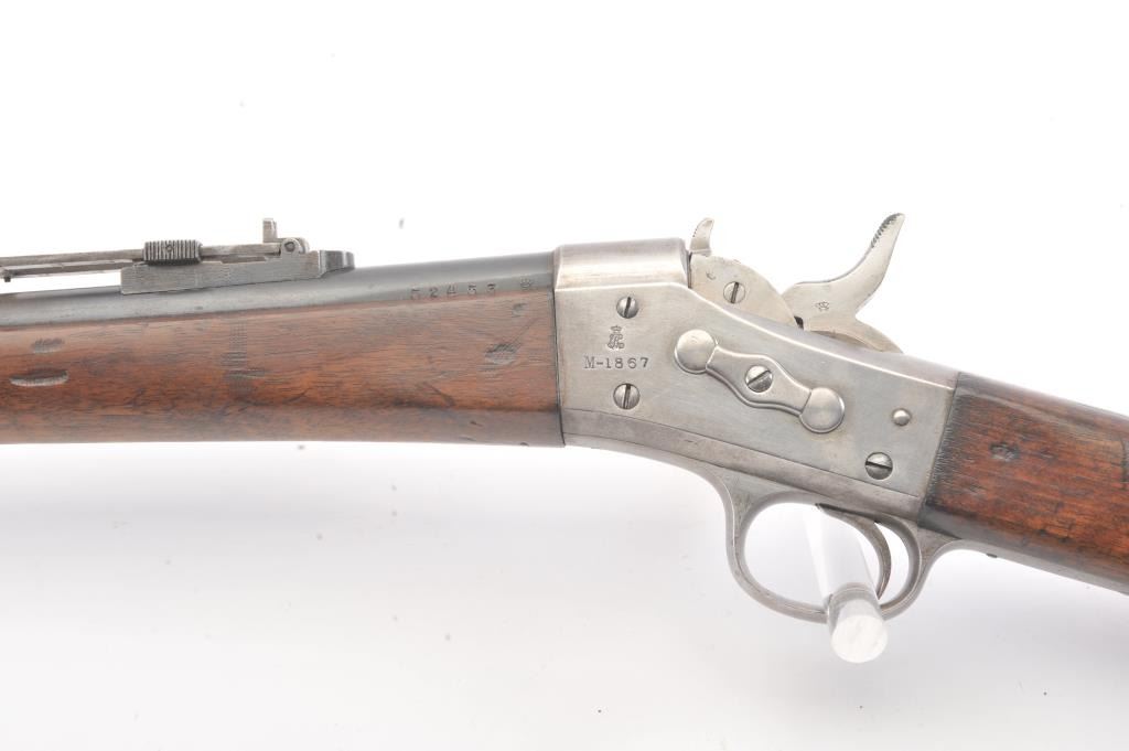Danish Model 1867 Military Issue Rifle on Remington Rolling Block patents marked “Kjobenhavn” on the tang and dated 1878. In 11.7x42R (almost a .45-70) with barrel measuring 35” showing arsenal markings and#52453 with crown proof on the barrel. 80%-90% toning blue on the barrel. 80%-90% toning blue on the barrel with arsenal bright action. The stocks are good with minor storage dings, mars, and scratches. Rodretained along with correct small parts. Excellent bore and mechanically sound showing very little firing or use. (Antique) Est.: $500-$1000