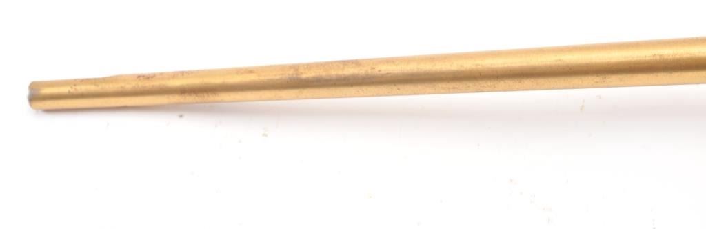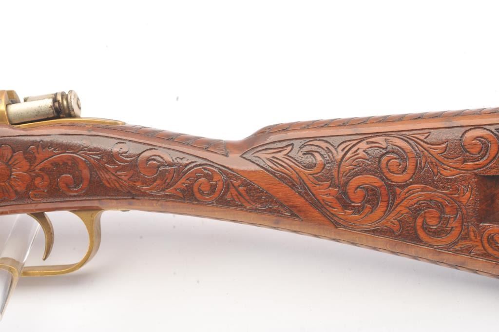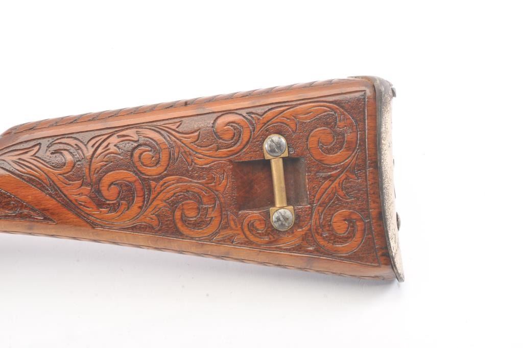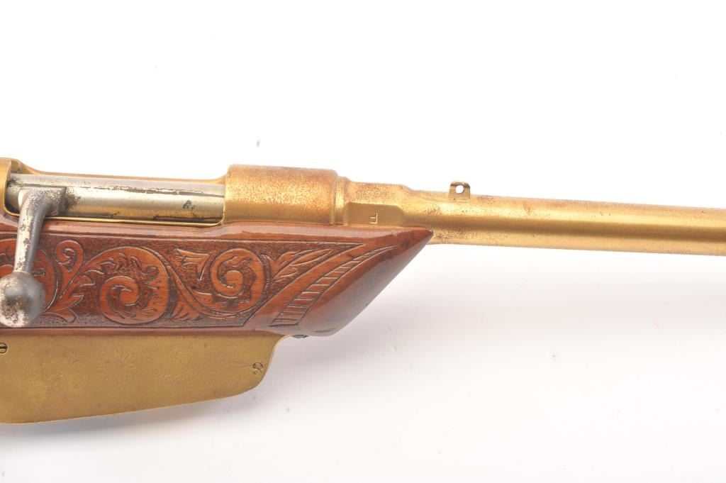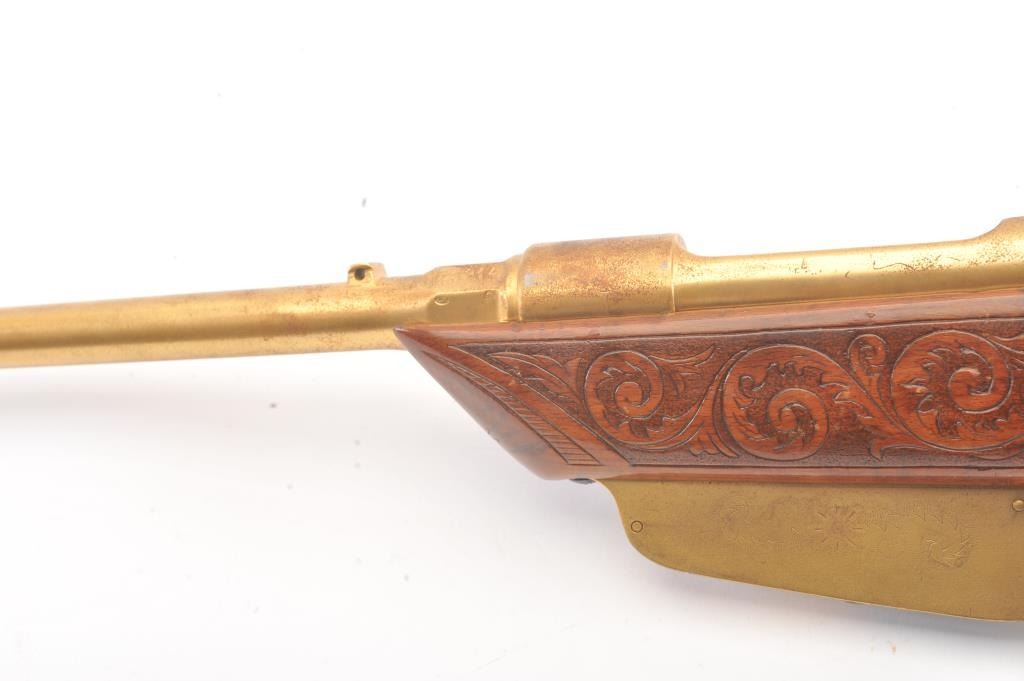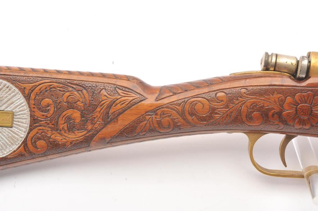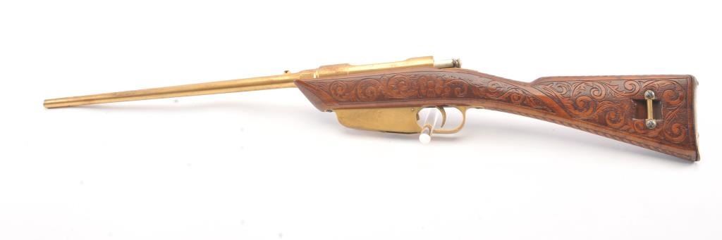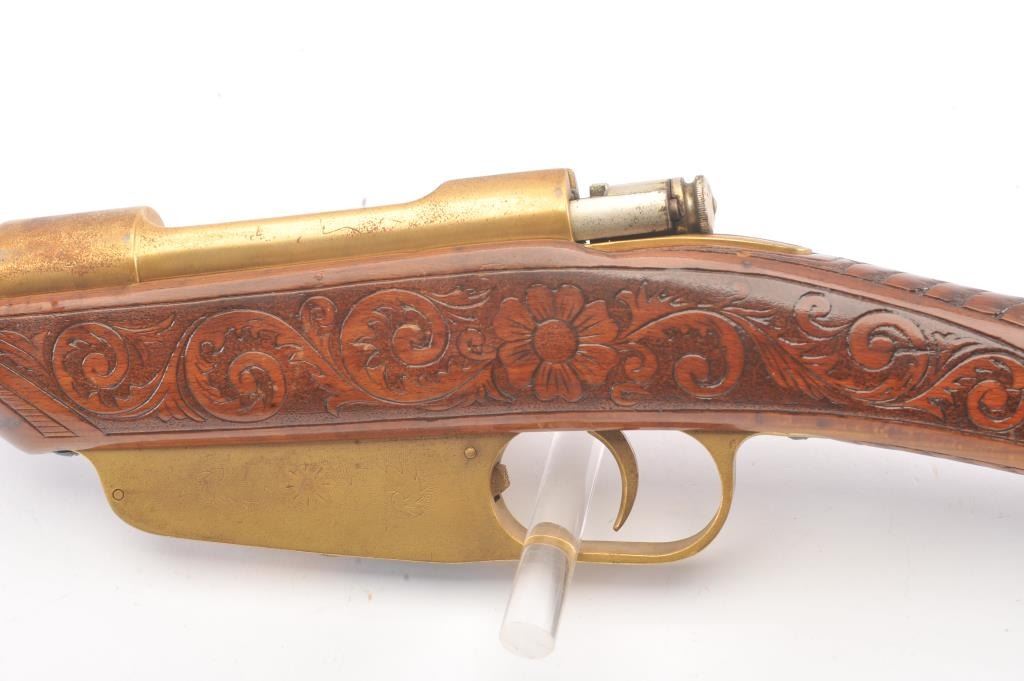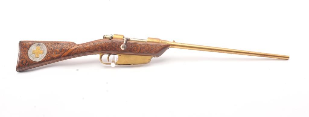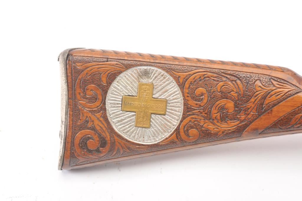 1936 Dated Italian Carcano presentation grade carbine in 6.5mm caliber with breech marked “Gardonee”, S/N 18914 and 1936 XIV. The barrel measures 18” and 36” overall. Gold and nickel plated with light engravings on eachside of the magazine. The stock is a light color wood wit a select grain that is carved in florals and scrolls with a panel at the rear of the right butt stock inlaid with a cross inscribed “Merito Di Guerra” and thecypher “V.E. III”. (Victor Emmanuel). The crown on top of the cross removed possibly in Mussolini era. 80%-90% old nickel and gold plating showing some erosion that may clean from storage and lack of cleaning. VictorEmmanuel was king of Italy from 1900-1946 and during WWII era. We have seen 2 other somewhat similar presentation carcanos. 1 presented by the count of Abruzzi. Good mechanically and bore is good. (C&R) Est.:$600-$1200