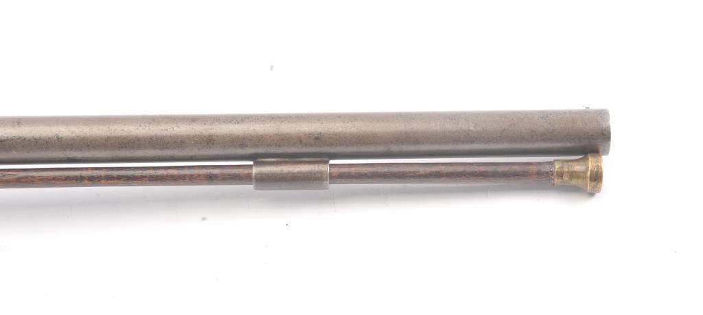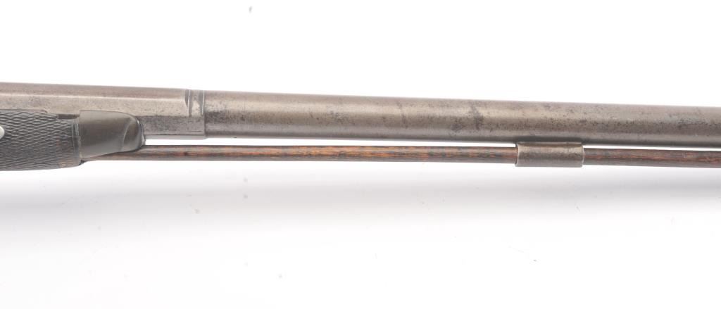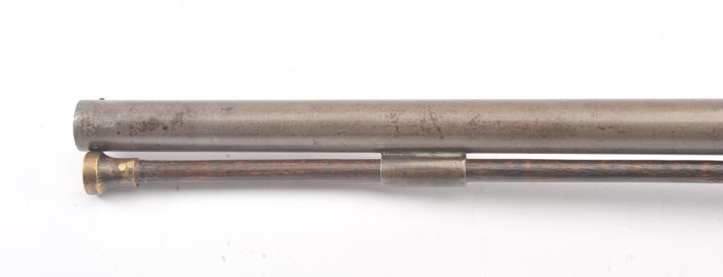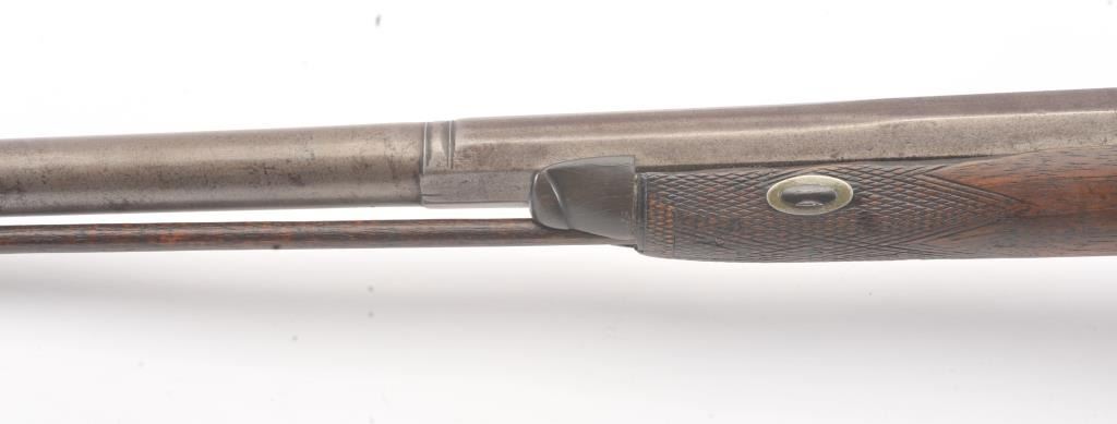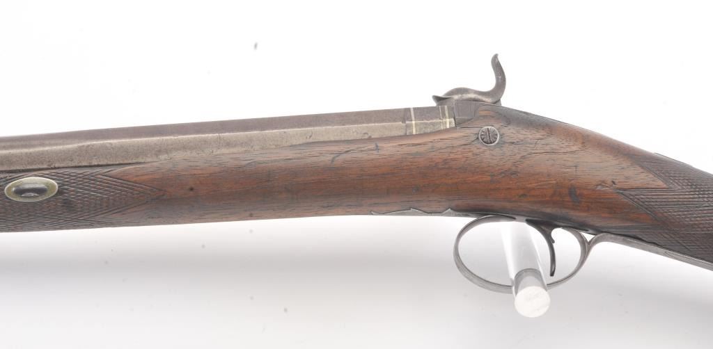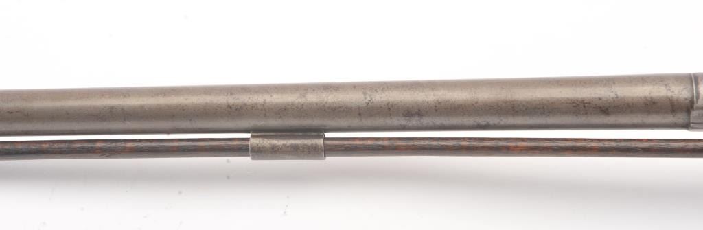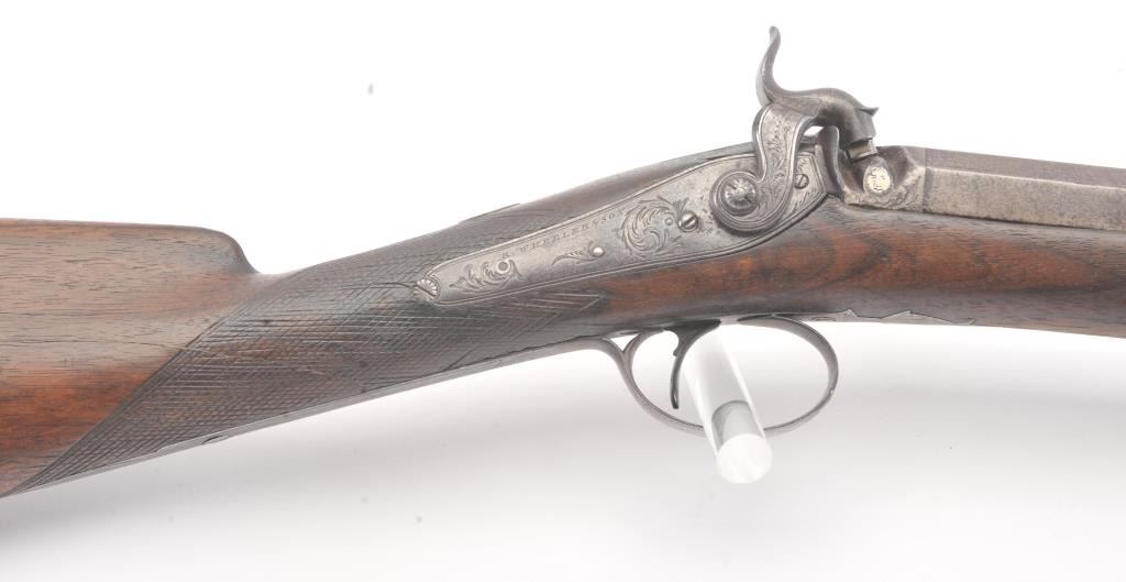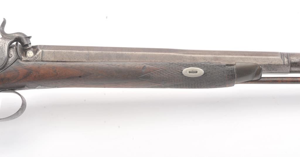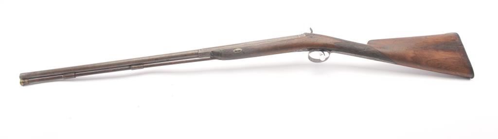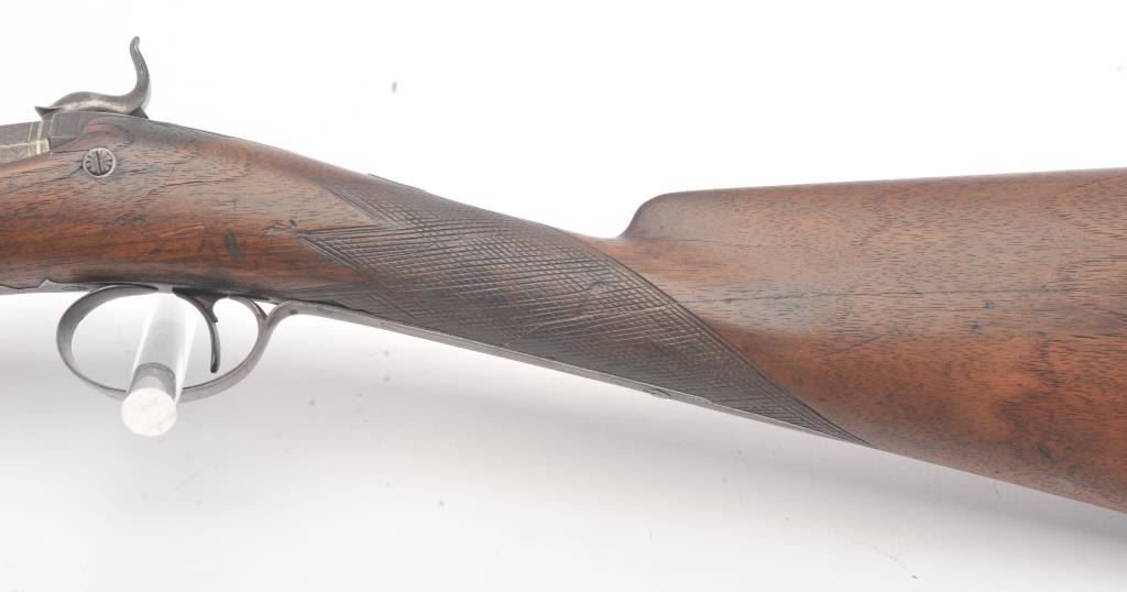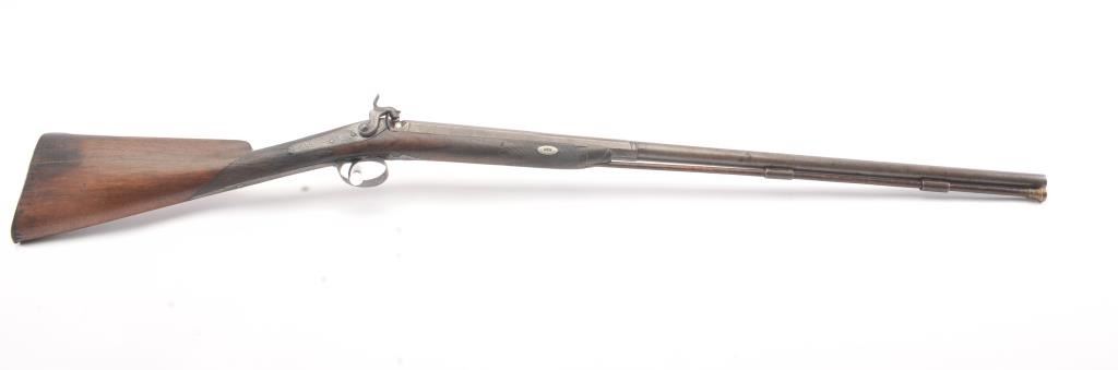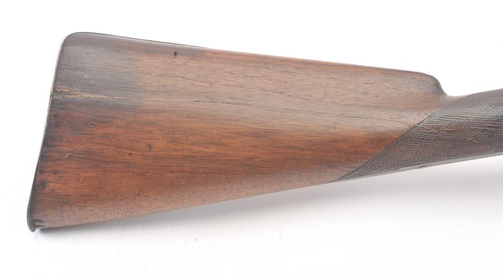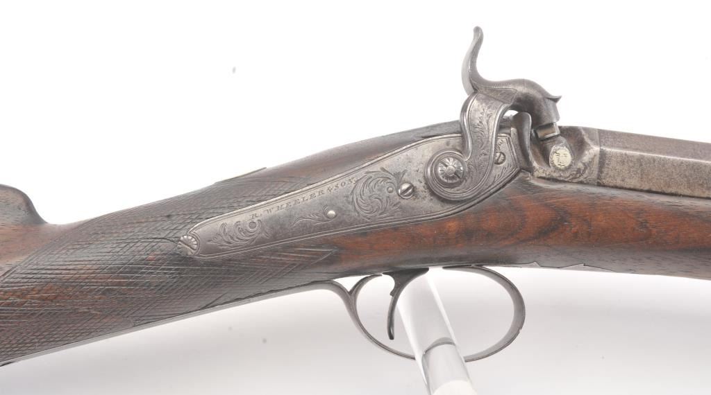 British single barrel percussion fowling piece signed “B. Wheeler & Son” on the back action lock circa Mid-19th century. Measures 46” overall with a 30” half round/half octagon barrel of approximately 12 GA chokedfull. 3 silver or platinum bands at the breech (2 wide and 1 narrow) with engraved blow out plug showing face of bearded man. Good quality overall showing typical engraving and horn fore end cap. The actionis crisp and works well. Smooth metal with grayish patina. The stock is fair to good with minor losses and wear but sound with some age cracks that are “Hair Line” thickness. Large sliver of wood missing fromthe top. The edge of the left fore end approximately ¼” to ½” by 5”-6”. (Antique) Est.: $300-$600