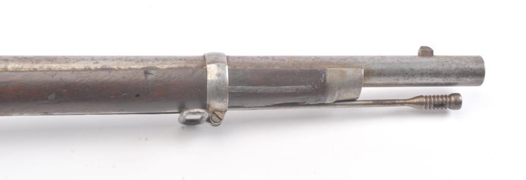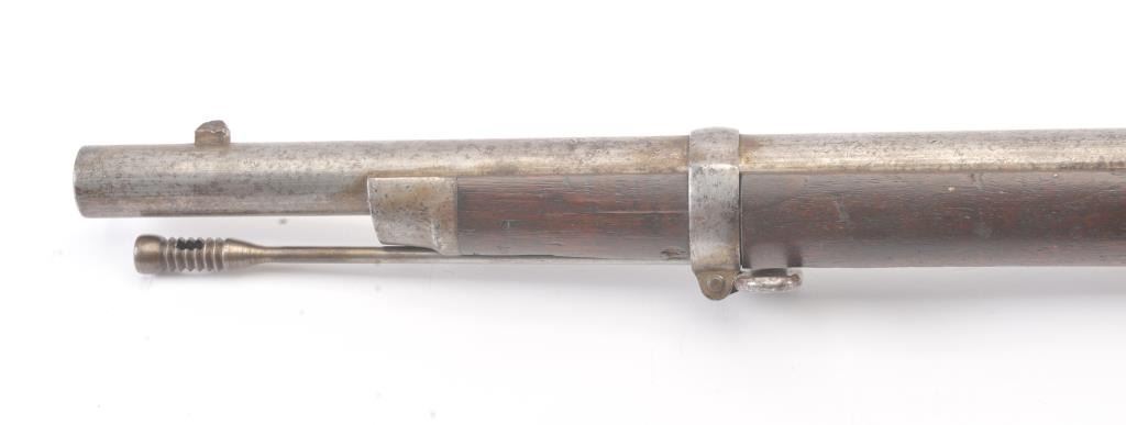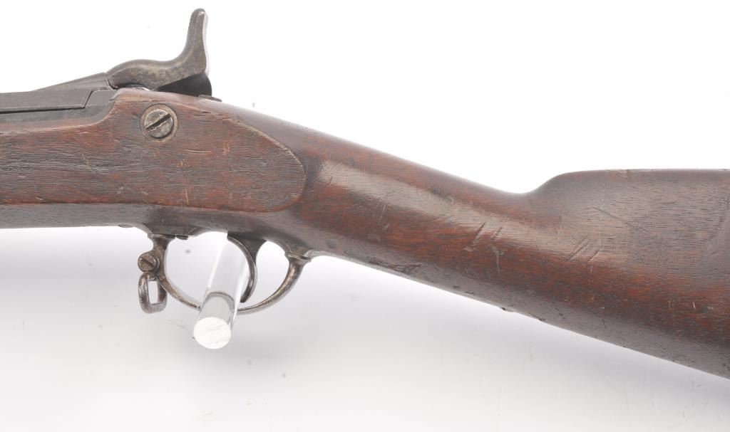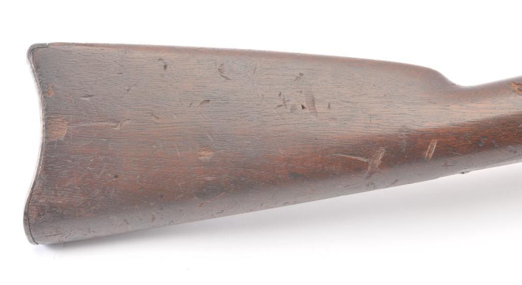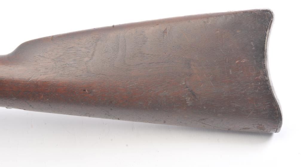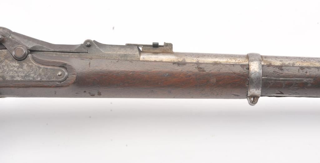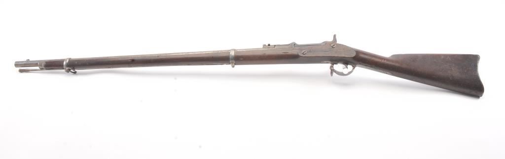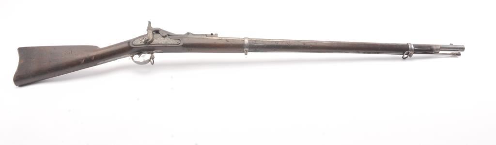 Springfield Model 1868 Trapdoor Rifle in .50-70 caliber with a 33” 2 band barrel, S/N 10436. Good to very good overall condition showing mottled aging on an original arsenal bright metal with crisp marking. The stocksare good with visible cartouche and many dings, mars, dents and scratches consistent with military issue and use. The action and bore are good. The firing pin shows marring and is stock forward and may fire uponjarring or closing action. Needs minor repair by gunsmith before firing. (Antique) Est.: $500-$1000