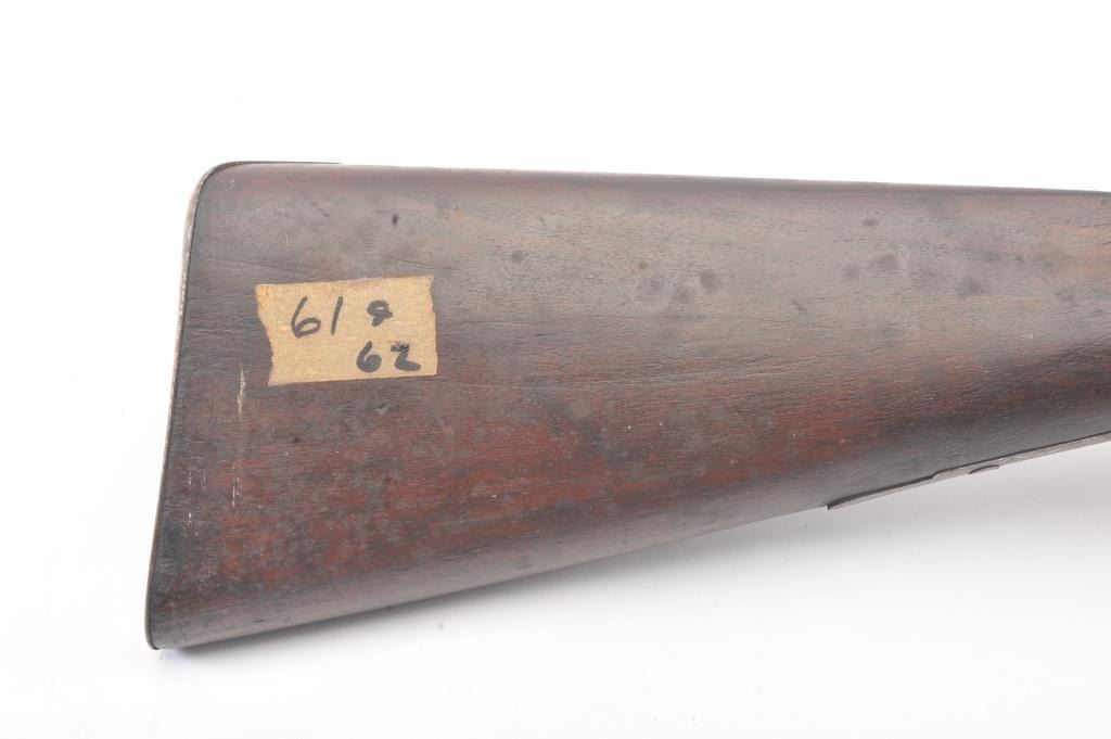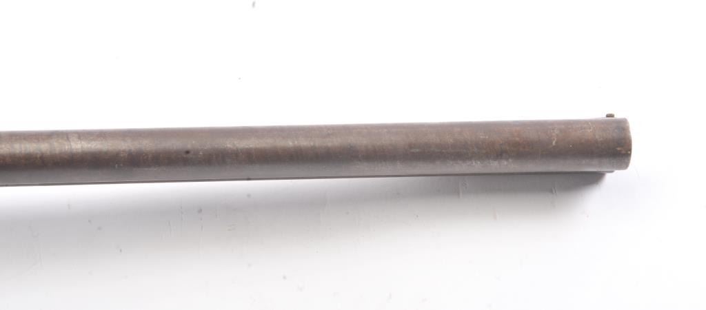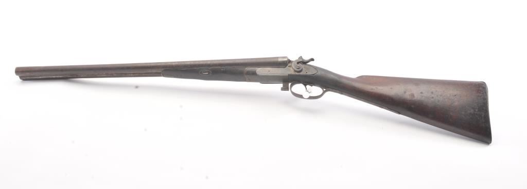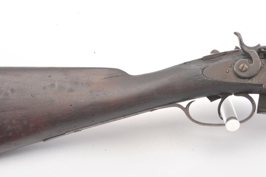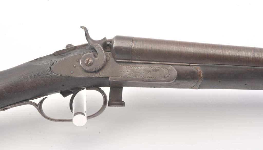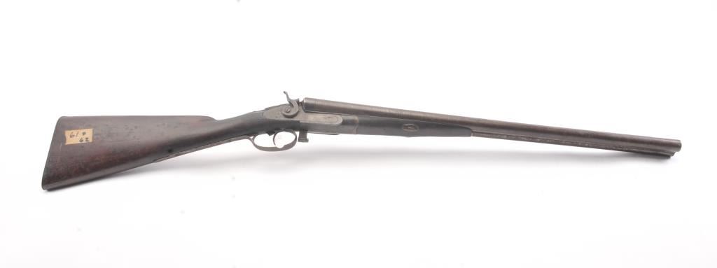 Parker Bros. SxS Shotgun in 12 GA with 24” barrel, early release located in front of the trigger guard, exposed hammers, and stamped “W.F. & Co.” on the rib. Fair to poor condition with 1866 patent date on guard. Agood western display piece and Parker’s were purchased by Wells Fargo but this mark is not of the western frontier era in our opinion/ A clever gunsmith with initial “A.K.” marked hundreds and sold them to tourists at Knott’s Berry Farm Gun Shop circa 1960s-70s. (C&R) Est.: $350-$700