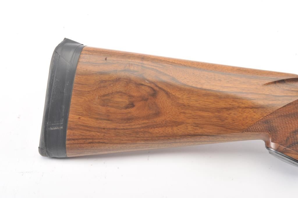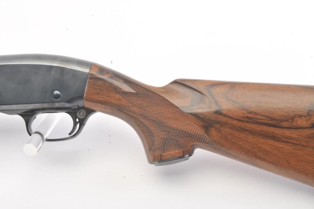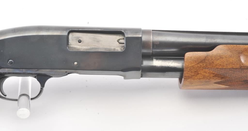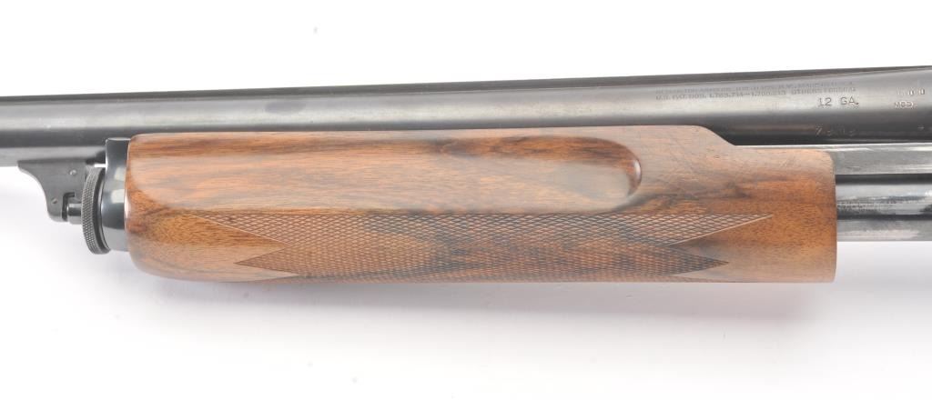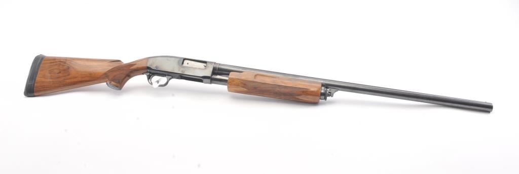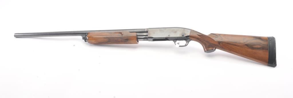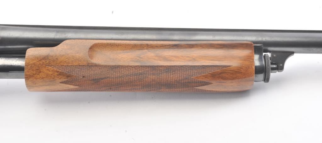 Remington Model 31 Pump Action Shotgun in 12 GA with a 28” raised non-vented rib and modified choke. Nicely restored and restocked with exceptionally well checkered wood showing fancy grain and blued steel pistolgrip cap. Measures 14” to the end of Kick-eez pad. 80%-90% of good quality re-blued finish with a couple “Spots” on the left. Mechanically sound with finishing to action with bright bore. (C&R) Est.: $500-$1000