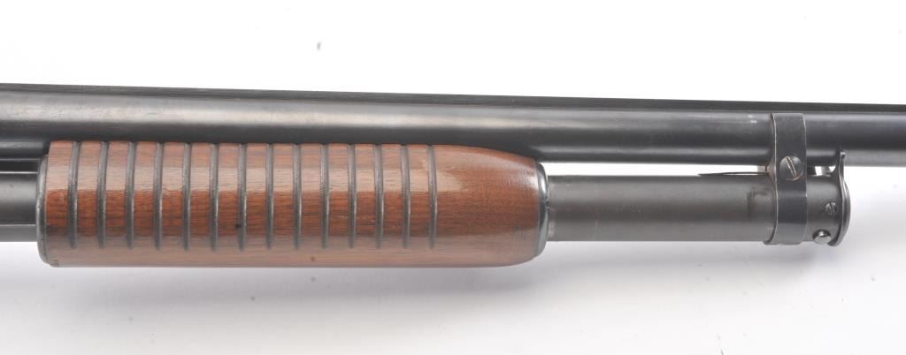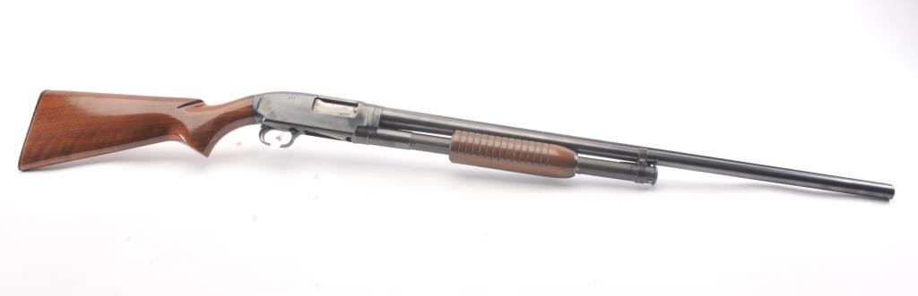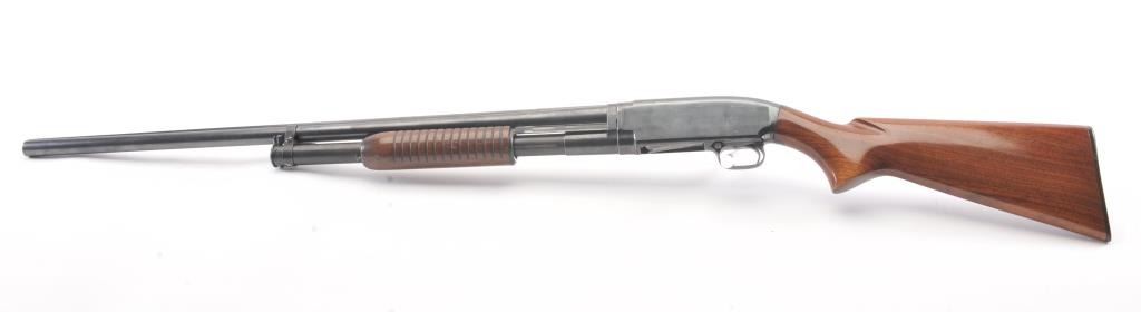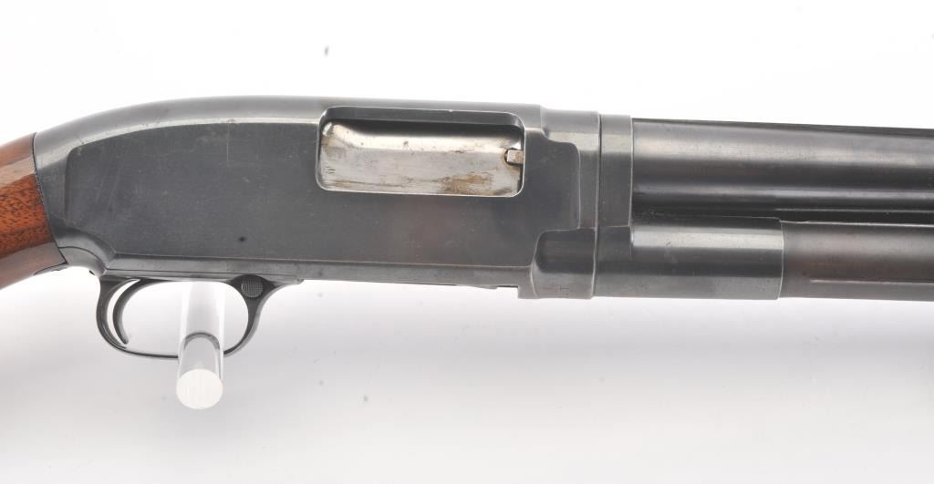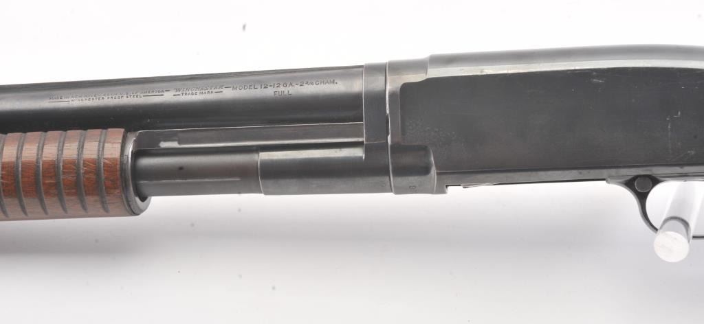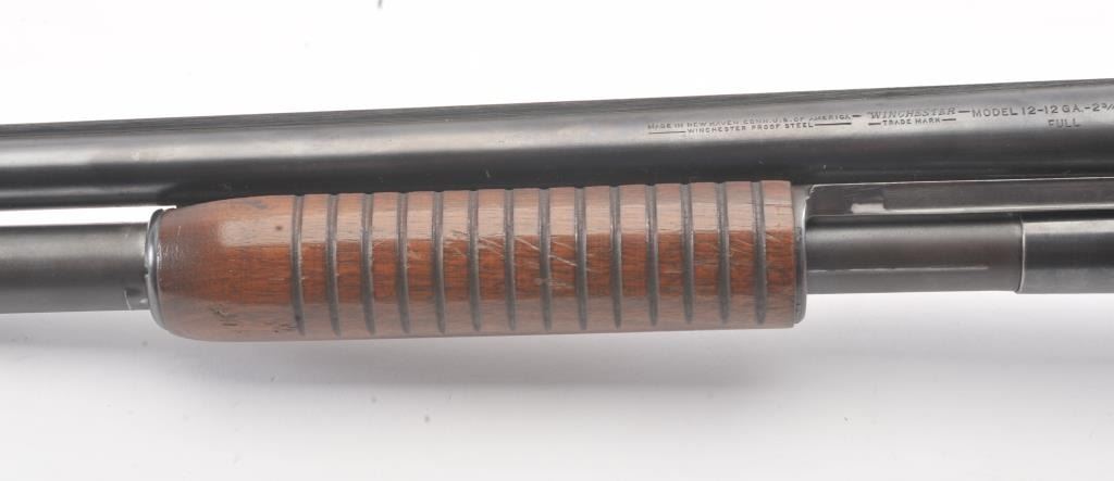 Winchester Model 12 Pump Action Shotgun in 12 GA with desirable 30” full choked barrel with raised matt non-vent ribbed barrel, S/N 1023586. Very good original condition with 85%-95% original blue showing some minorscratches, marks, and aging. The stock are good with minor marks and scratches in the finish. Original hard rubber Winchester butt plate in very good condition. No chips or losses. Good action and bright bore. Superfor trap or field. (C&R) Est.: $400-$800