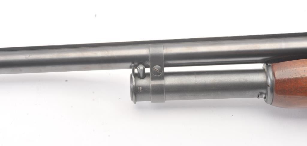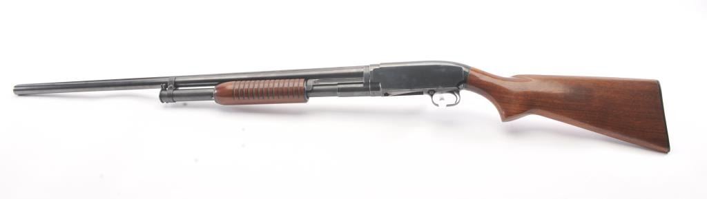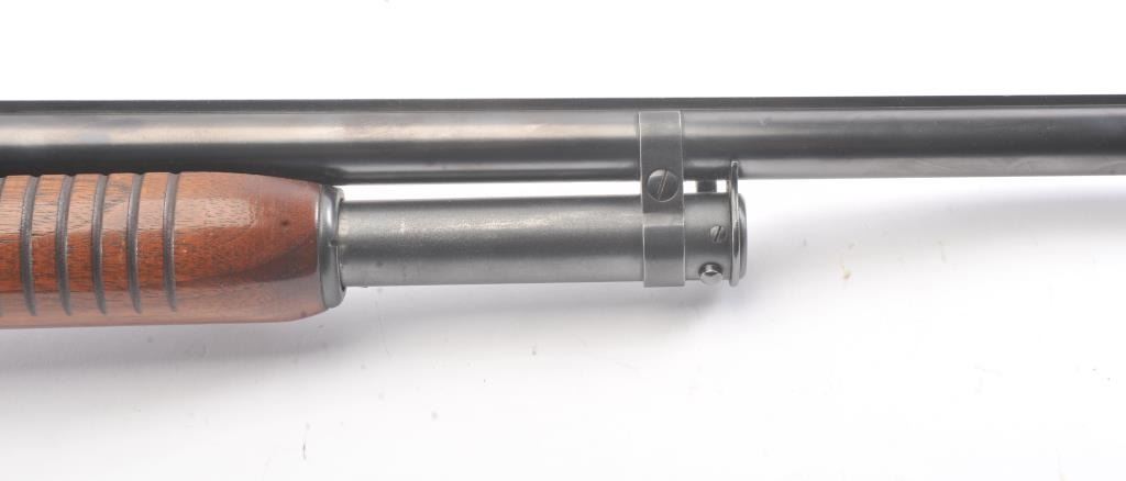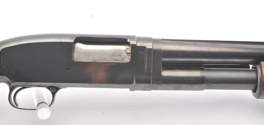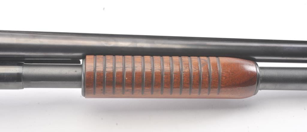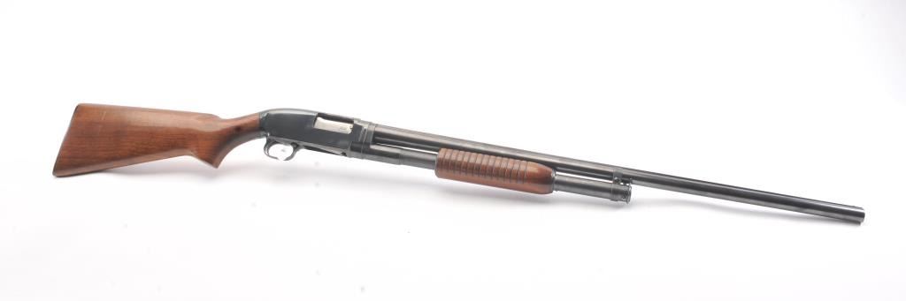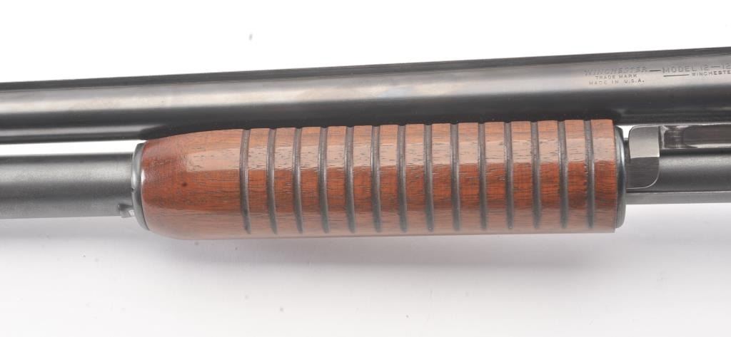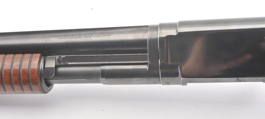 Winchester Model 12 Pump Action Shotgun with 30” non-vent raised and matted factory rib and full choked, S/N 1512298. Near fine condition with 90%-95% original bright blue showing minimal aging and just starting areas of erosion. Sharp and crisp edges and markings. The wood is very good plus with some minor scratches, dings and mars. The butt plate if fully intact. Mechanically sound and bright bore. An 8.5-9 on a 1-10scale. Great for trap or field. (C&R) Est.: $500-$1000