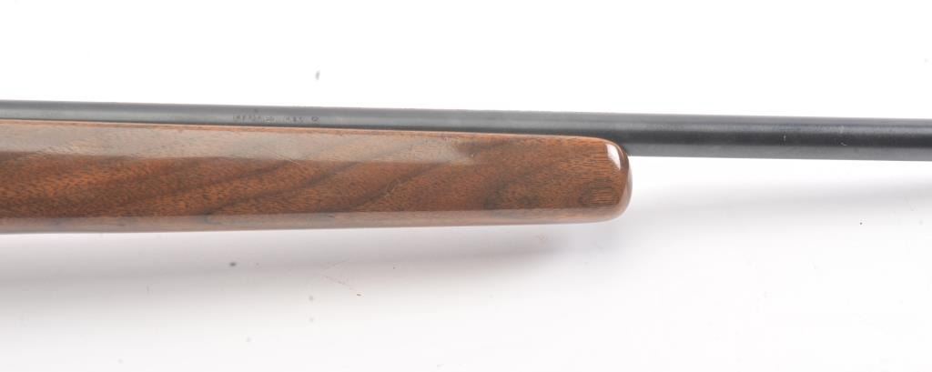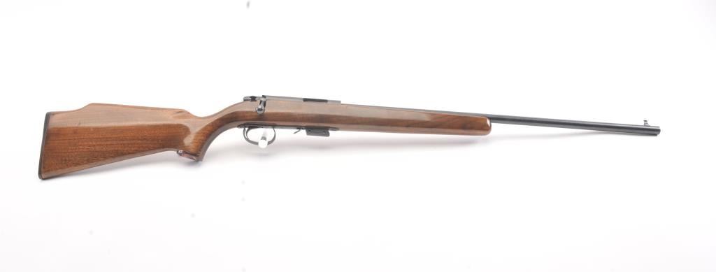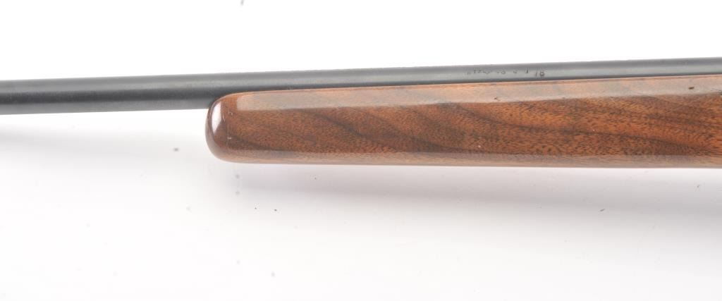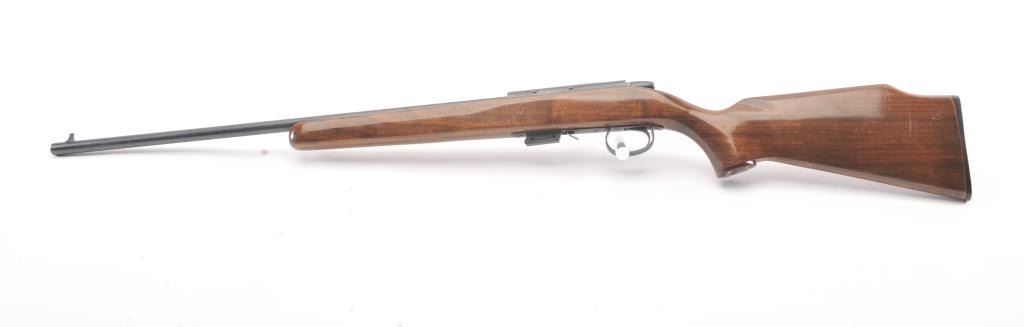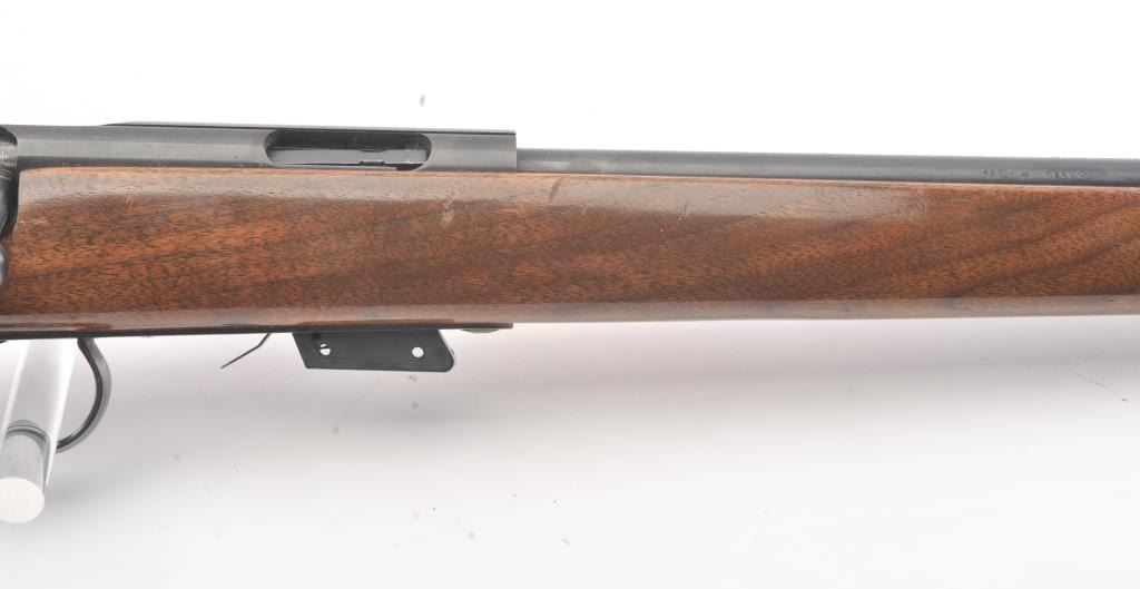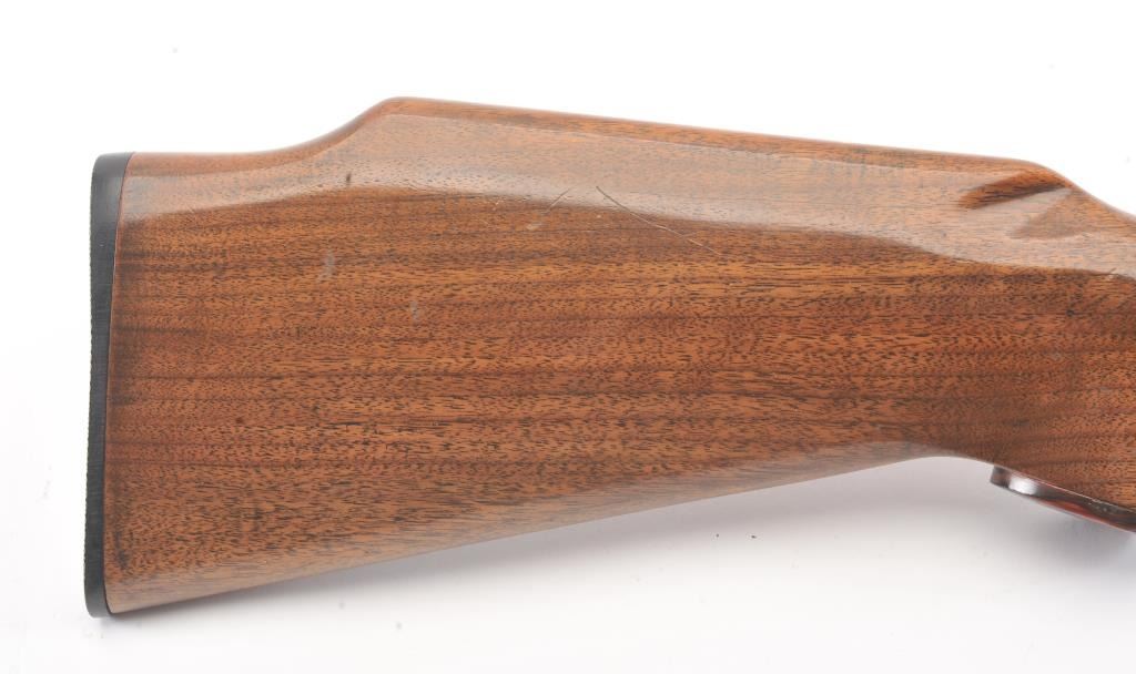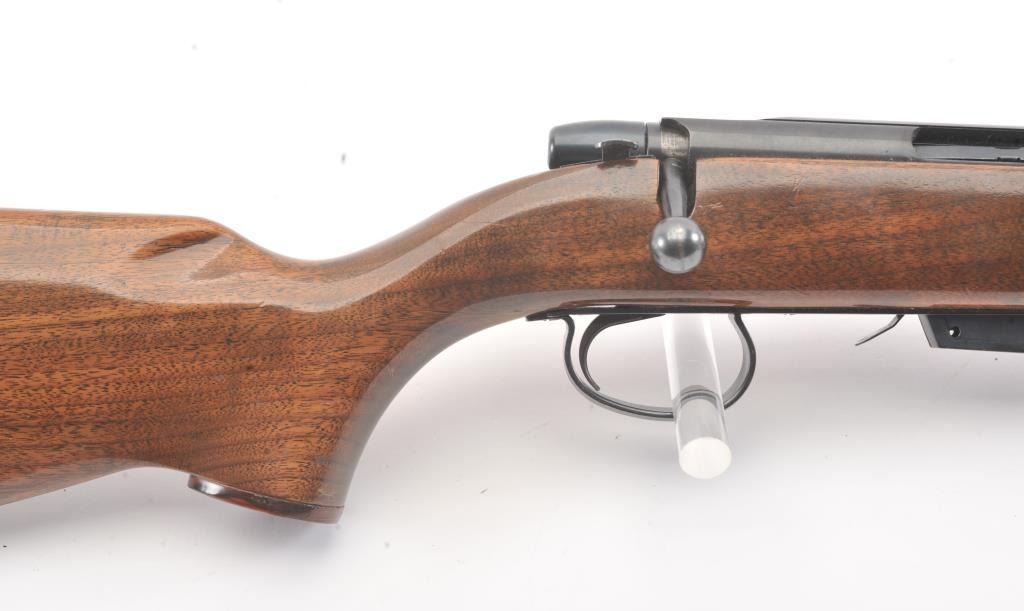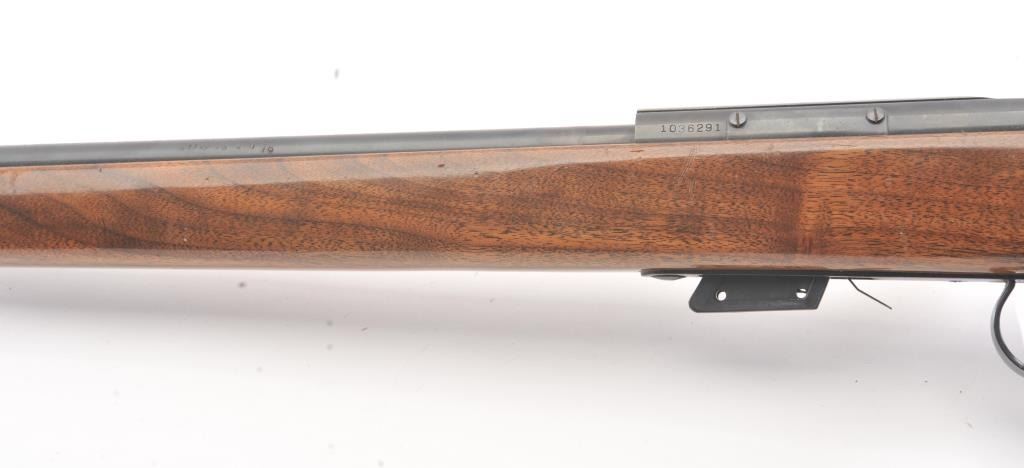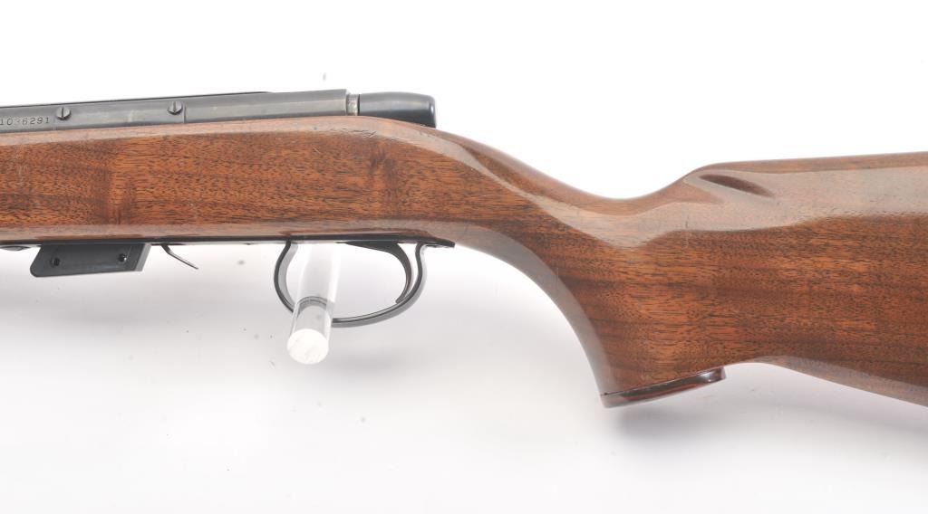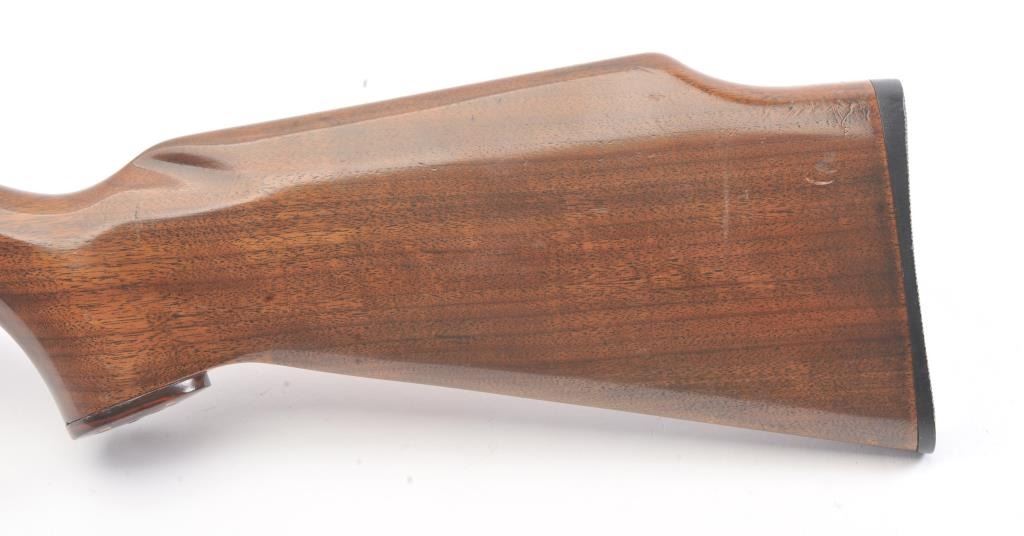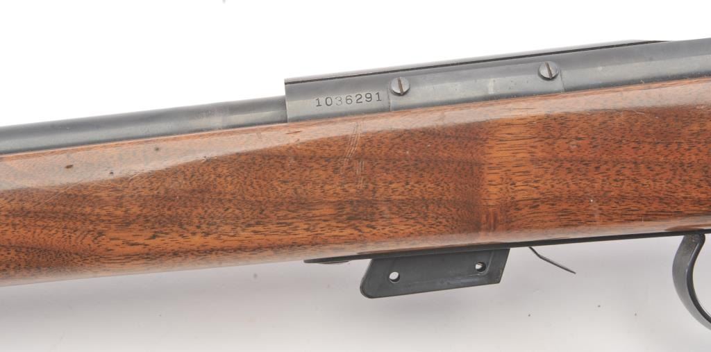Remington Model 591M Bolt Action rifle in 5mm Rim-Fire, S/N 1036291 and made 1969-1974 and desirable to collectors. 95%+ original with some scratching and loss of finish. The stock is very good also with scratches in the high gloss finish. The grip cap is original with Remington logo and 5mm markings. Original butt plate. Bright bore and sound mechanically. (Modern) Est.: $300-$600