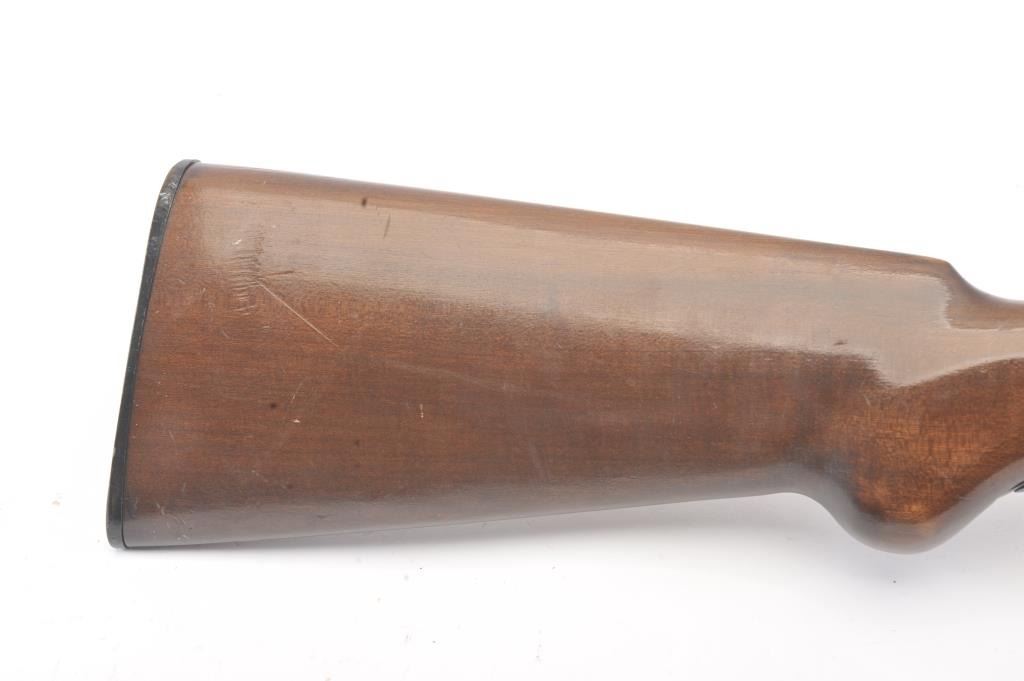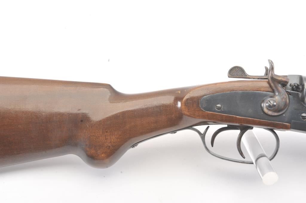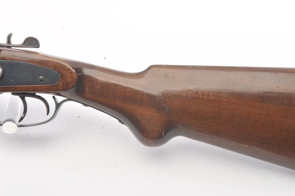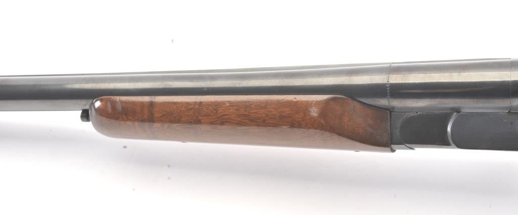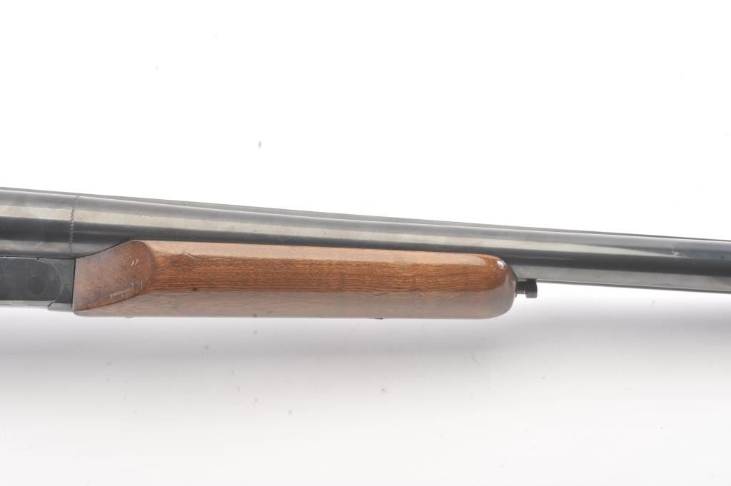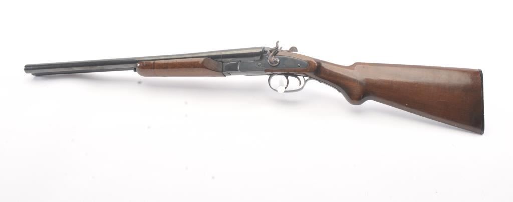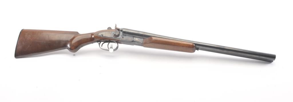 Rossi SxS Exposed Hammer Coach Gun, #T63280, 12 Ga., 20" solid rib barrels, blued finish, double triggers, ejectors, beavertail forend, with smooth wood stock, and plastic butt plate. The shotgun is in very good to finecondition overall, retaining 97% original finish, the bores are very good, the action is good, the stock is very good with two minor chips out of the bottom where the trigger guard meets the action (the wood isproud in this area anyways and can be fixed). Otherwise the stock shows minimal scratches, dings and imperfections. (Modern) Est. $200-400