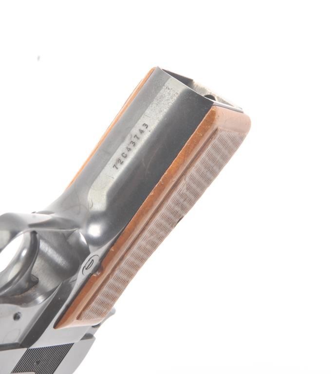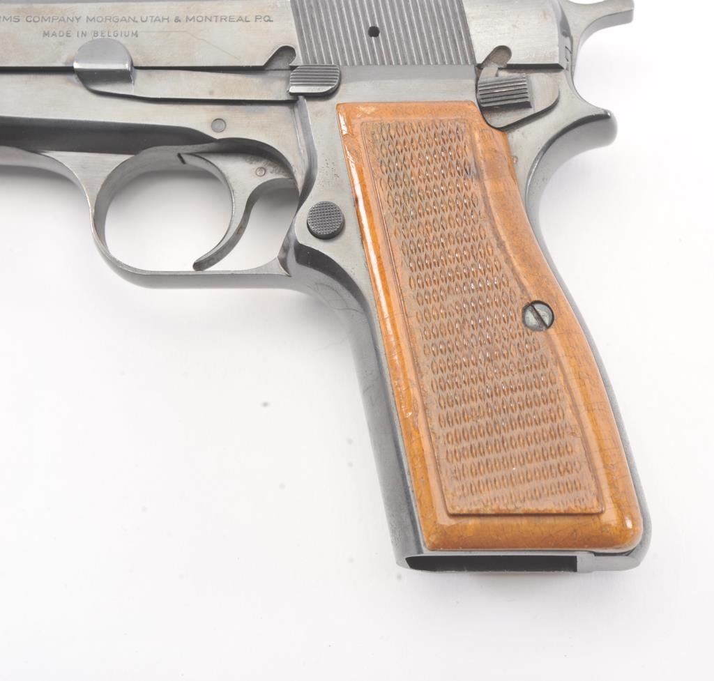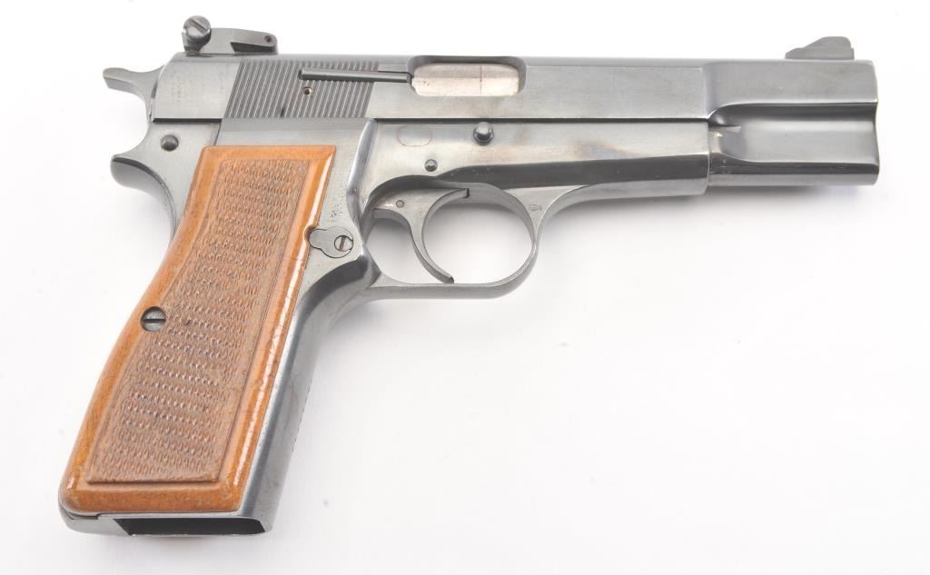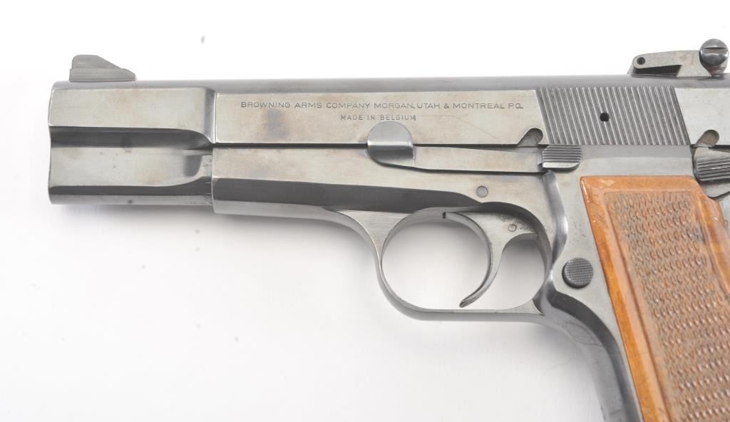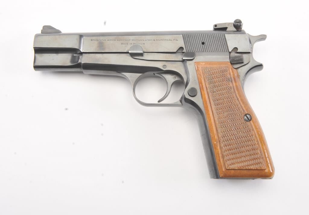 Belgian Browning Hi Power, #72C43743, 9mm cal., with adjustable sights in fine to excellent condition showing minor firing, slight storage and minimal use. 97-99% overall. One hi cap mag (not transferable to CA residents or where prohibited). (Modern/PPT) Est. $750-1500