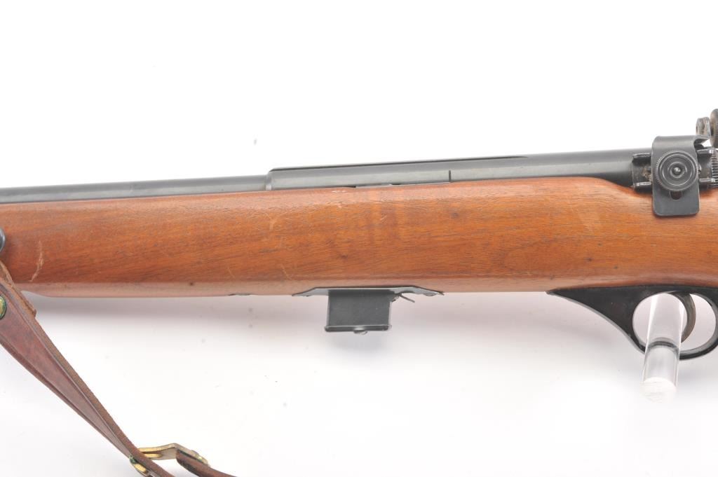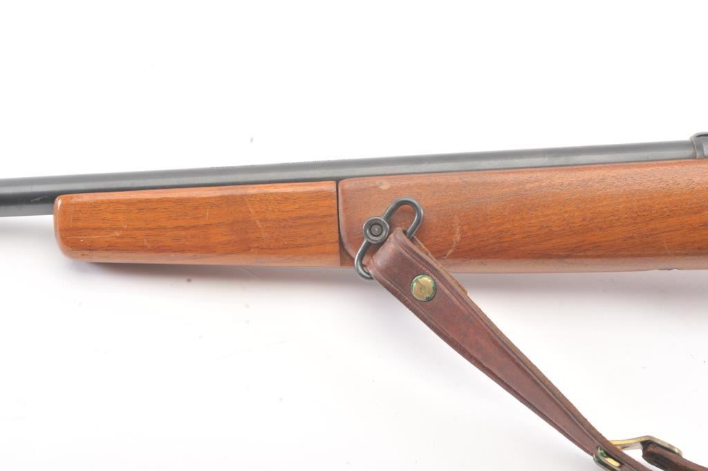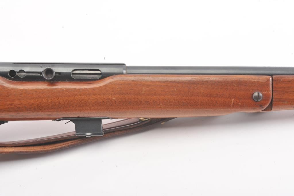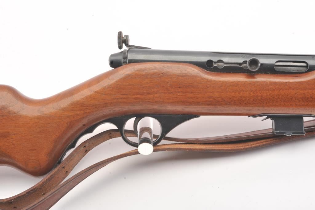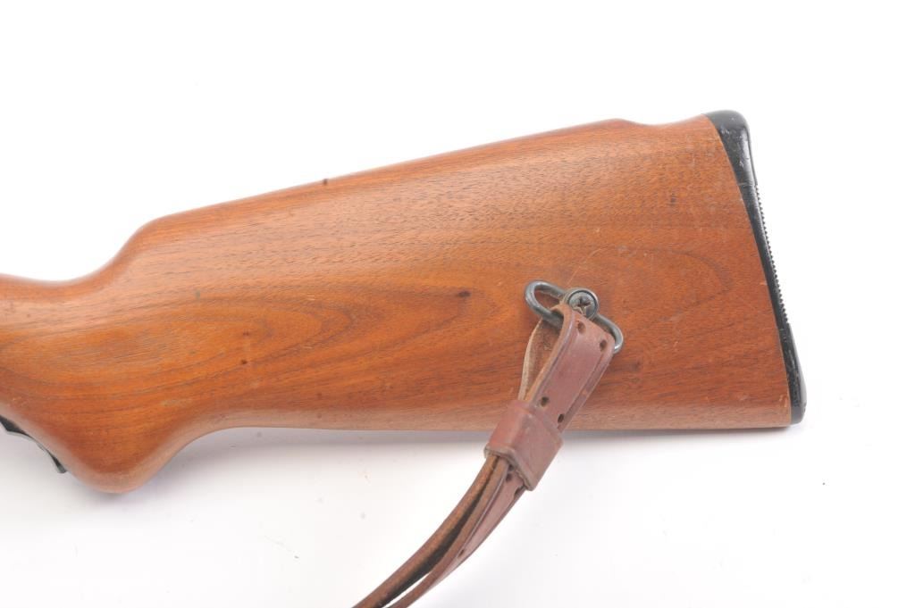 Classic Mossberg Model 152 Semi-Auto Rifle in .22 L.R. with folding hand grip and in near fine used condition. 95%-98% original blue. The stock is very good plus with minor scratches, dings and marks. Leather sling isincluded. Factory peep rear sight. Mechanically sound with bright bore. 1950s-60s. (C&R) Est.: $125-$250