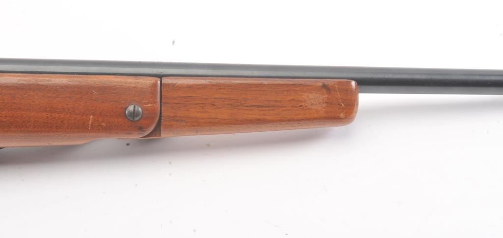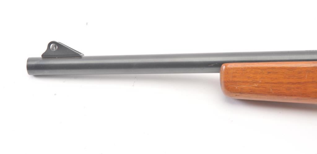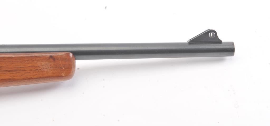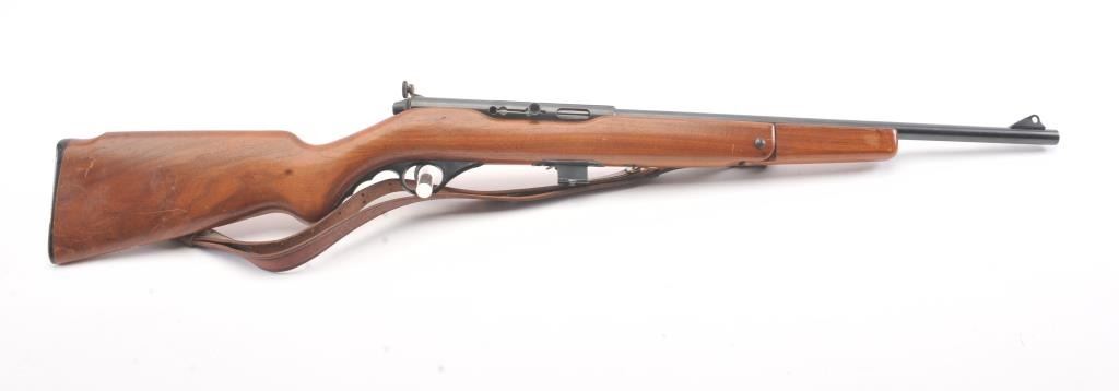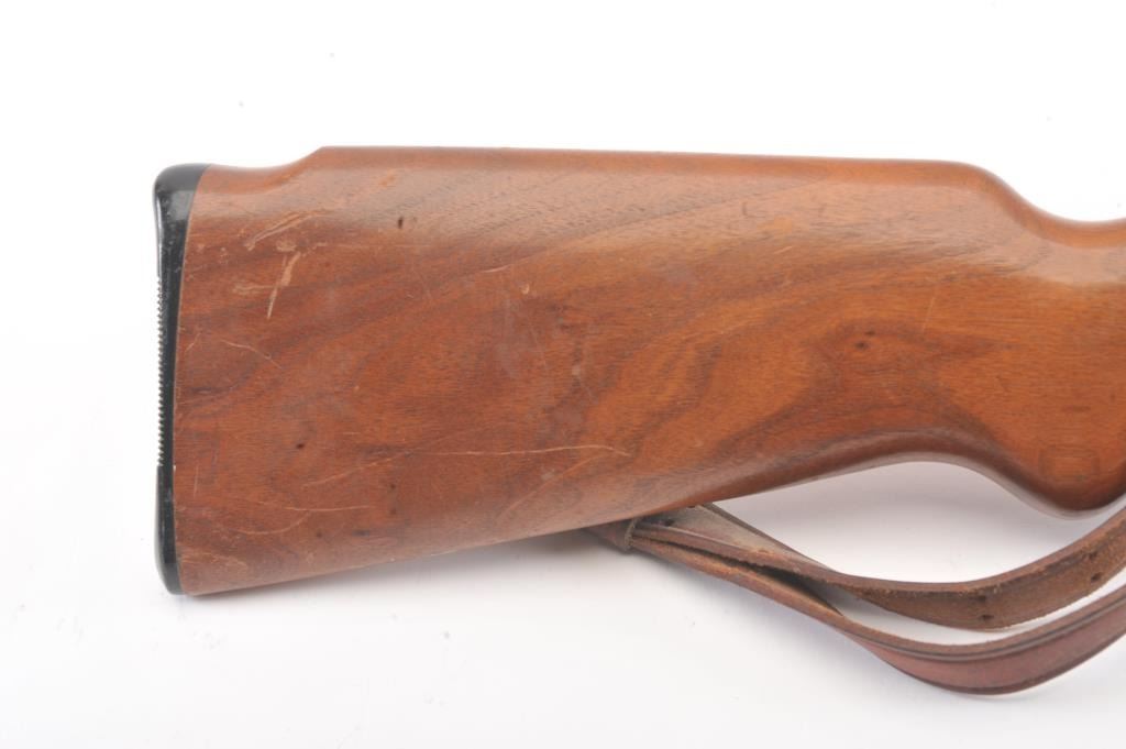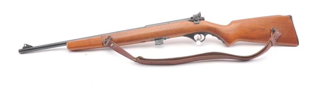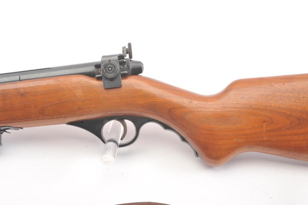 Classic Mossberg Model 152 Semi-Auto Rifle in .22 L.R. with folding hand grip and in near fine used condition. 95%-98% original blue. The stock is very good plus with minor scratches, dings and marks. Leather sling isincluded. Factory peep rear sight. Mechanically sound with bright bore. 1950s-60s. (C&R) Est.: $125-$250