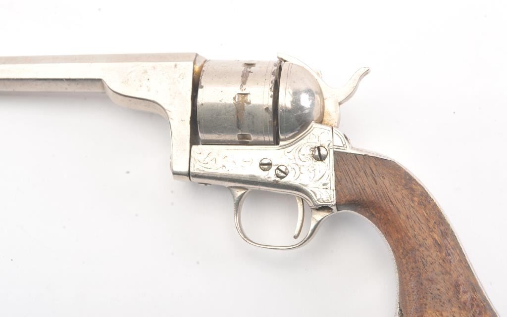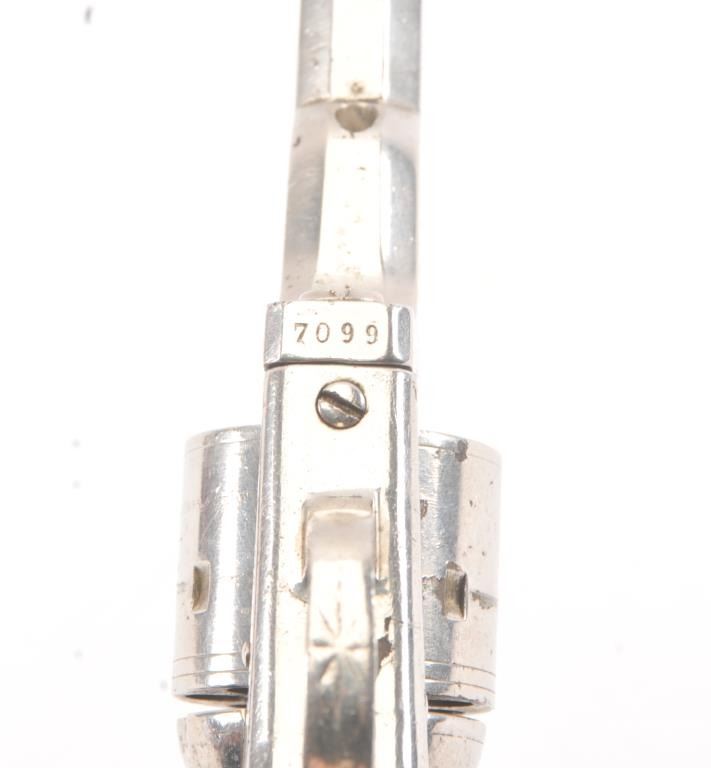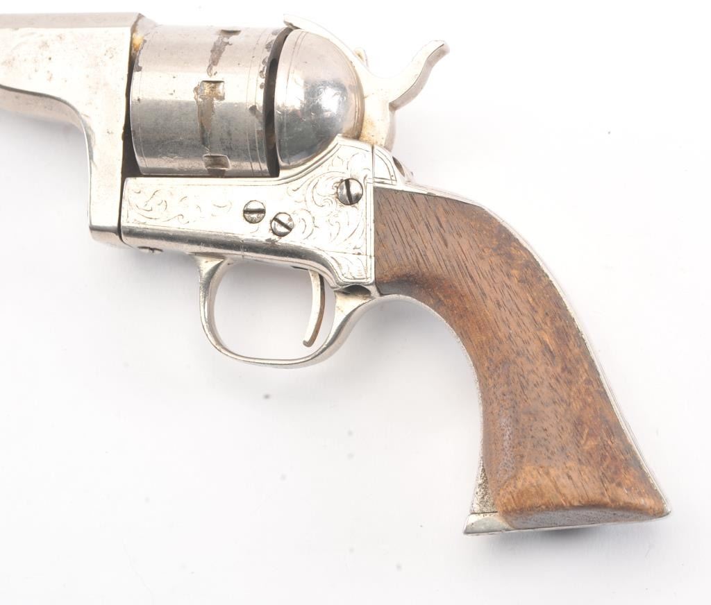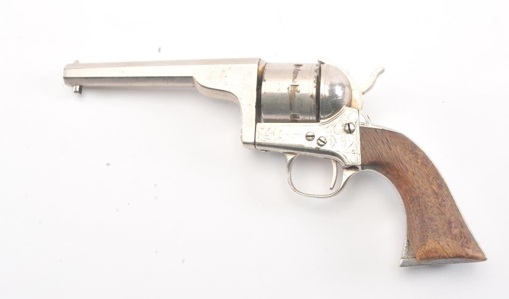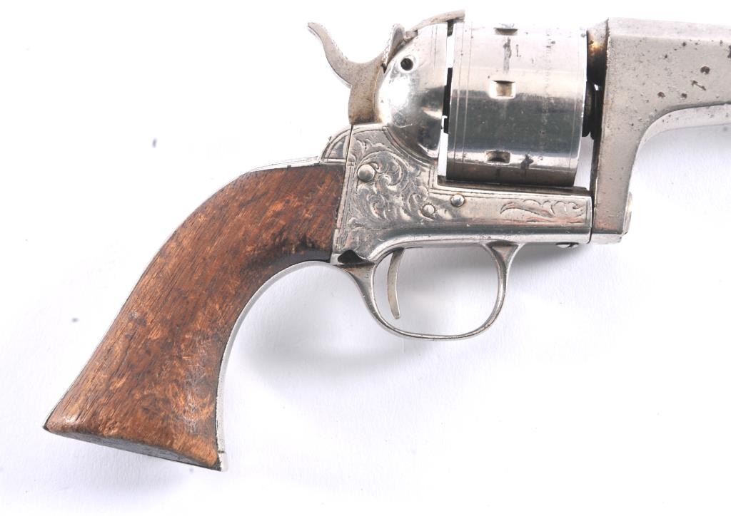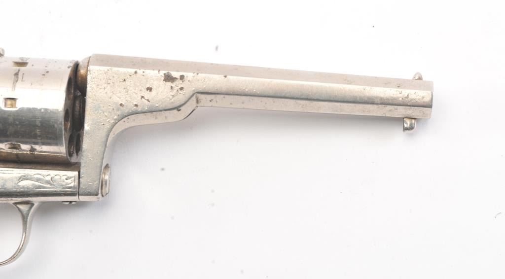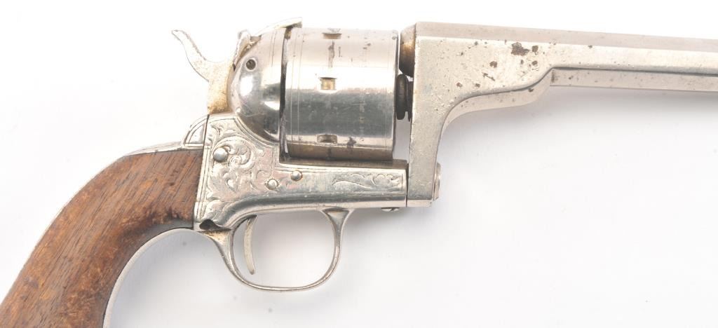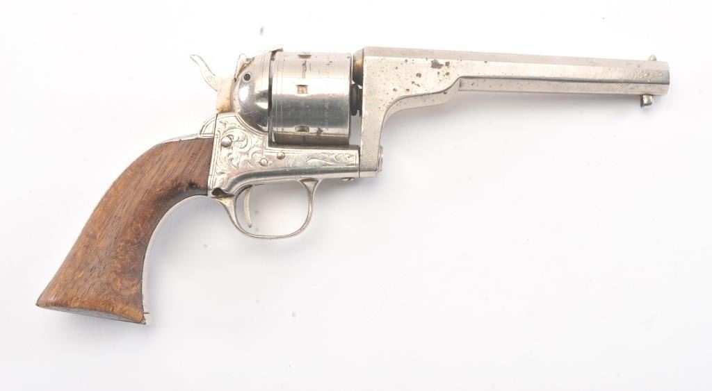 Moore Seven Shot .32 rim-fire revolver marked “Made for Smith & Wesson” on the barrel, S/N 7099. Shows a re-nickeled finish with ejector rod missing and a 5” barrel. Approximately 70%-80% old dulled nickelremains and frame shows polishing but the barrel address and lettering of the patent date 1860 legible on the cylinder. Revolving but not locking up. The grips are chipped and worn fair to good. A significate collector’s item as these S&W marked Moore’s were part of the patent infringement law suit won by S&W over many manufactures giving the a virtual “Lock” on the bored through cylinder. (Antique) Est.: $350-$700