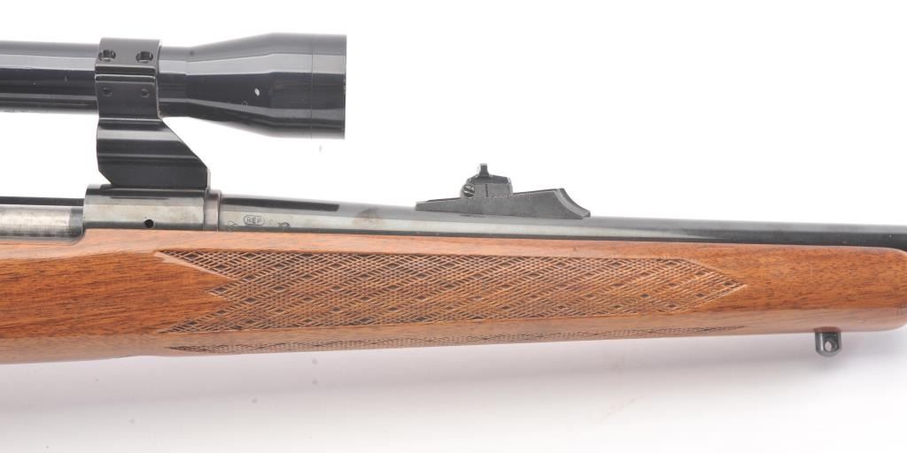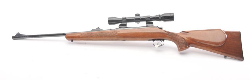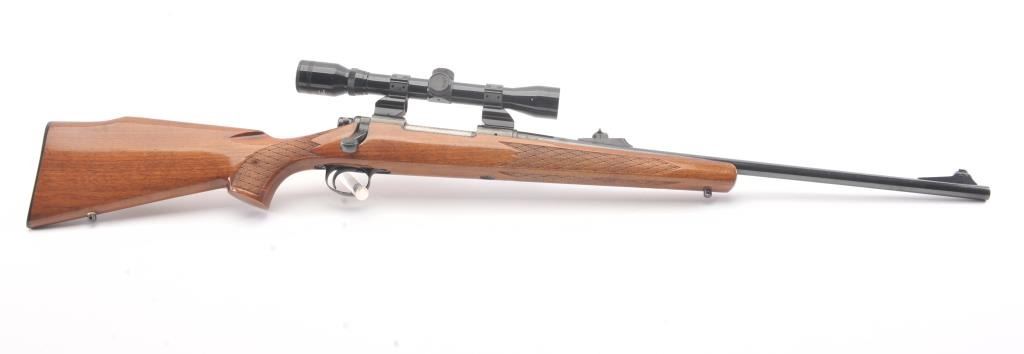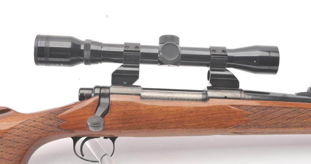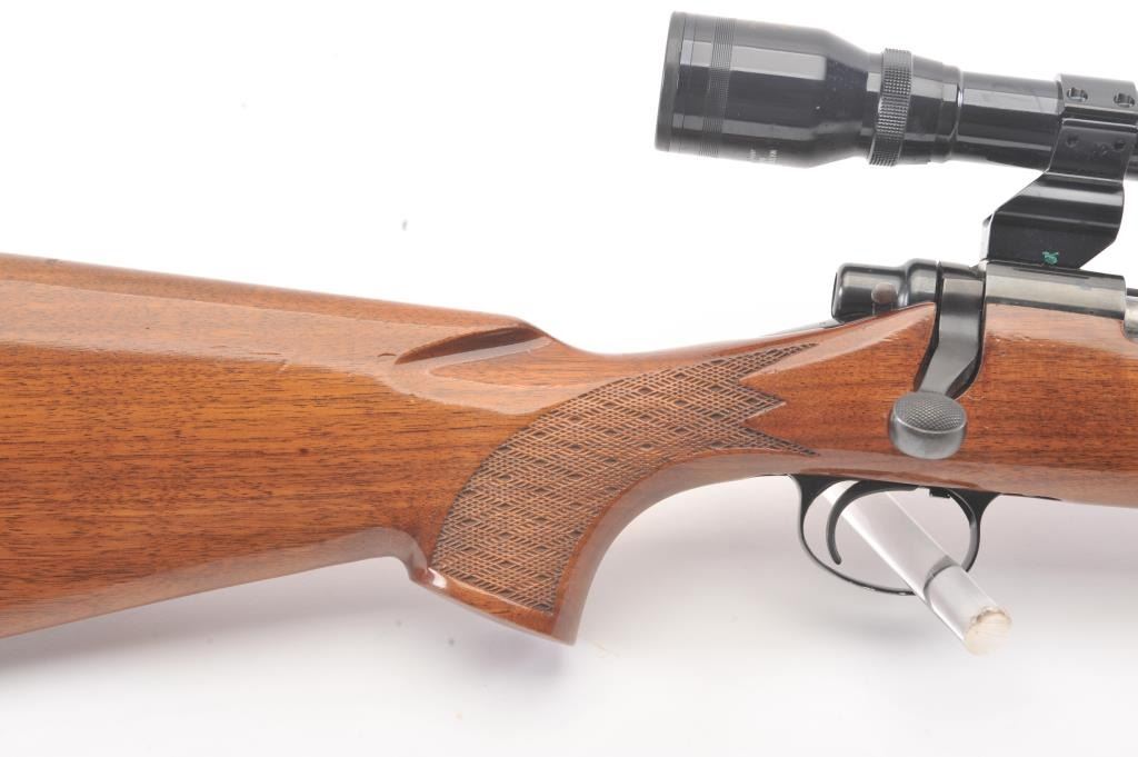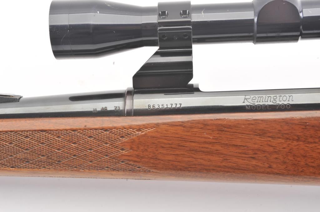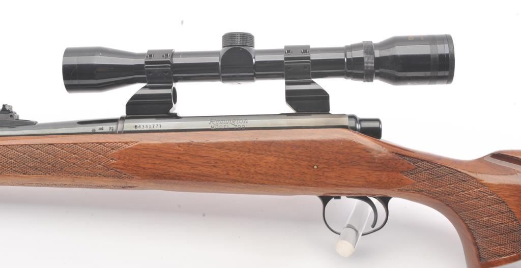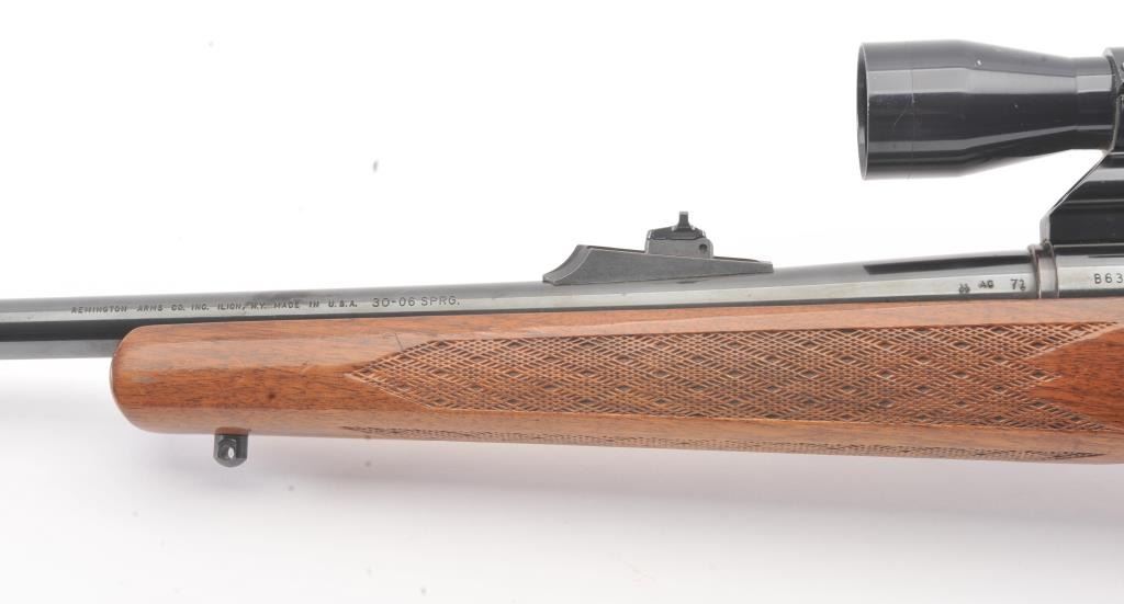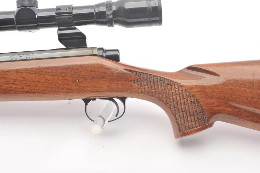Remington model 700, #B6351777, 30-06 cal. bolt action sporting rifle mounted with a Tasco 4x32 scope on look through mounts with rear sight retained. Very good plus used condition with 95-98% blue, minor marks inthe stock. Good bore and shows minor use with original butt plate. Studs for detachable swivels (no swivels). (Modern/PPT) Est. $350-700