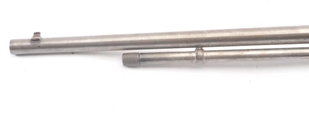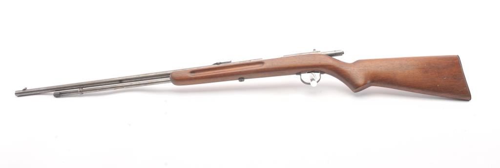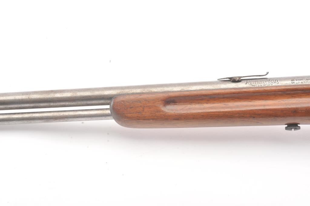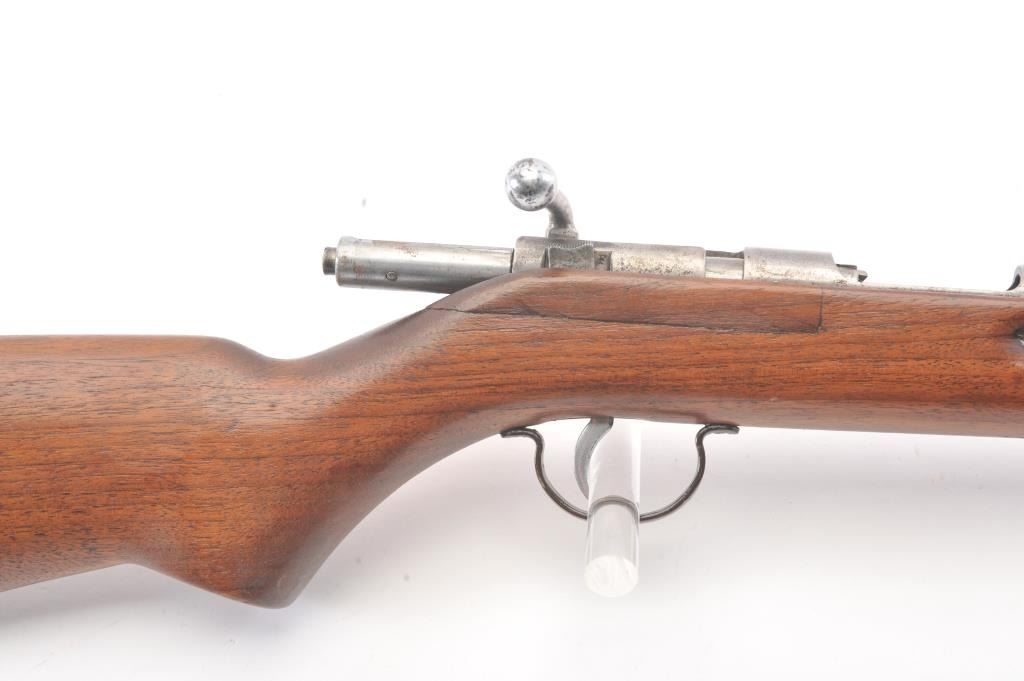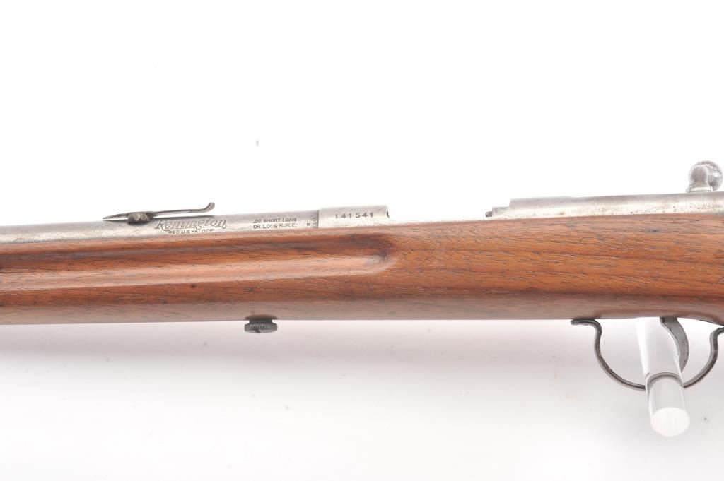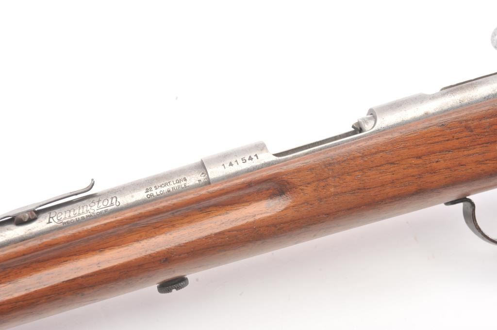 Vintage Remington model 34 single shot rifle, #141541, .22 S, L, LR cal., 24" barrel, blued finish, smooth walnut stock, with steel butt plate. Rifle is in good condition overall, showing virtually no finish. Boreis very good, action is good, stock is very good. (Modern) Est. $75-150