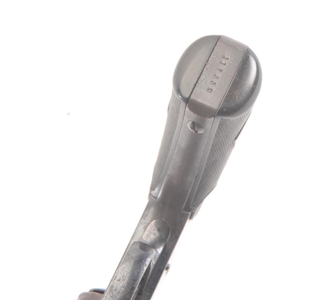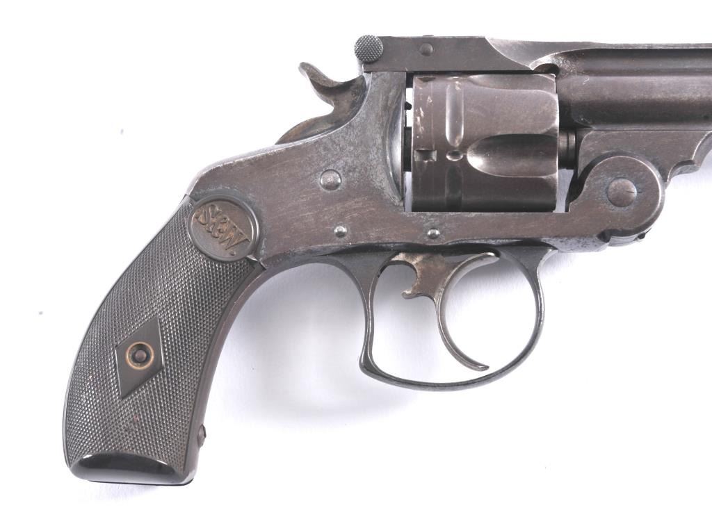 Smith & Wesson .32 tip up revolver, #117552, .32 S&W cal, 4" barrel, blued finish with checkered logo hard rubber grips. The revolver is in good condition overall, with traces of the original finish, mostly a nicebrown patina. The bore is good with some erosion, the action is good. The grips are very good with no chips or cracks. (C&R/PPT) Est. $200-400