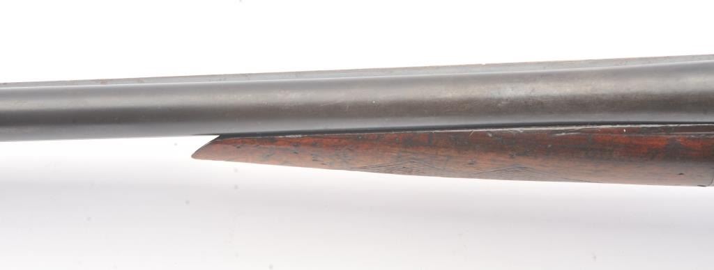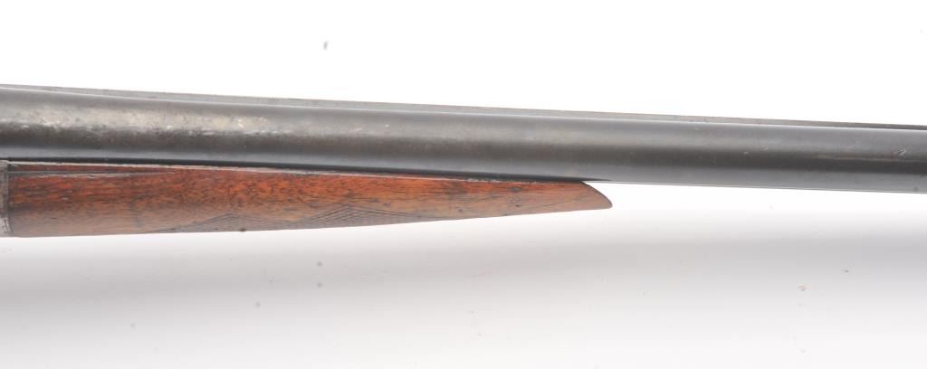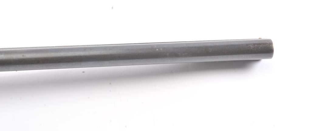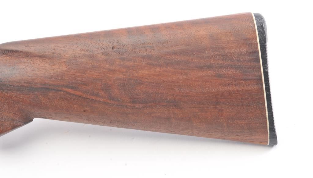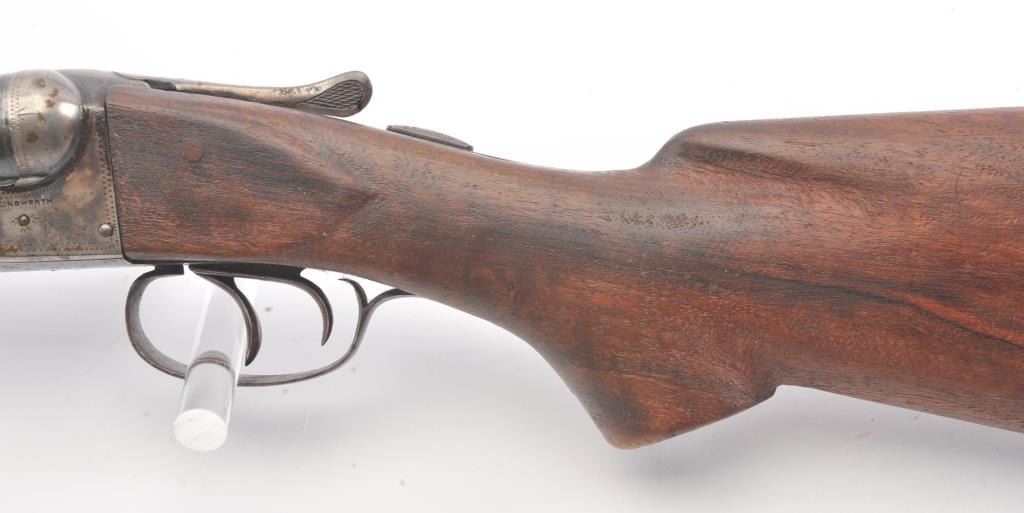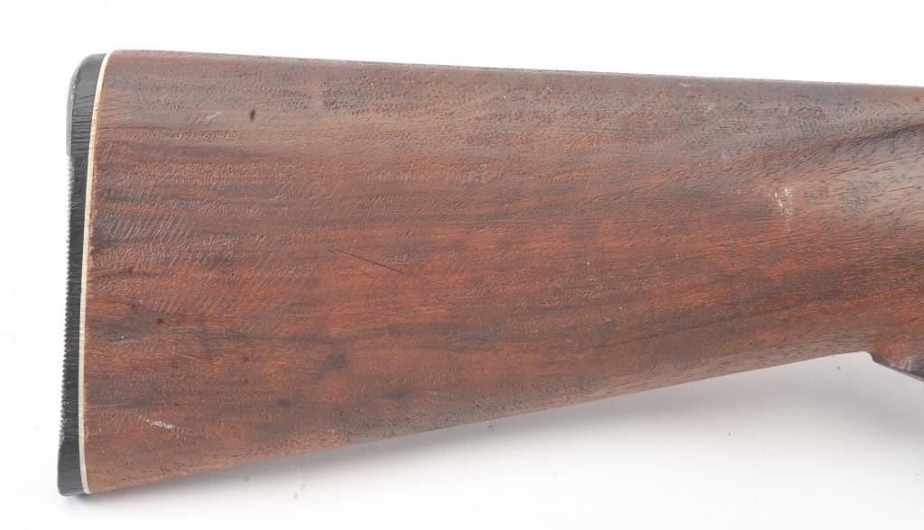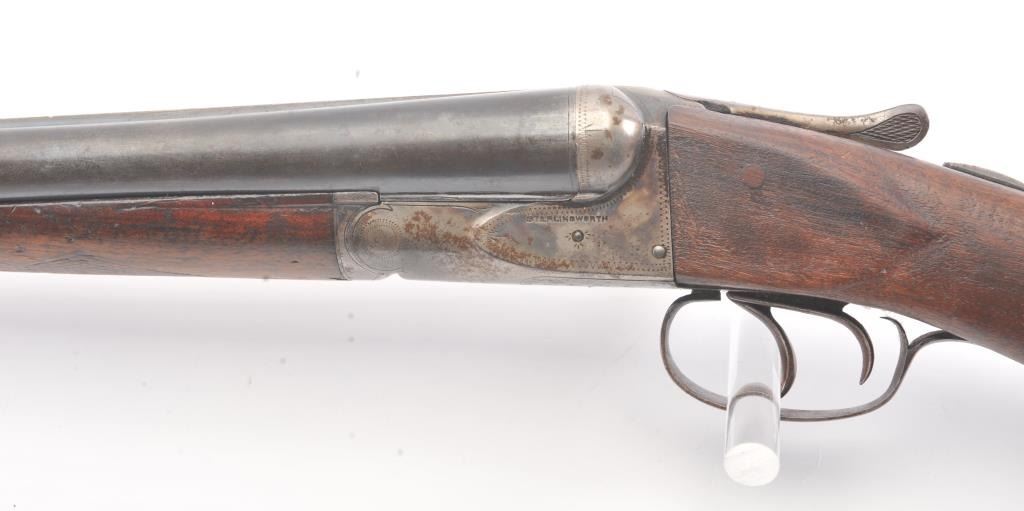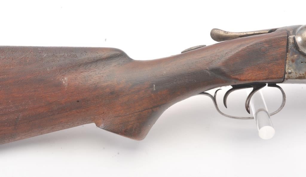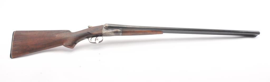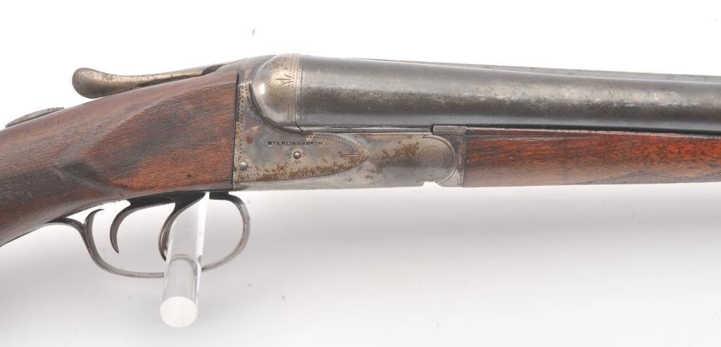 Fox Sterlingworth SxS Shotgun marked “Sterlingworth fluid compressed steel” with Philadelphia address, S/N 85392. The barrels measures 30” and choked full and full along with double triggers and standard extractors. 50%-70% original blue and case colors with minor storage rust and erosion. The butt stock is a poor replacement (Crude). Locks up tight with good bores. A definite wood restoration candidate. (C&R) Est.: $400-$800