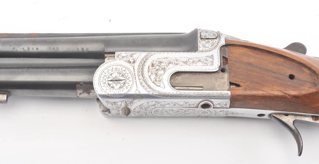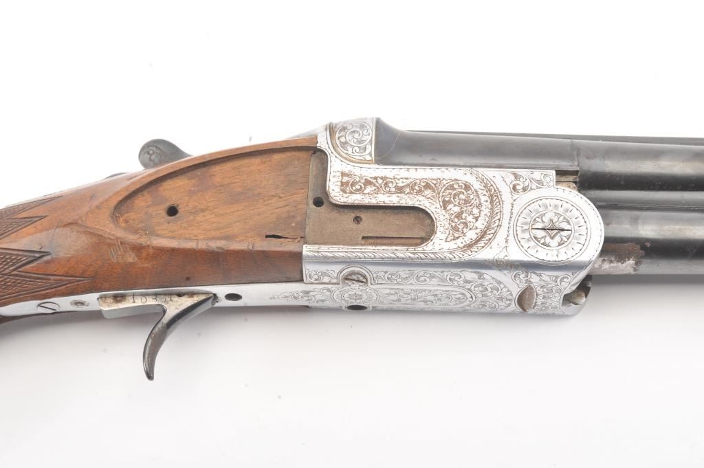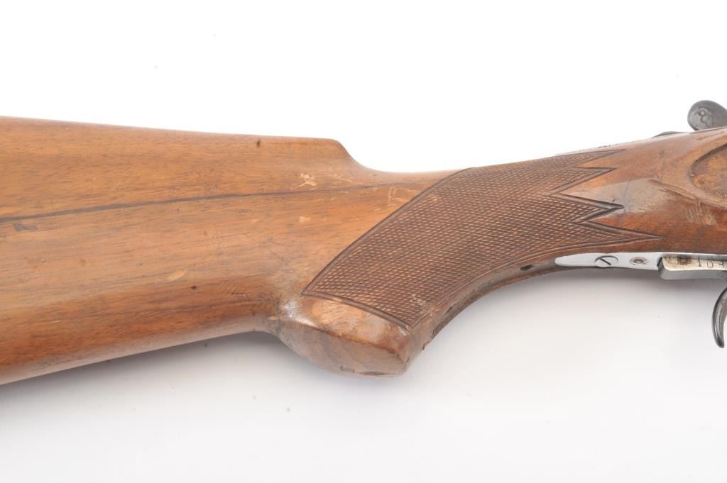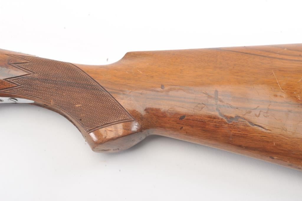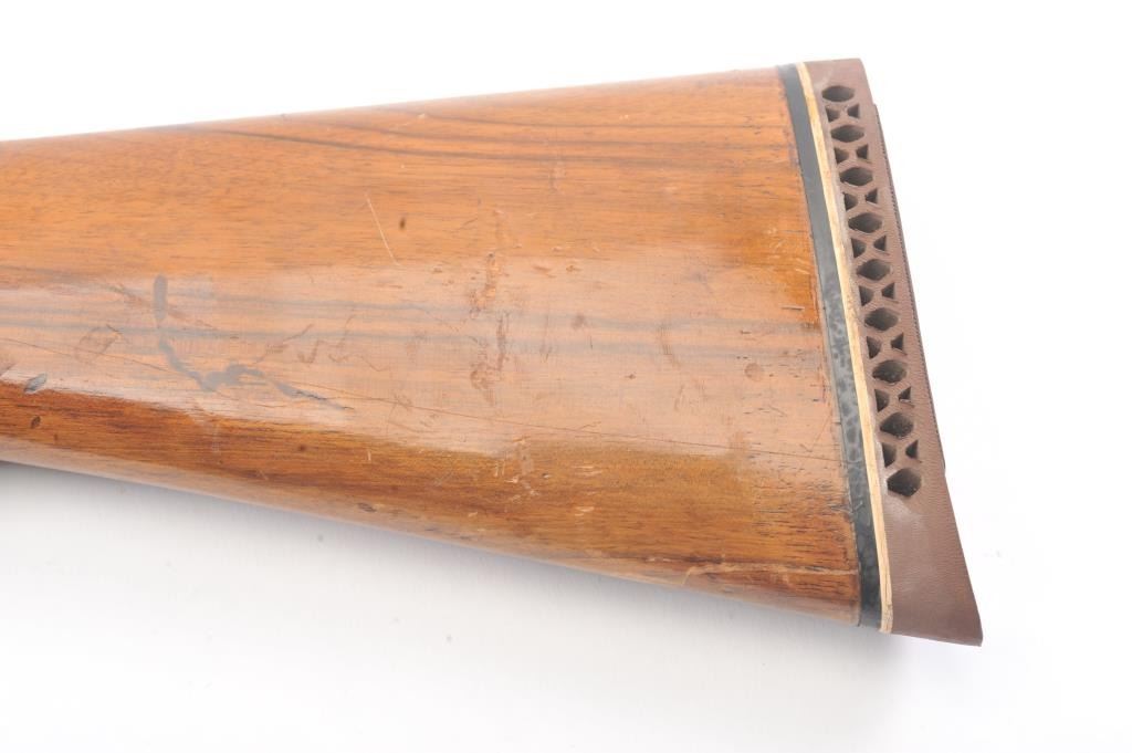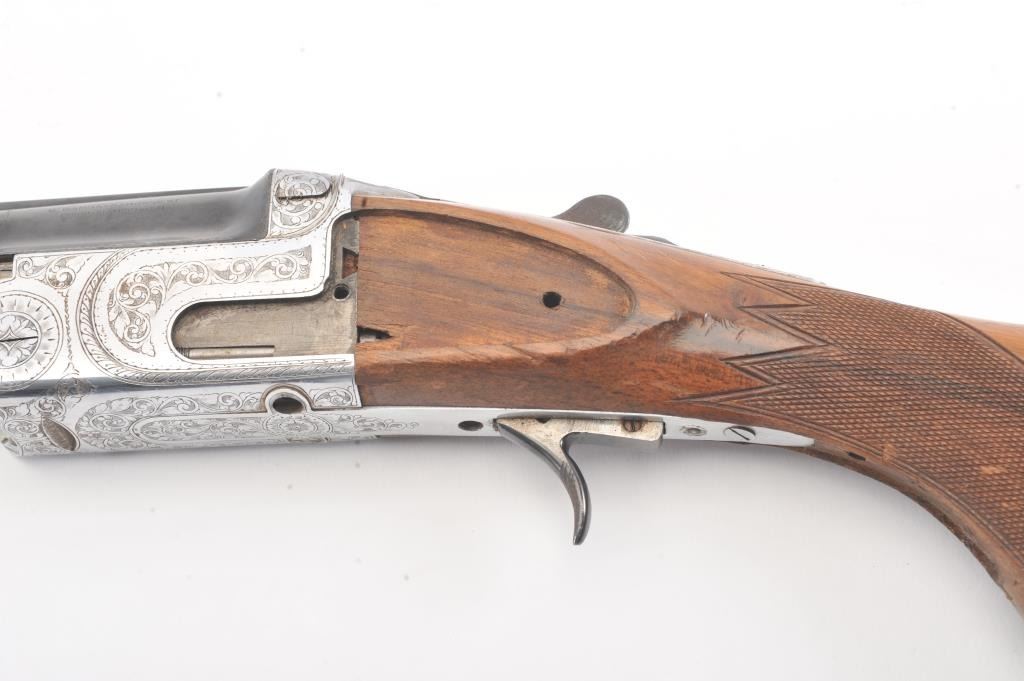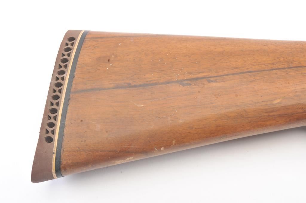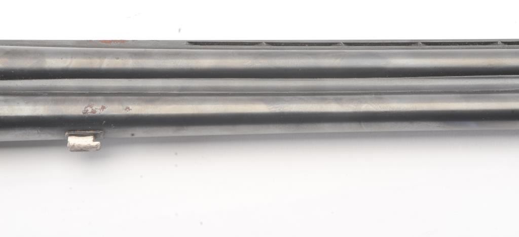 Gamba (Italy) O/U Shotgun in 20 GA with 27 5/8” “Boehler Steel” barrels choked about full over modified with vent rib, auto ejectors, S/N 10831. Missing side plates and trigger guard. Along with some screws andsmall parts. Measures 13 1/8” to the end of the pad. Some storage rust. From estate and parts lost. (Modern) Est.: $100-$200