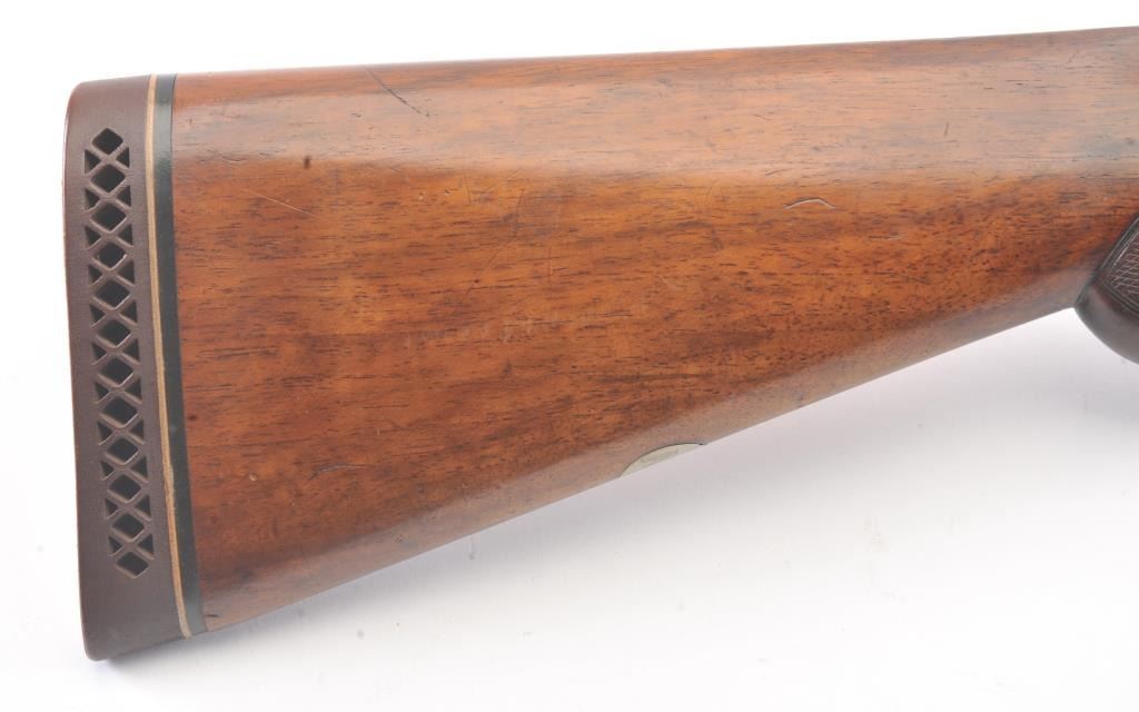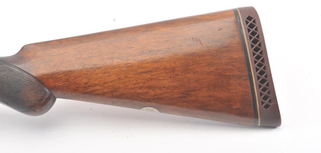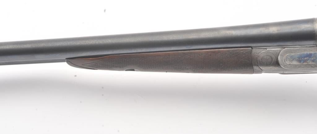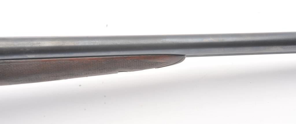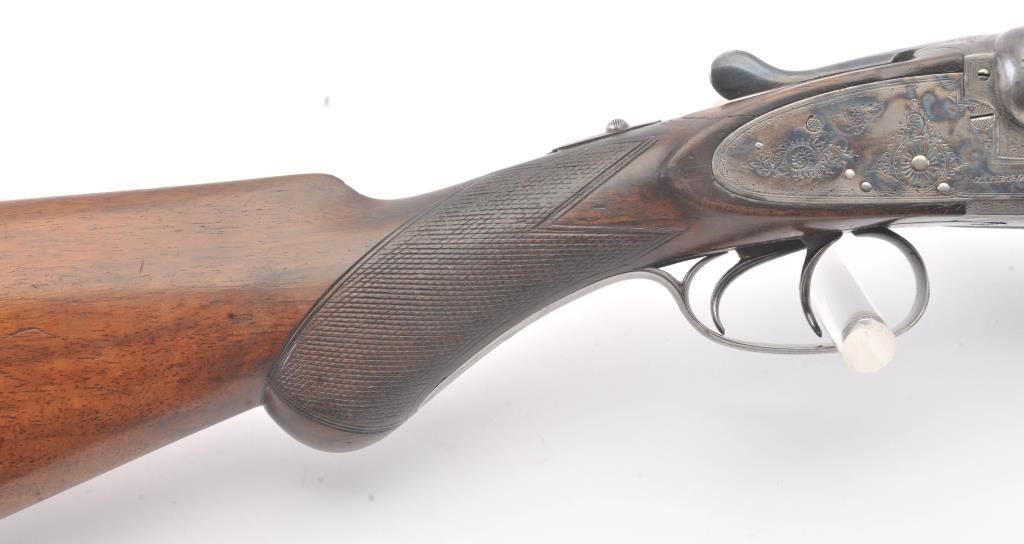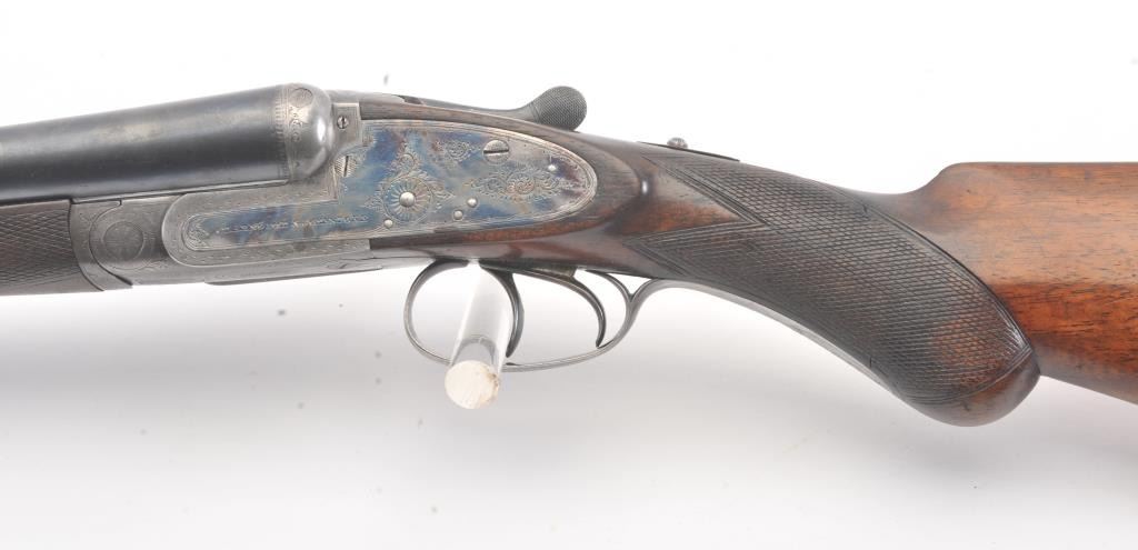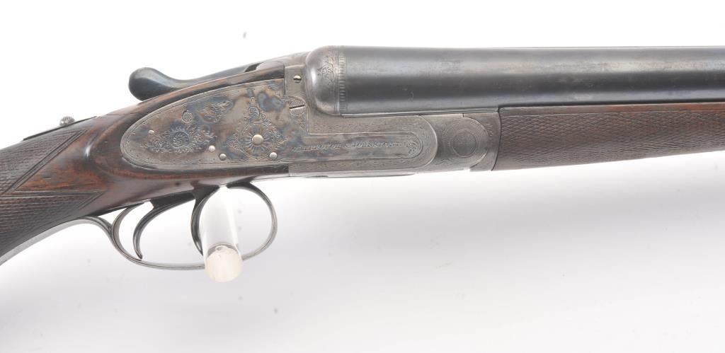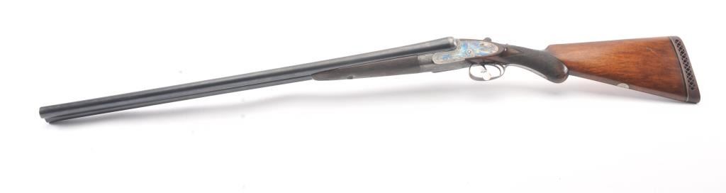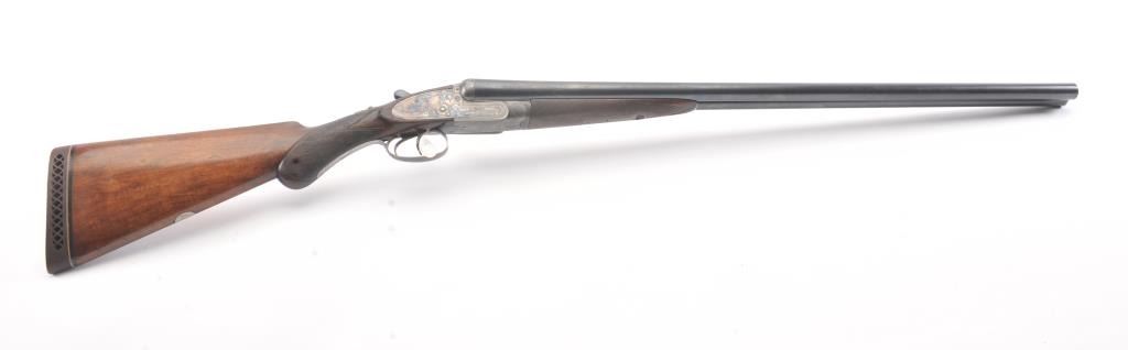 Clabrough & Johnstone SxS hammerless shotgun, 12 gauge, 28” barrels, blue and case hardened finish, checkered wood stocks, hard rubber butt pad, double triggers, #14251 in overall very good to fine condition showingthe majority of its blue finish on barrels and majority of bright case colors on side plates of receiver; fine bores, crisp actions, sharp markings and very good + wood stocks showing an old hairline crack on right top side of the butt stock piece that runs between the upper tang and the right side lock plate; with “A.C.K.” initials inscribed in the silver escutcheon on the underside of the butt stock; a beautiful Clabrough &Johnstone with IC left and Full right chokes. (C&R). Est.: $600-$1200