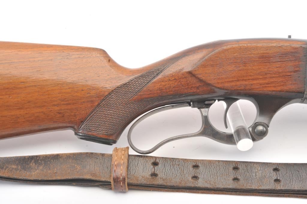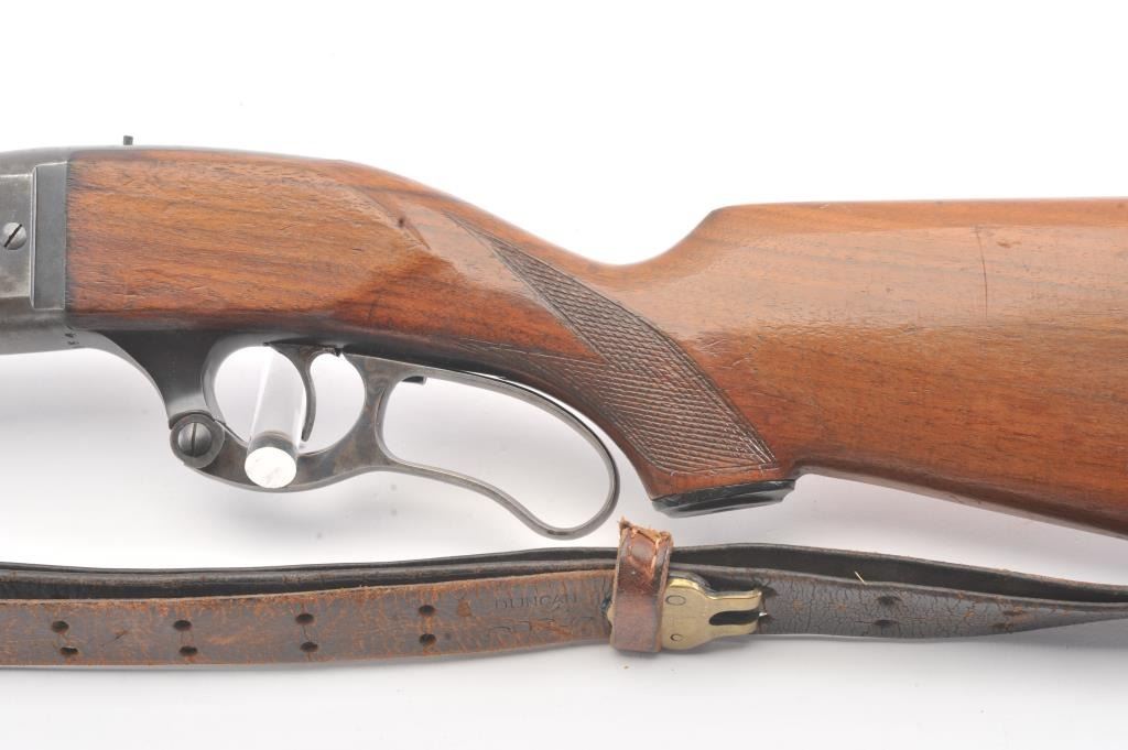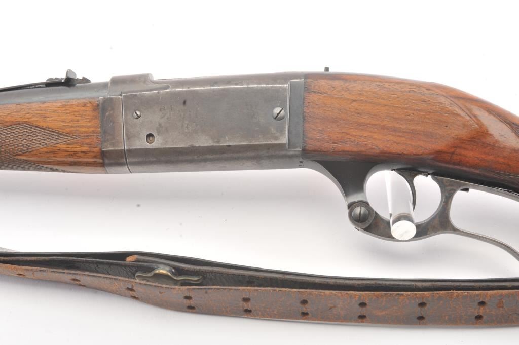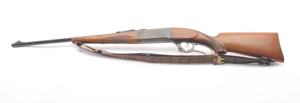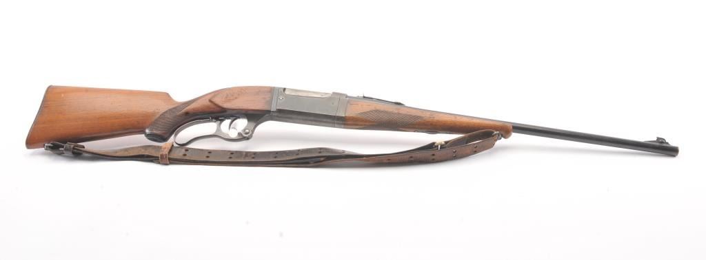 Savage Model 99 Takedown rifle in .250-3000 caliber remaining in good condition, S/N 329054. 40%-60% original blue drifted on the frame and going to a gray patina. Minor erosion and normal aging. Good checkered wood stocks with minor dings, mars and scratches. Added sling and swivels. Correct butt plate and sight. Tight action and bright bore. Join for takedown also tight. Desirable collector’s item that are still wayundervalued compared to vintage Winchester levers. 30%-50% case colors on the lever. Some minor scratching in the stock. (C&R) Est.: $400-$800