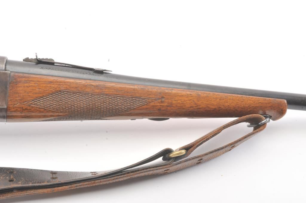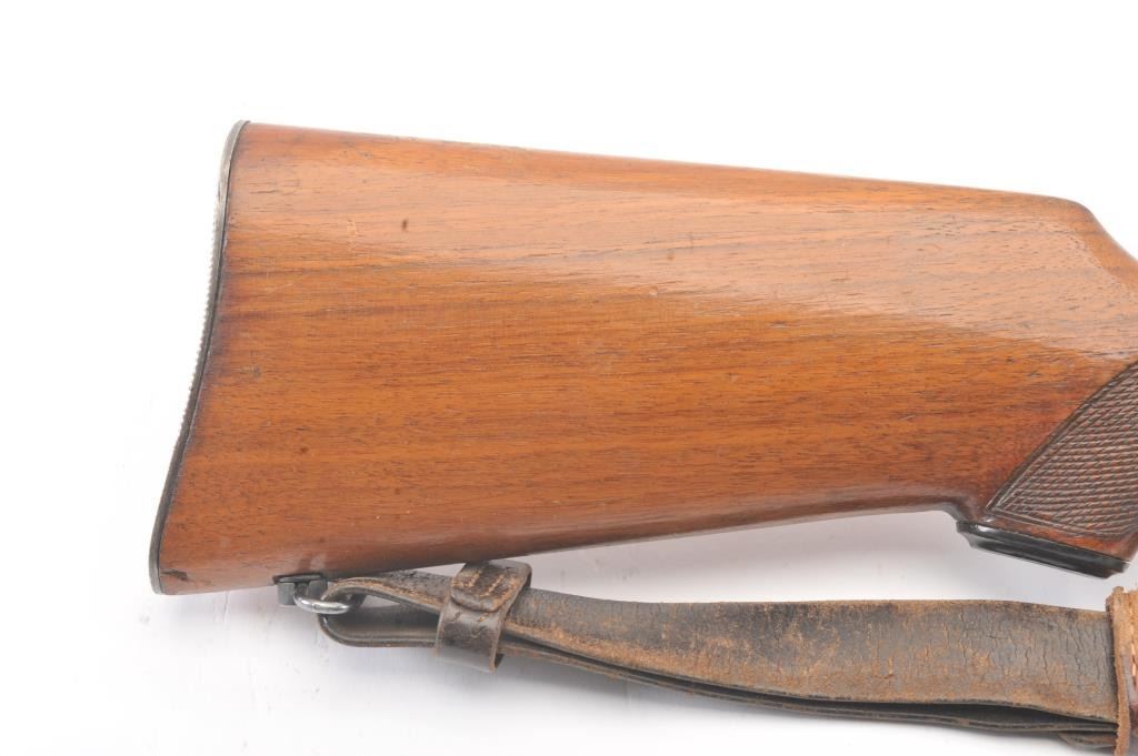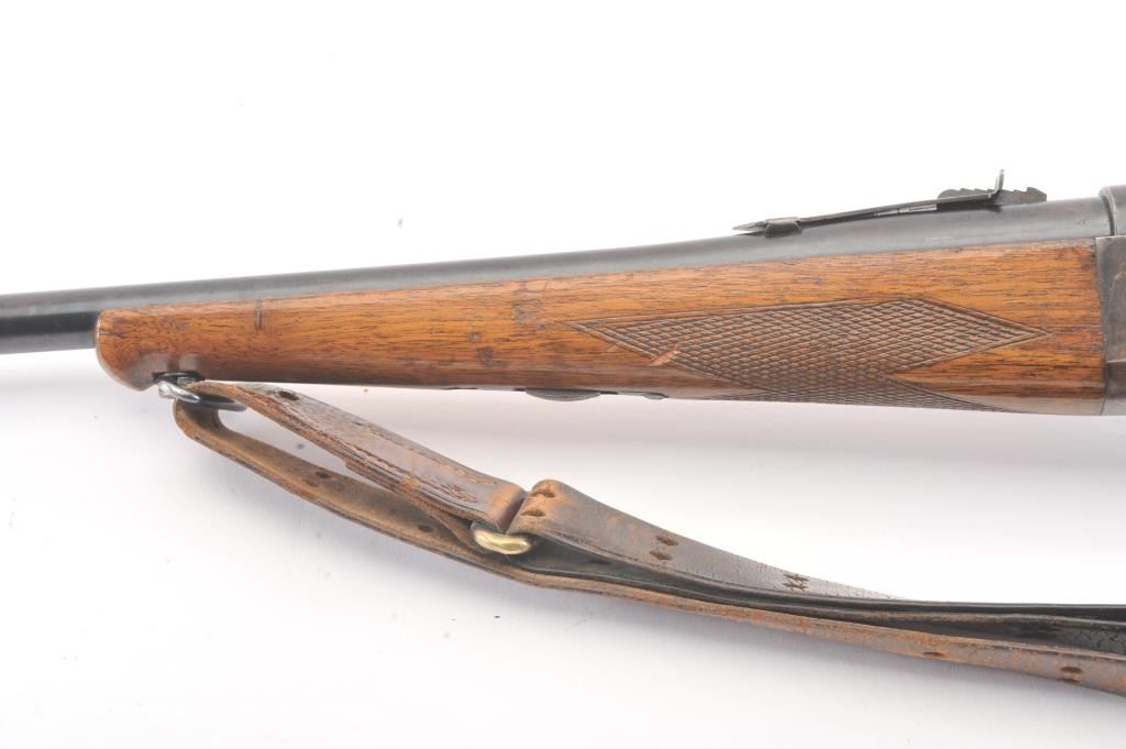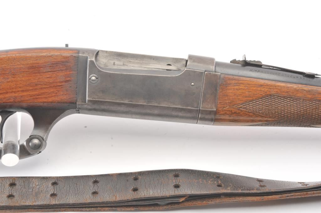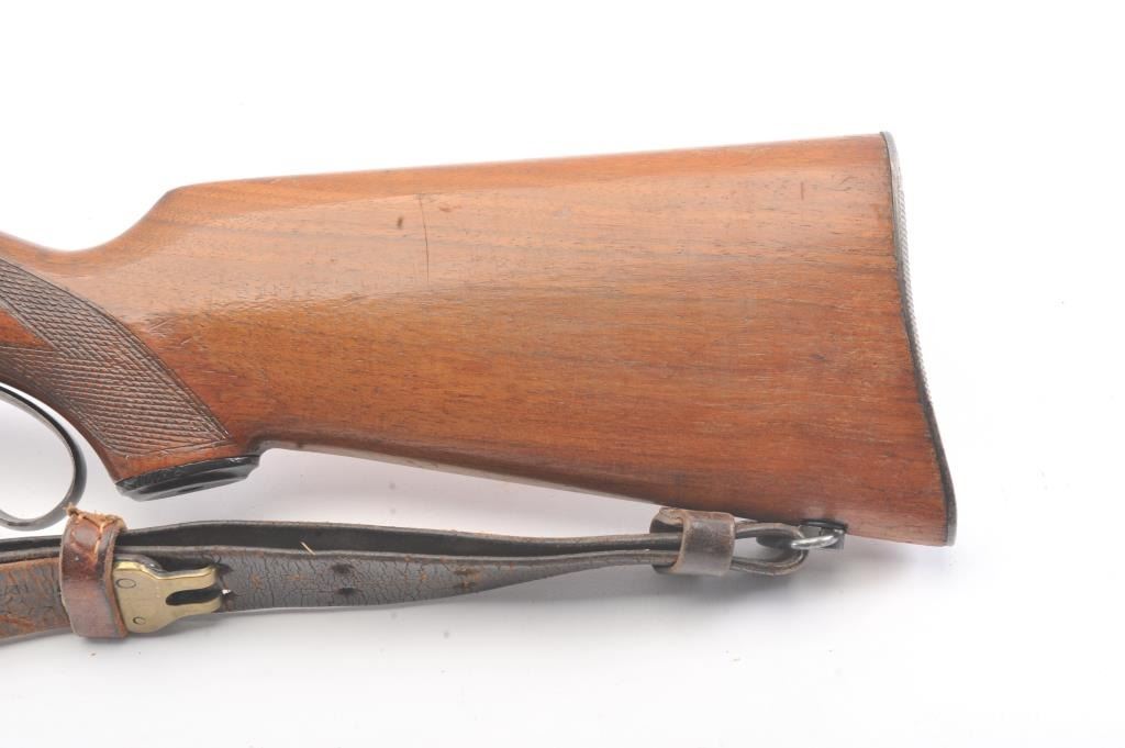 Savage Model 99 Takedown rifle in .250-3000 caliber remaining in good condition, S/N 329054. 40%-60% original blue drifted on the frame and going to a gray patina. Minor erosion and normal aging. Good checkered wood stocks with minor dings, mars and scratches. Added sling and swivels. Correct butt plate and sight. Tight action and bright bore. Join for takedown also tight. Desirable collector’s item that are still wayundervalued compared to vintage Winchester levers. 30%-50% case colors on the lever. Some minor scratching in the stock. (C&R) Est.: $400-$800