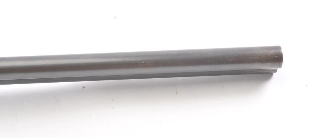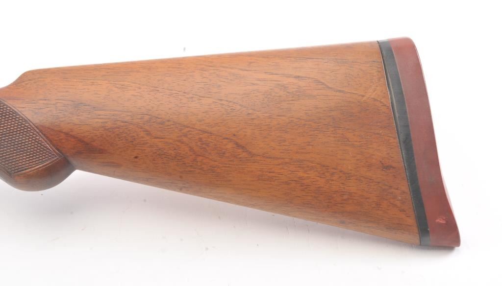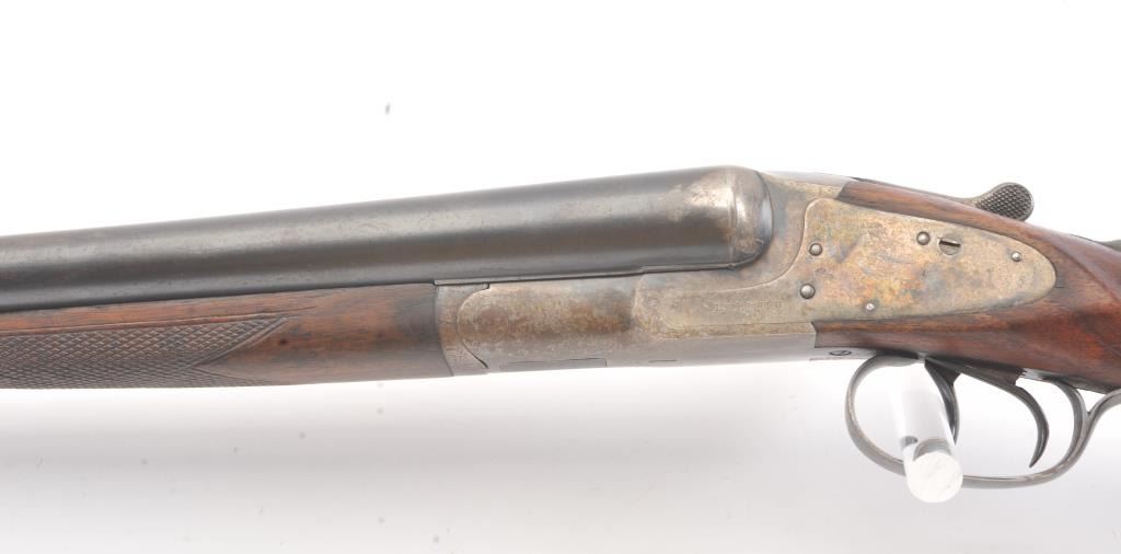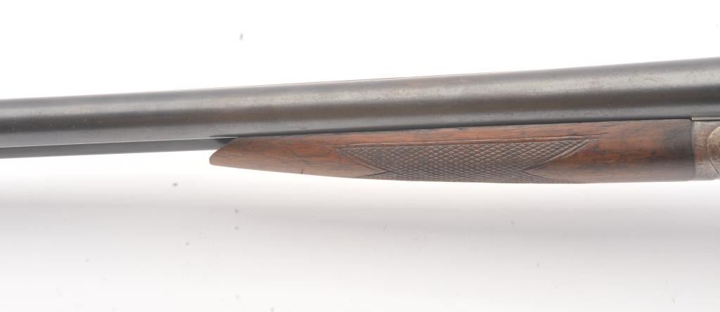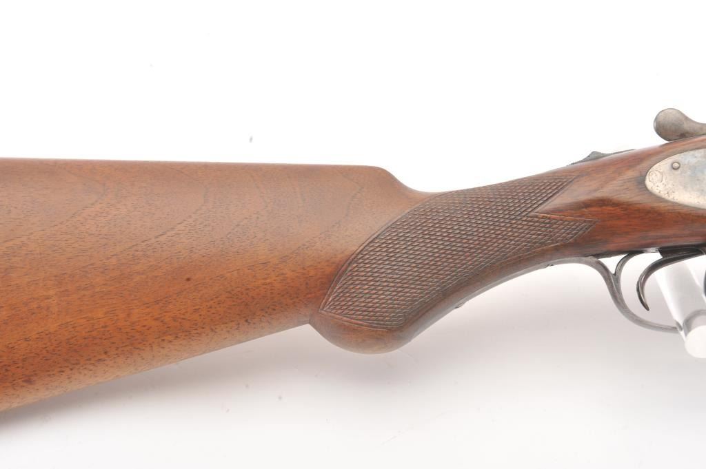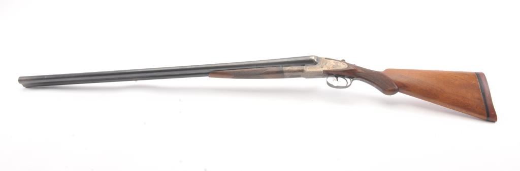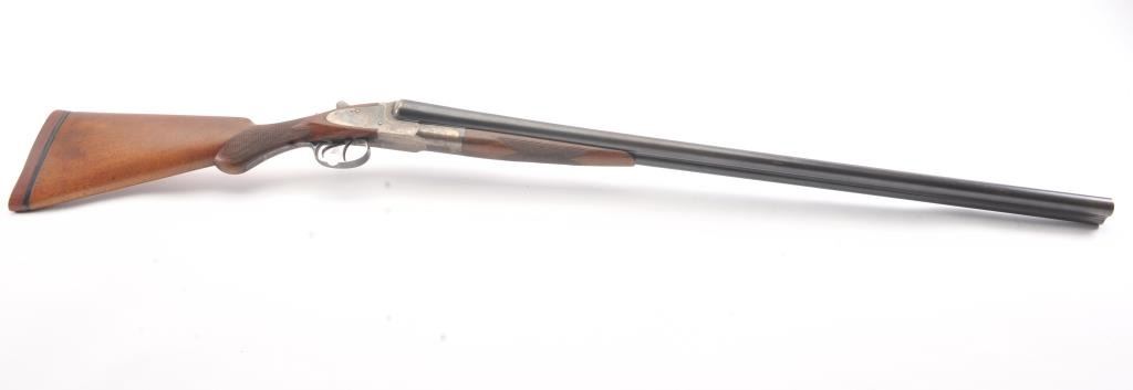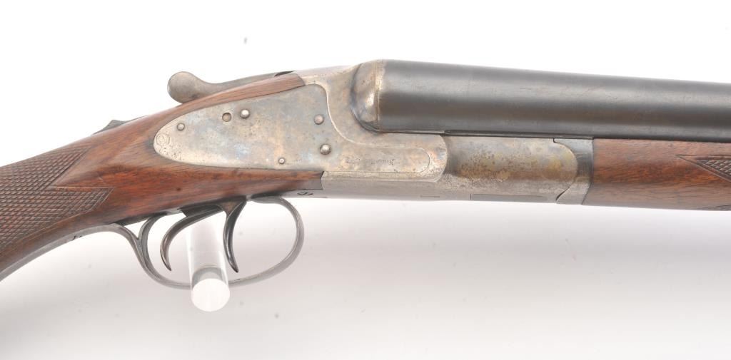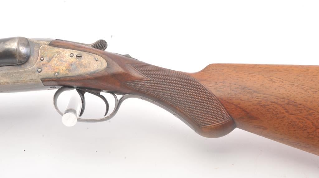 L.C. Smith by Hunter Arms Co. SxS shotgun in 12GA with 32” barrels choked modified and full, Field grade, double triggers and standard extractors, S/N 311573. “OO” marked on the frame and water table. Good to verygood overall condition with 75%-85% original blue and 30%-50% case colors showing some good rainbows. Checkered pistol gripped stock is good with normal wear and fairly sharp checkering. Measures 14 ¼” to the end of thewood and 14 7/8” to the end of the pad. Locks up tight and bright bores. Shows use and firing but generally very good overall. (Modern) Est.: $350-$700