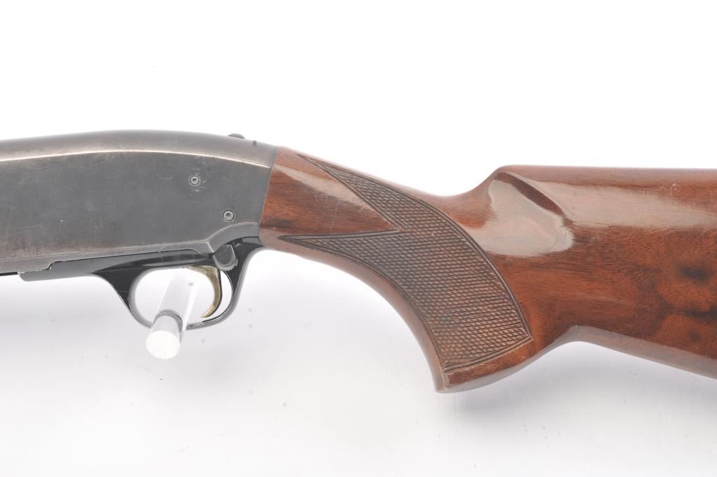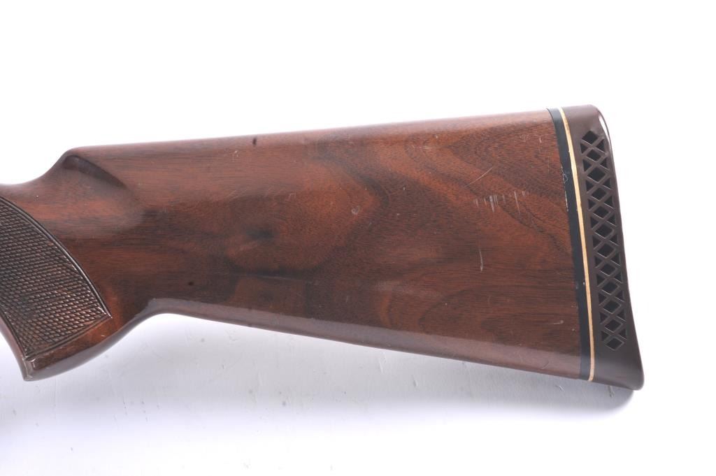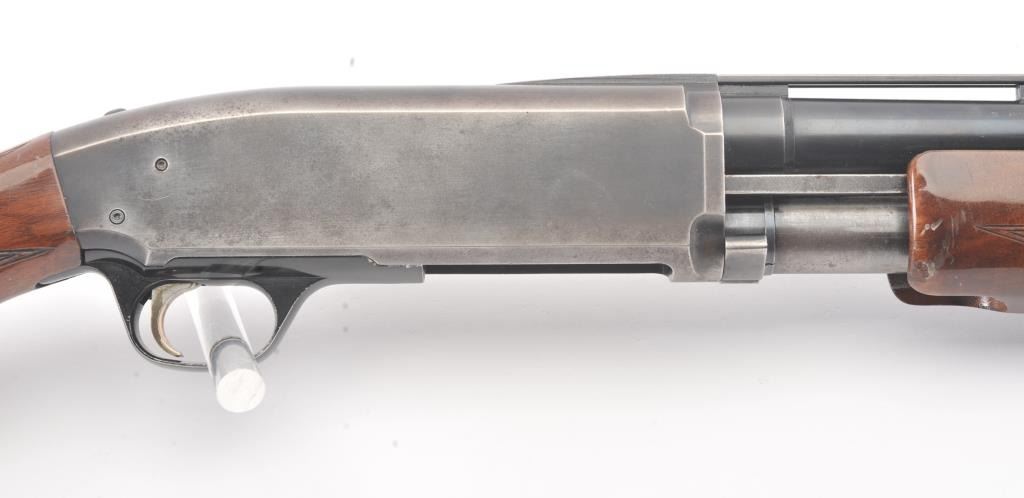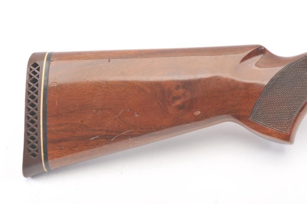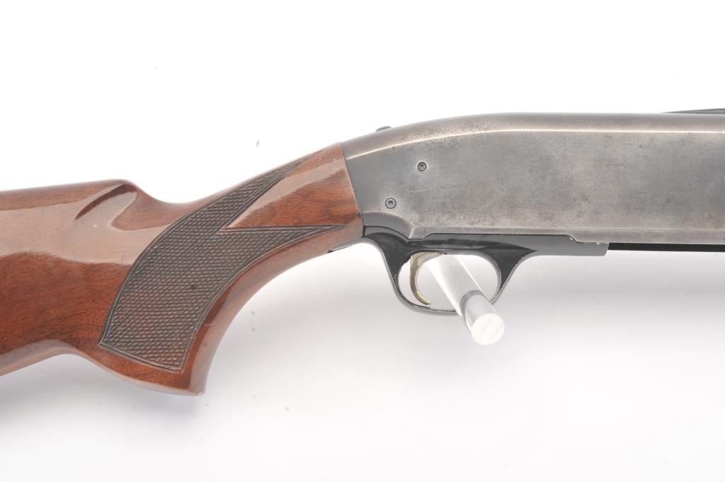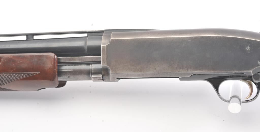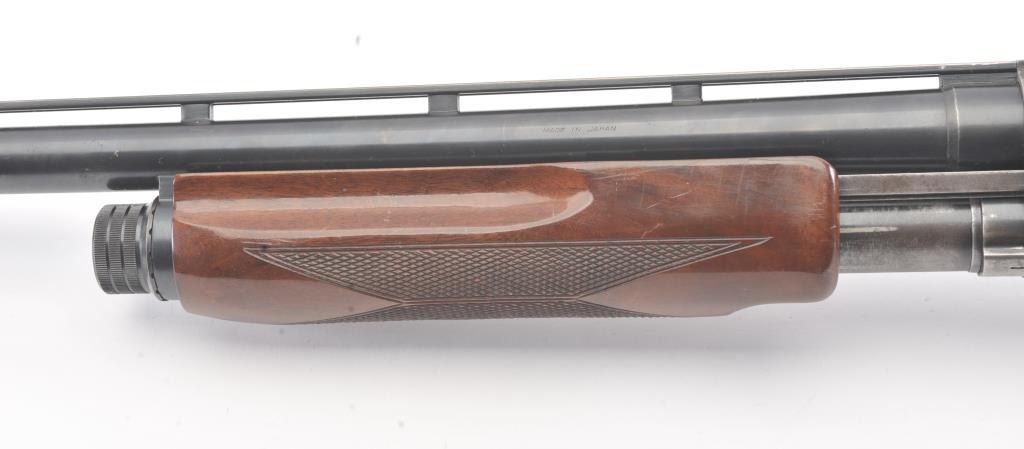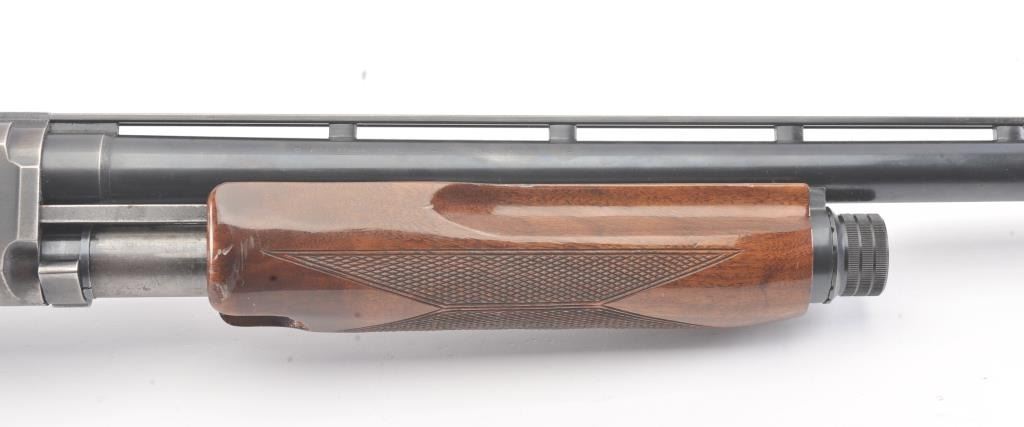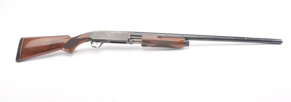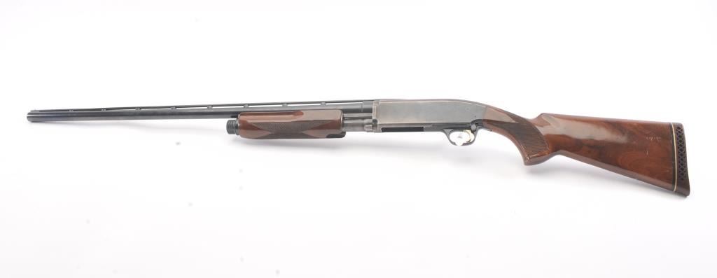 Browning B.P.S. Pump Action Shotgun in 12 GA with 30” vent rib barrel choked about extra full and marked for 2 ¾” or 3” shells. Good with considerable blue wear and use. The frame shows 50%-70% and the barrel 75%-85%.Stocks good with scratches, mars, and dings. Good action and bore. Very serviceable older model. (Modern) Est.: $200-$400