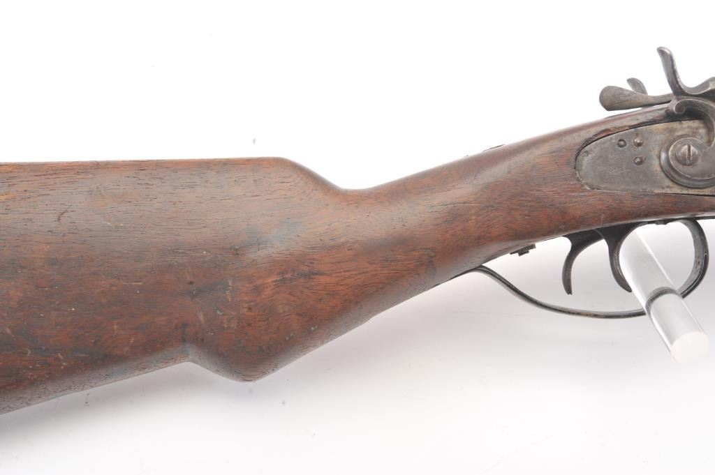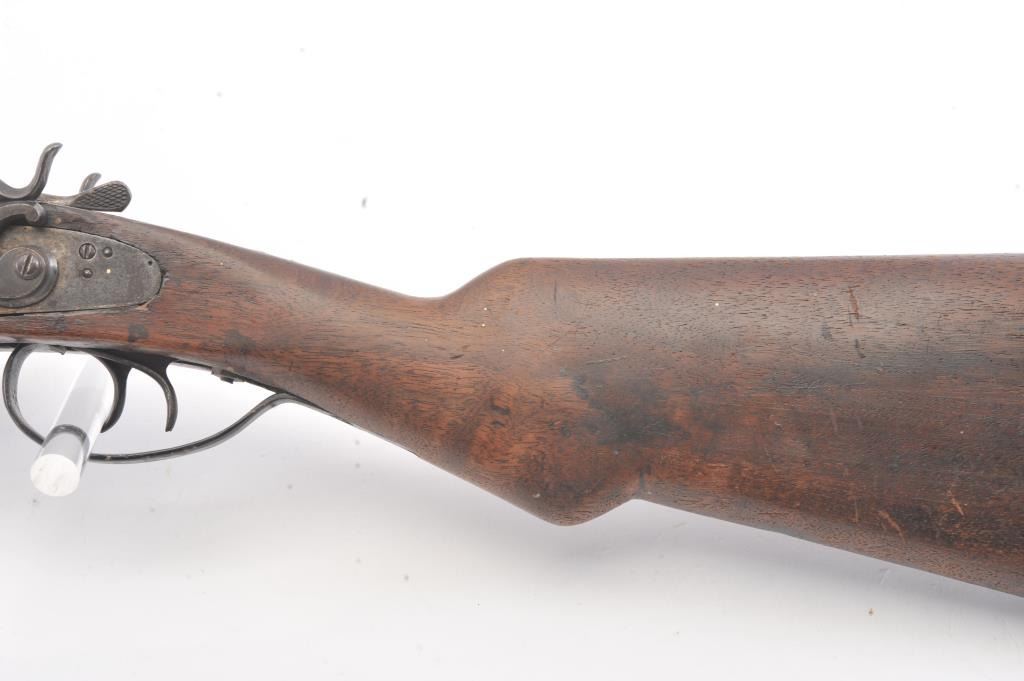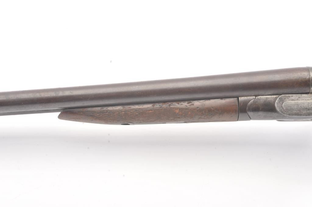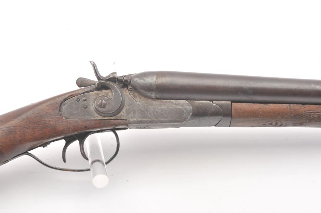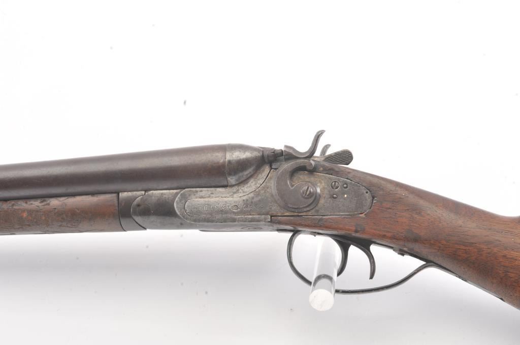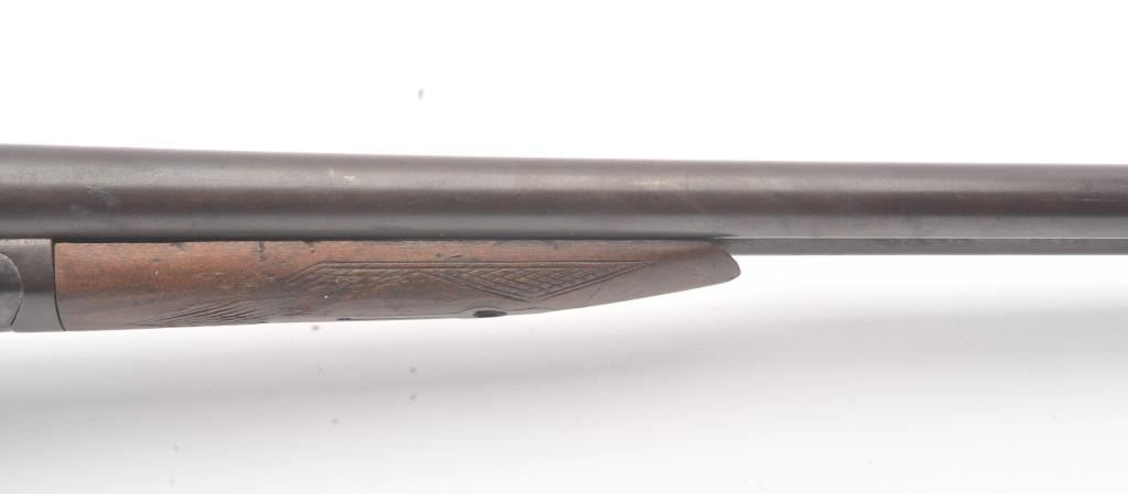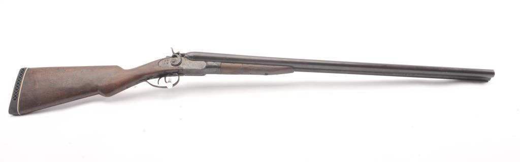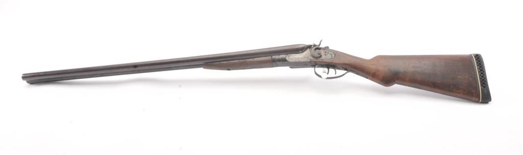 Worthington Arms Co. SxS exposed hammer 12 GA shotgun circa 1880s-90s. The metal is good with brown patina and minor pitting. Several replacement screws and recoil pad added. Locks up tight, hammers work, and bores shiny and at least good. (Antique) Est.: $100-$200
