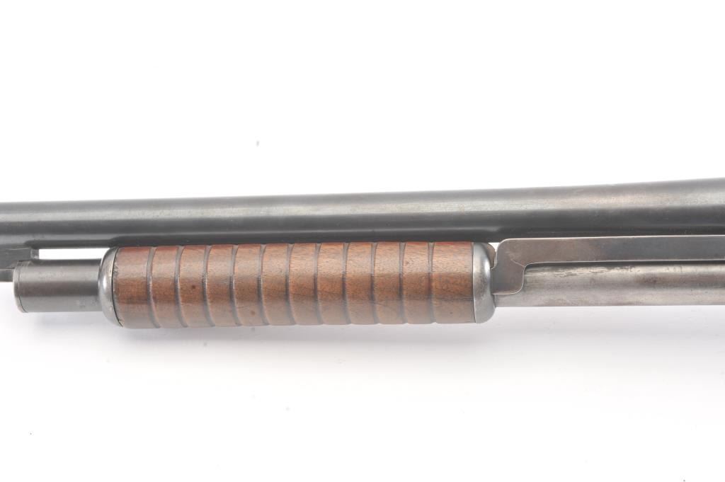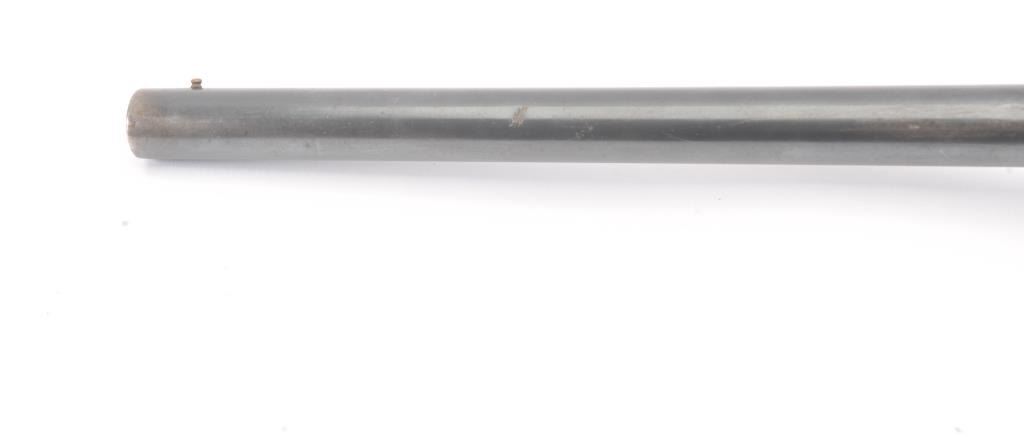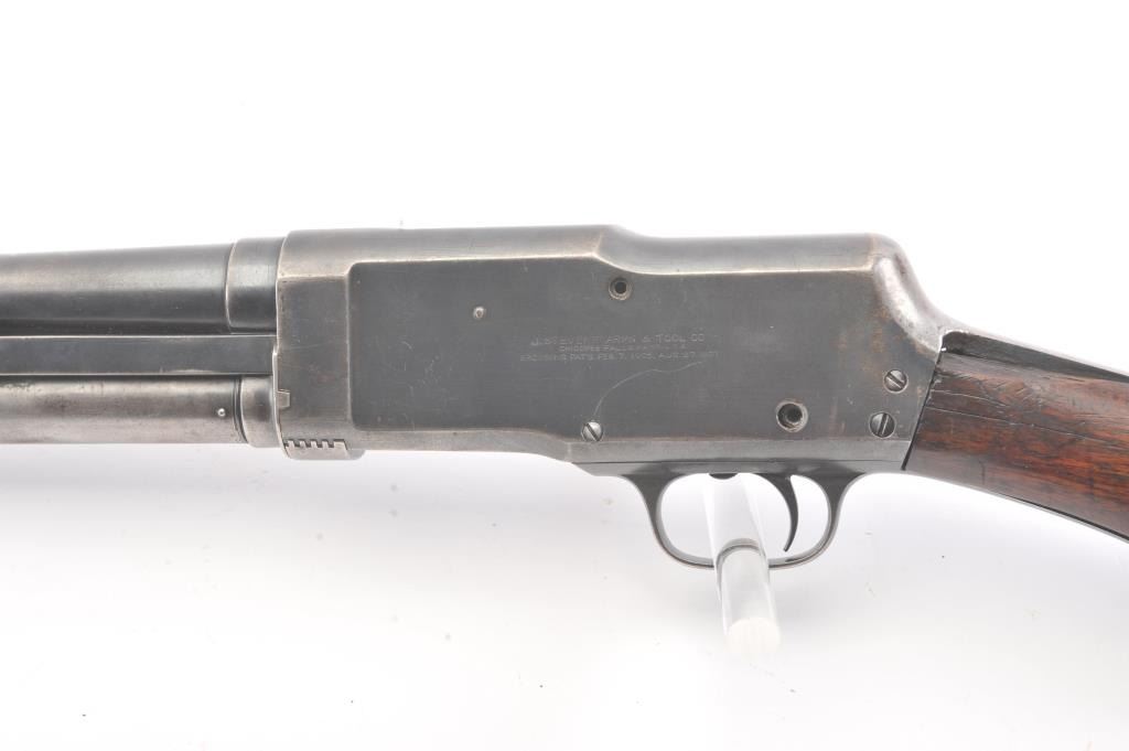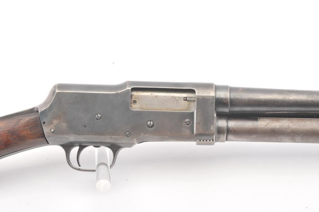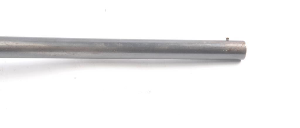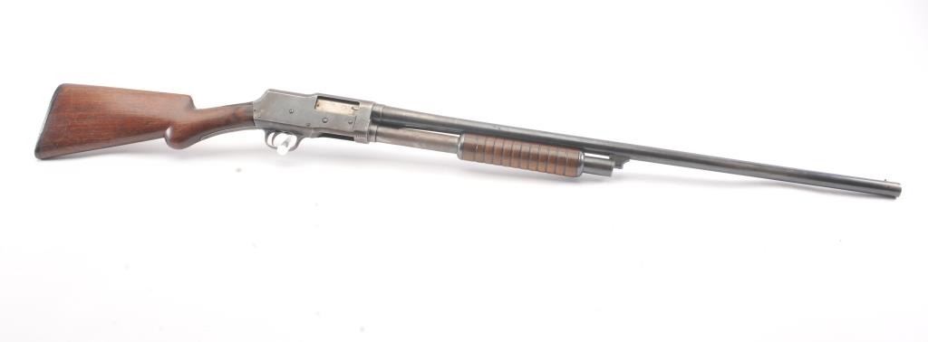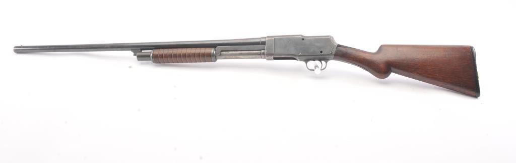 J. Stevens made Browning Patent Pump Action Shotgun in 12 GA with patent date “Feb 7, 1905” and “Aug. 27, 1907”. Barrel measures 30”. Missing small parts and not functioning. The butt stock is broken with wood missing.The metal is clean with some blue and legible markings. Poor overall. (C&R) Est.: $90-$180