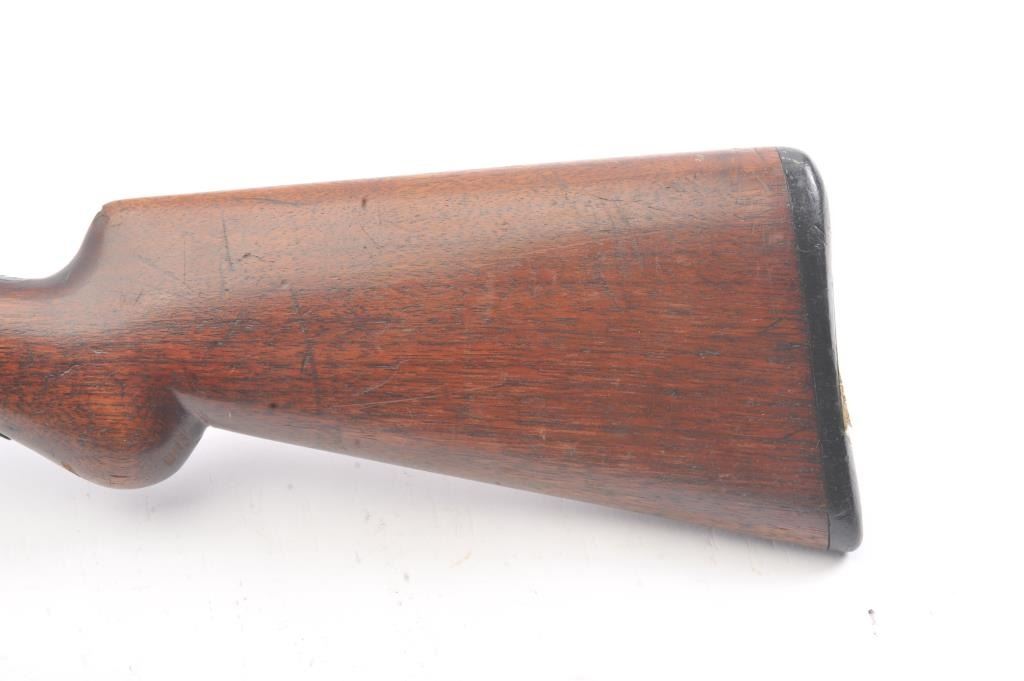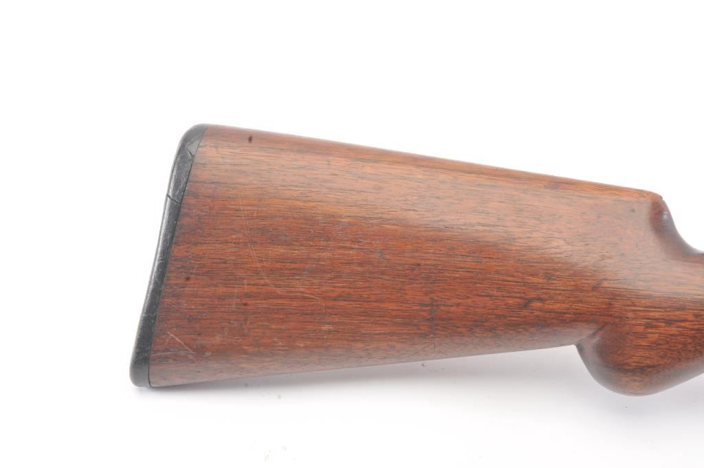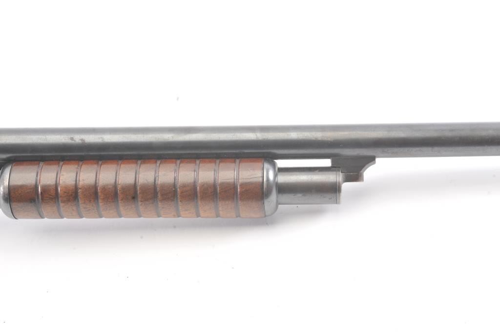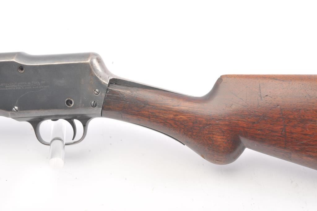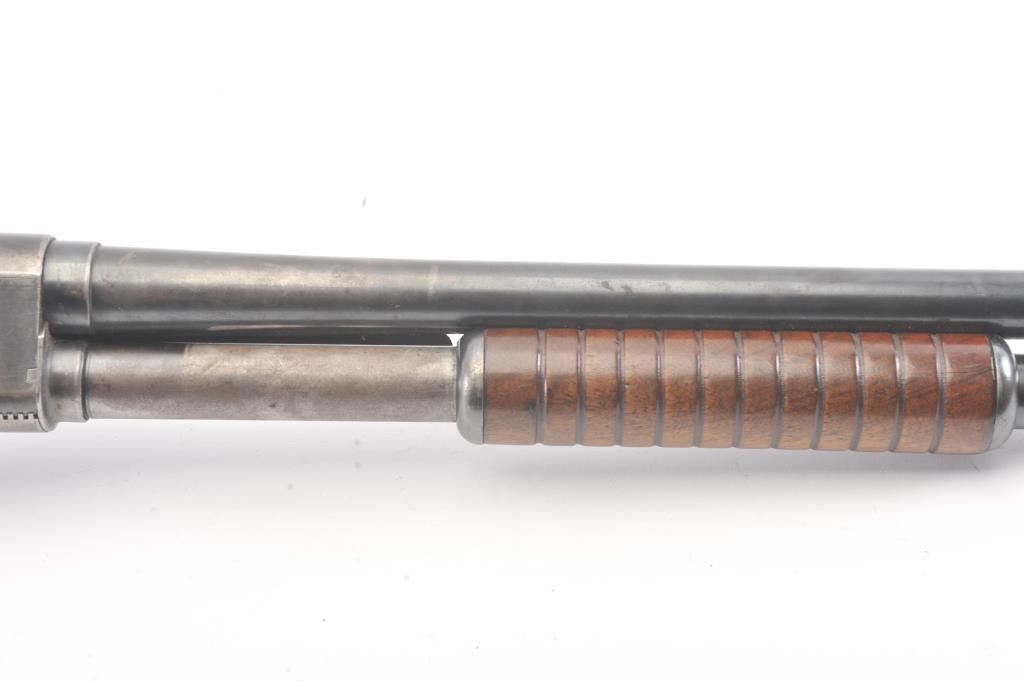 J. Stevens made Browning Patent Pump Action Shotgun in 12 GA with patent date “Feb 7, 1905” and “Aug. 27, 1907”. Barrel measures 30”. Missing small parts and not functioning. The butt stock is broken with wood missing.The metal is clean with some blue and legible markings. Poor overall. (C&R) Est.: $90-$180