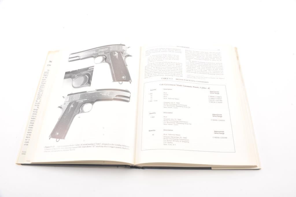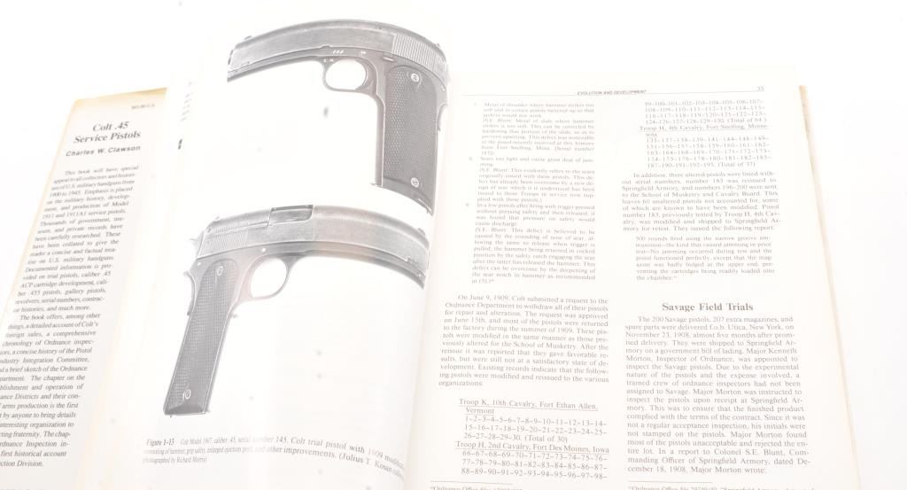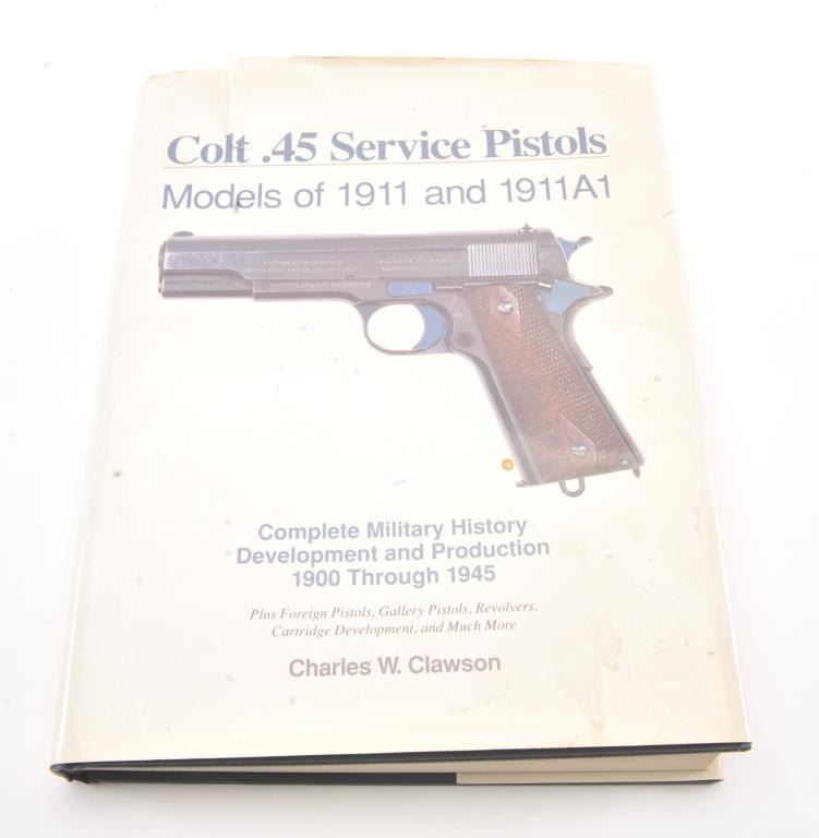 Charles Clawson's "Colt .45 Service Pistols Models 1911 and 1911A1" big book, or commonly known as "The Bible" on .45 automatics. This book gives the breakdown of every part for each military manufacturer from1900-1945. It also gives serial number breakdowns. A must for any serious collector. Very good plus to near fine condition, with dust jacket. Dust jacket is torn and shows some stains, lightdiscoloration and minor damage. Est. $300-600