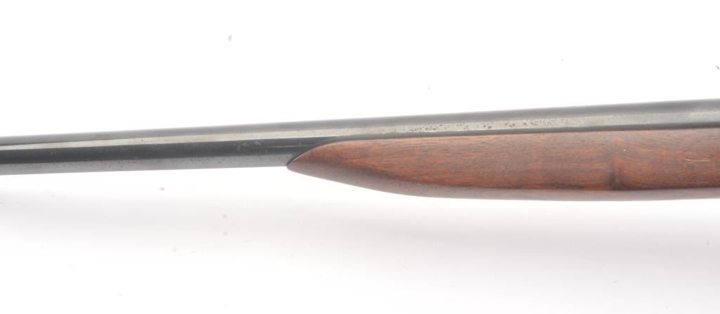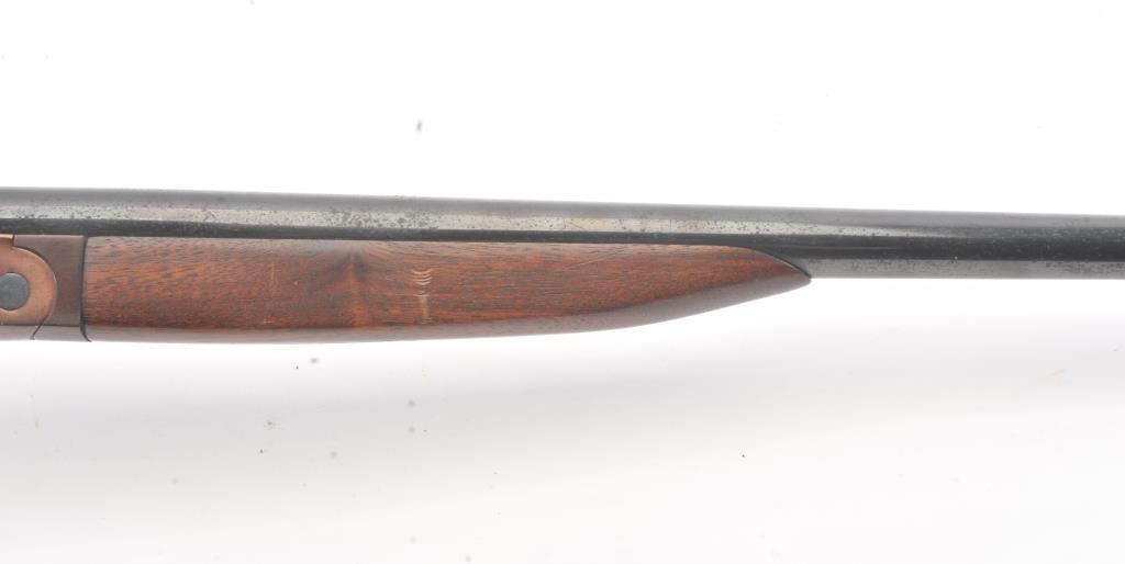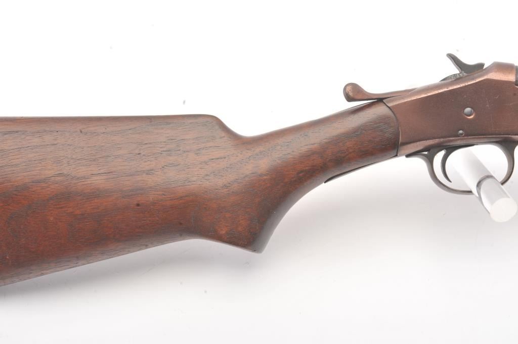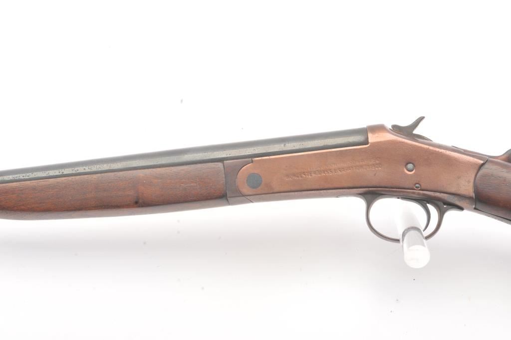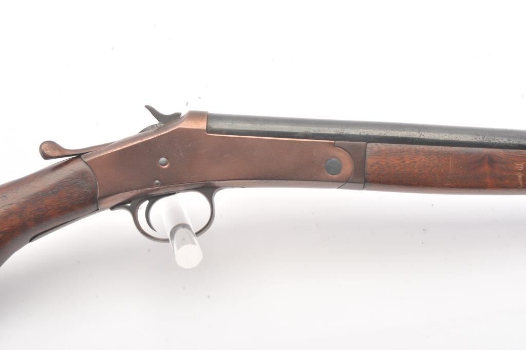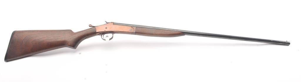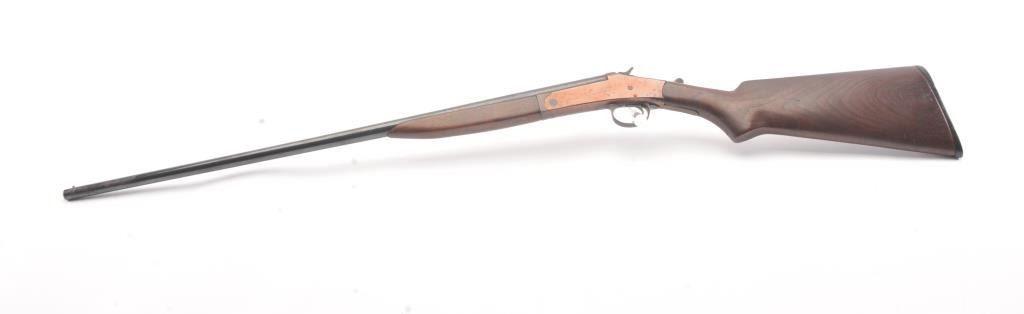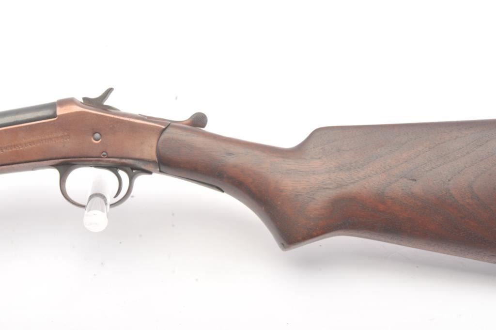 Harrington & Richardson Arms Co. Single Barrel Exposed Hammer Shotgun marked “410-44” caliber and last patent date of 1900. Re-blued with some storage rust near the muzzle. The wood is good and good overall.Mechanically sound with bright bore. Choked cylinder. (C&R) Est.: $125-$250