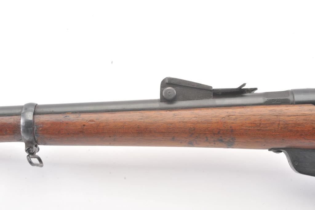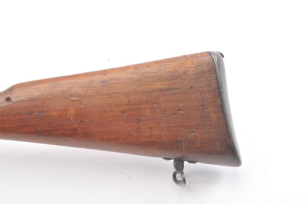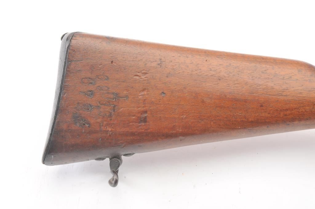 Antique Italian Vetterli Bolt Action Military issue Repeating Rifle with 1877 date and “Torre Annunziata” marking on the breech. Also marked “UY7755”. Most original blue turning to patina with minor surface rust and erosion. The fore end shows old spliced in repair. Otherwise good with many dings, mars, scratches and dings. (Antique) Est.: $150-$300
