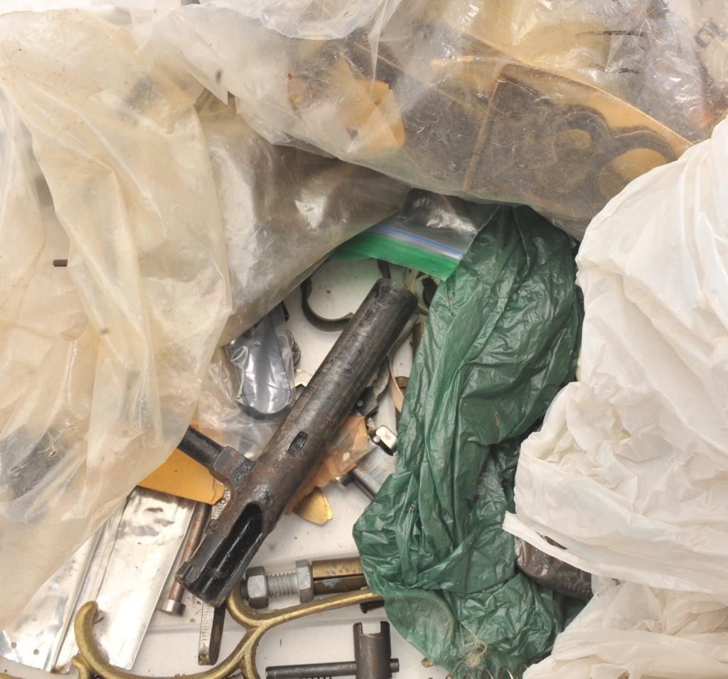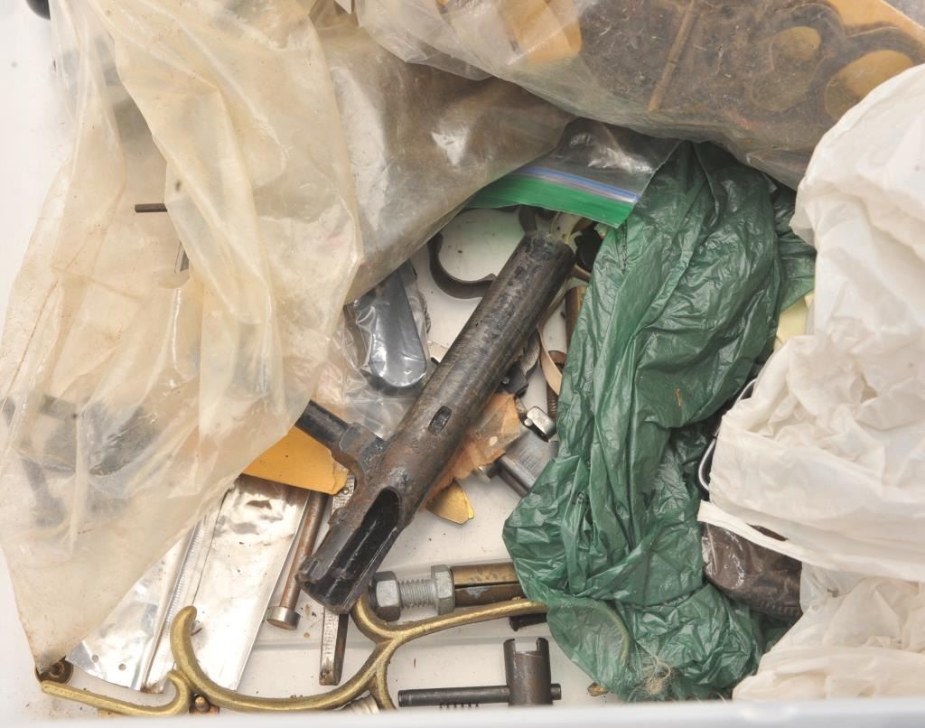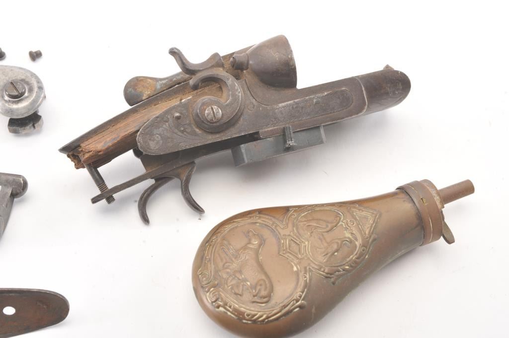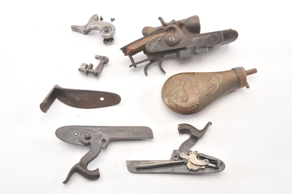 Bonanza lot for the “Tinkerer”, gun Frankenstein or legitimate gunsmiths. Brass castings for muzzle loaders unfinished, bolts, bands, small parts, spring screws, pair of Mortimer percussion large size locksfor fowler in 10-12 GA size, 5 ¼” plates and other misc. parts including .45 Dixie muzzleloader barrel in near fine condition. Est.: $150-$300