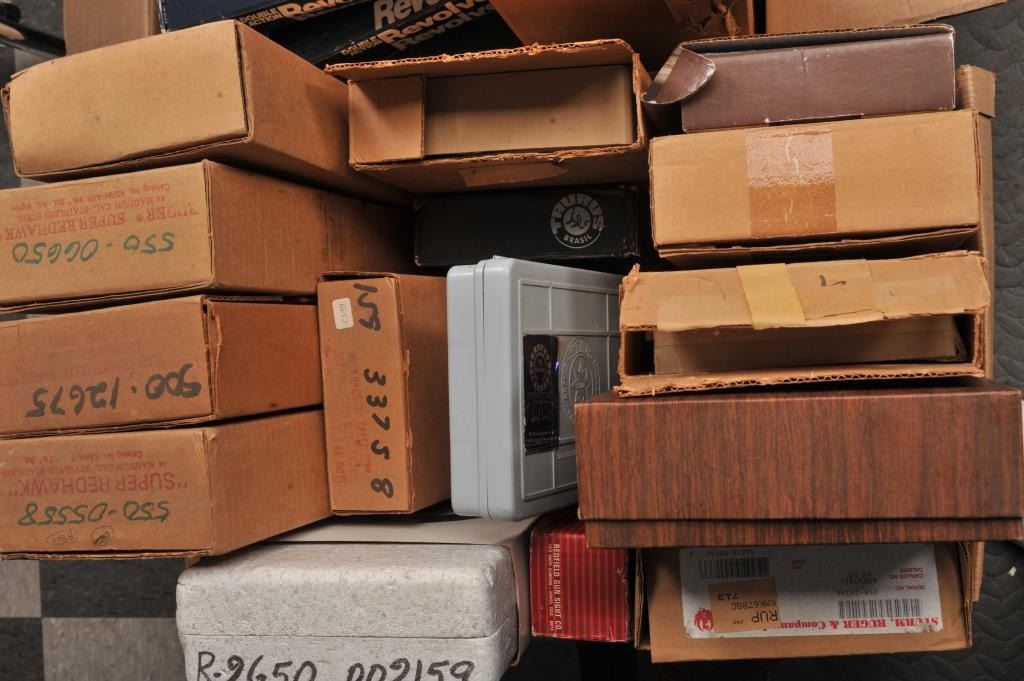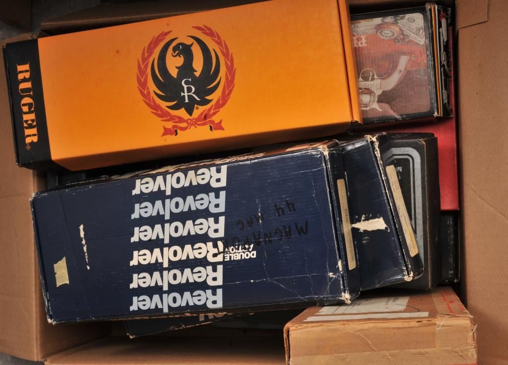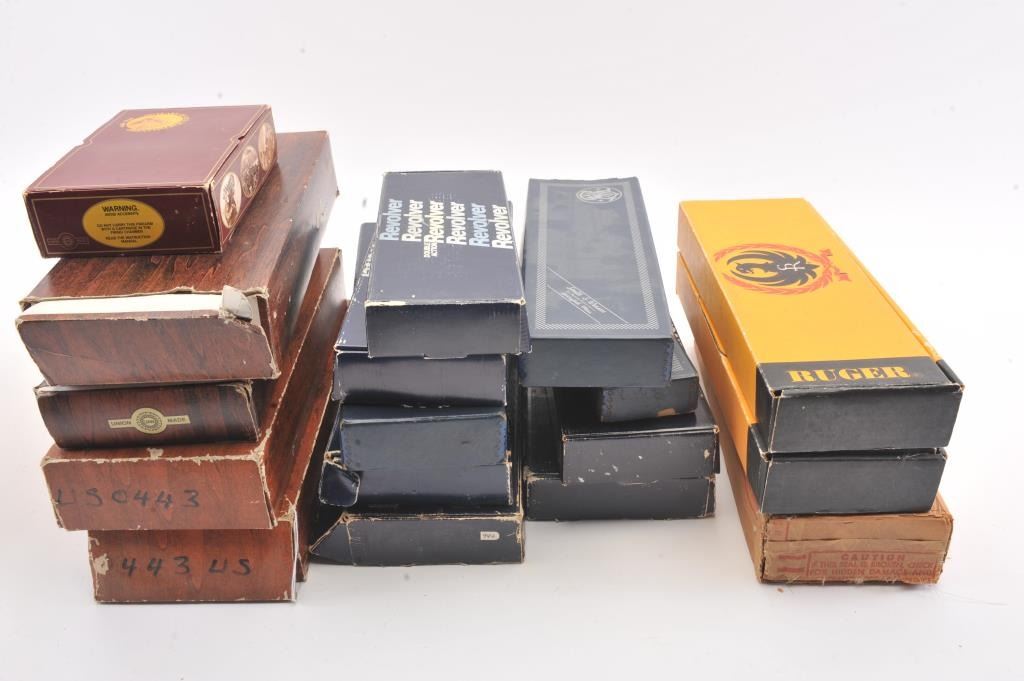 Lot of gun boxes from 1970s to current. Colt, Ruger, S&W, and various contemporary makers. 75+ total. Good to almost fine. A couple of goodies. Adds value to any gun that is correct to specs. Est.: $150-$300
