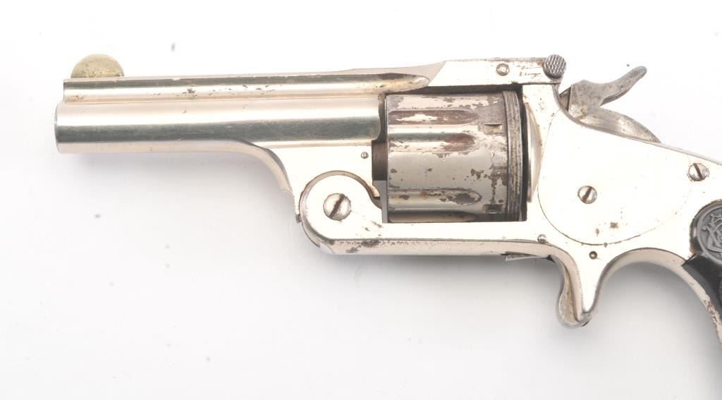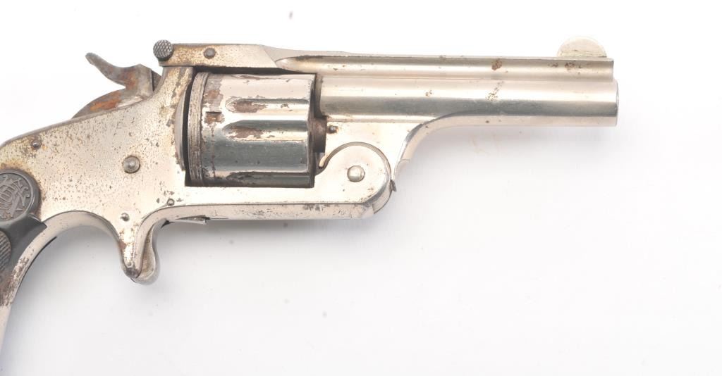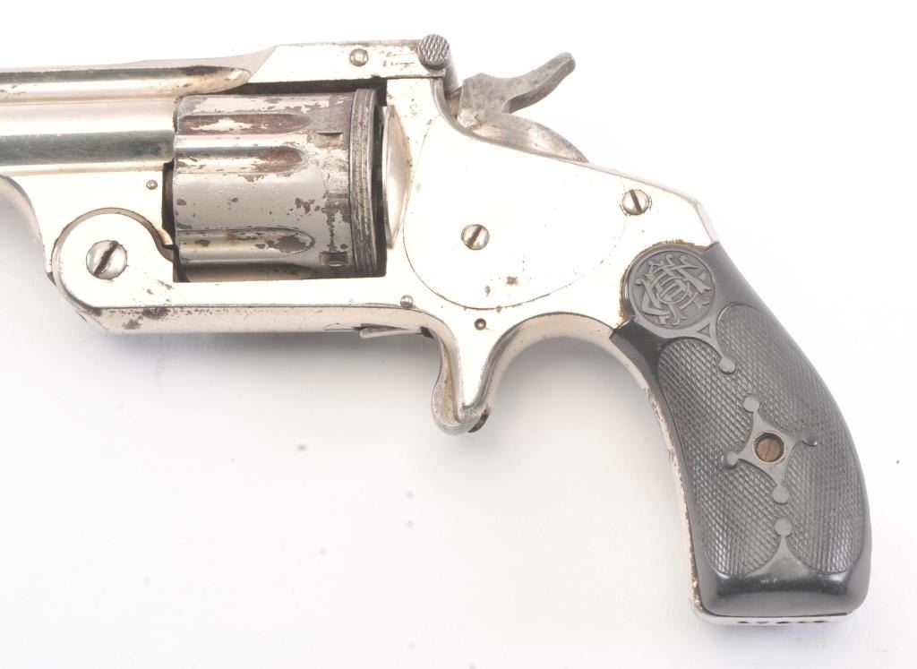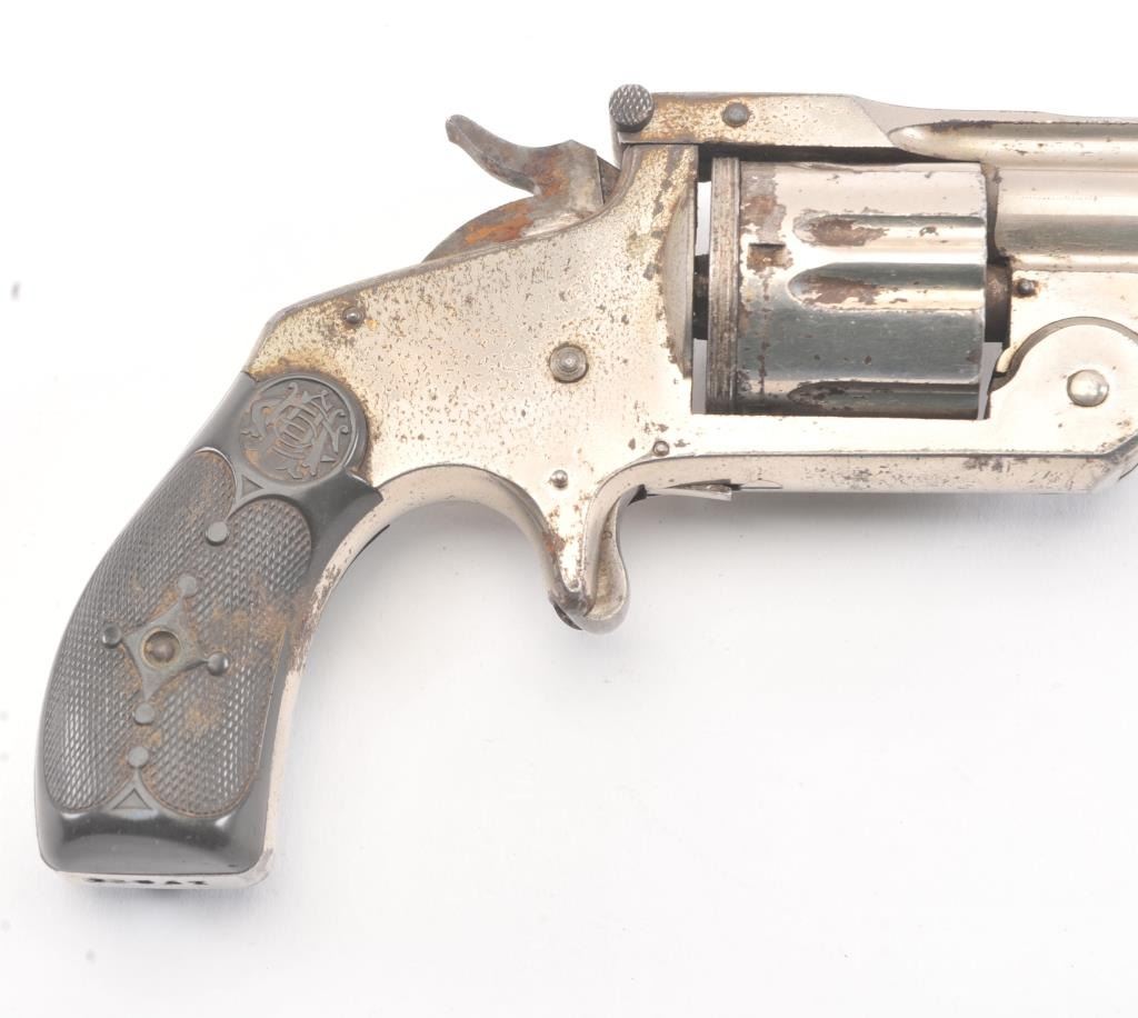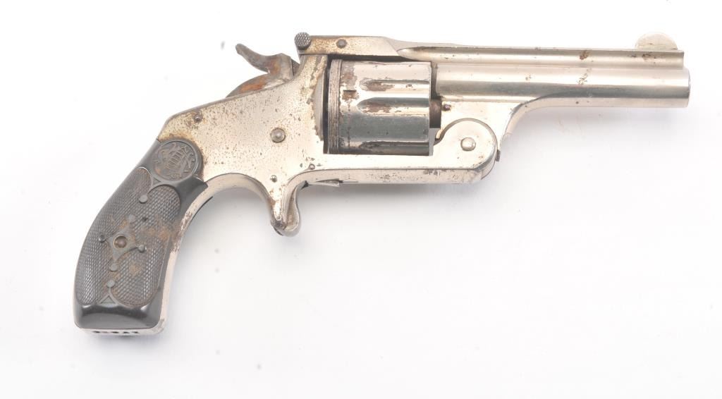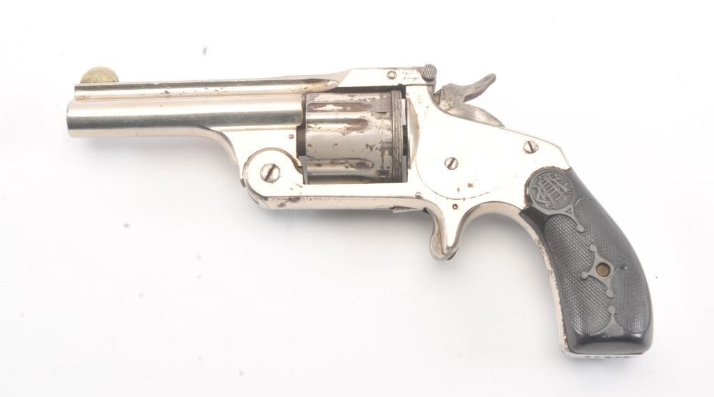 American Arms Co. (Boston, Mass.) single action revolver in .32 S&W centerfire caliber with last patent date of 1882, S/N 17086. Very good condition showing 75%-85% original nickel with some erosion and pitting juststarting mostly on the cylinder and right side of the frame. The grips are very good. The markings are clear and sharp. Not revolving. The bore is fair to good. (Antique) Est.: $150-$300