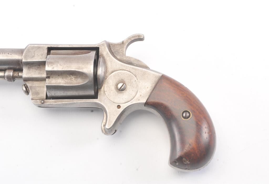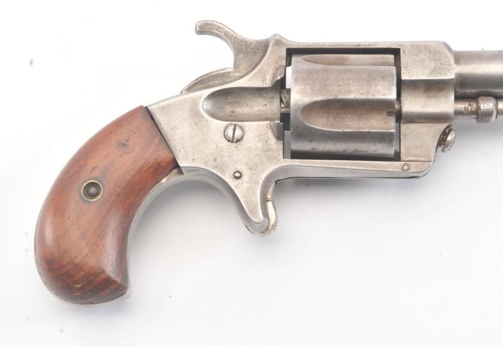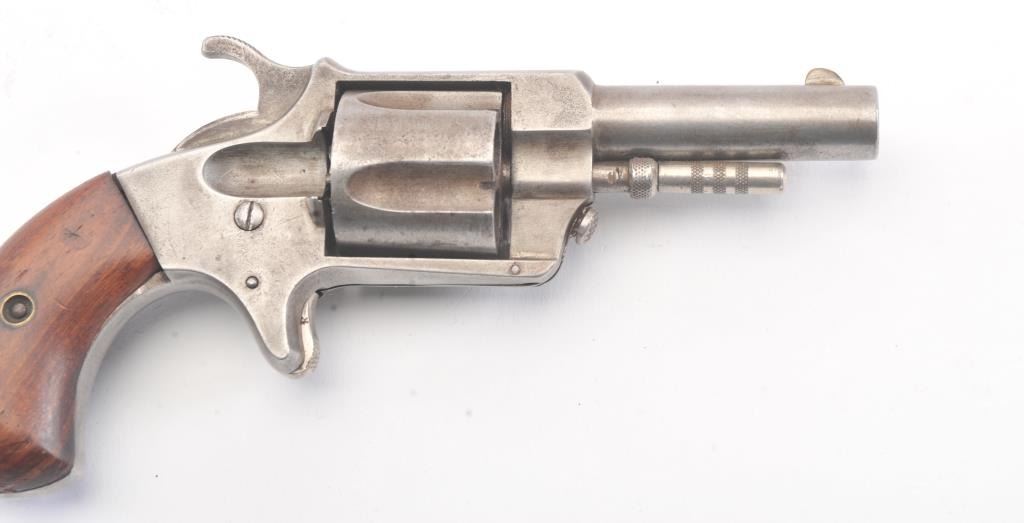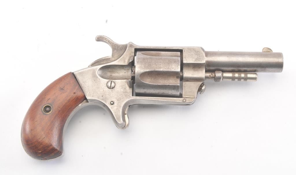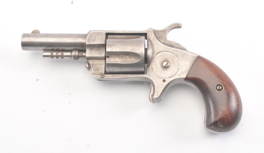 Empire patent “Nov. 21, 1871” .38 rimfire revolver by J. Rupertus Phila., S/N 13058 with a gray patina finish, wood grips and in good overall condition. Five shot fluted cylinder. A very scarce American spur trigger revolver of the frontier era that is seldom seen. (Antique) Est.: $300-$600